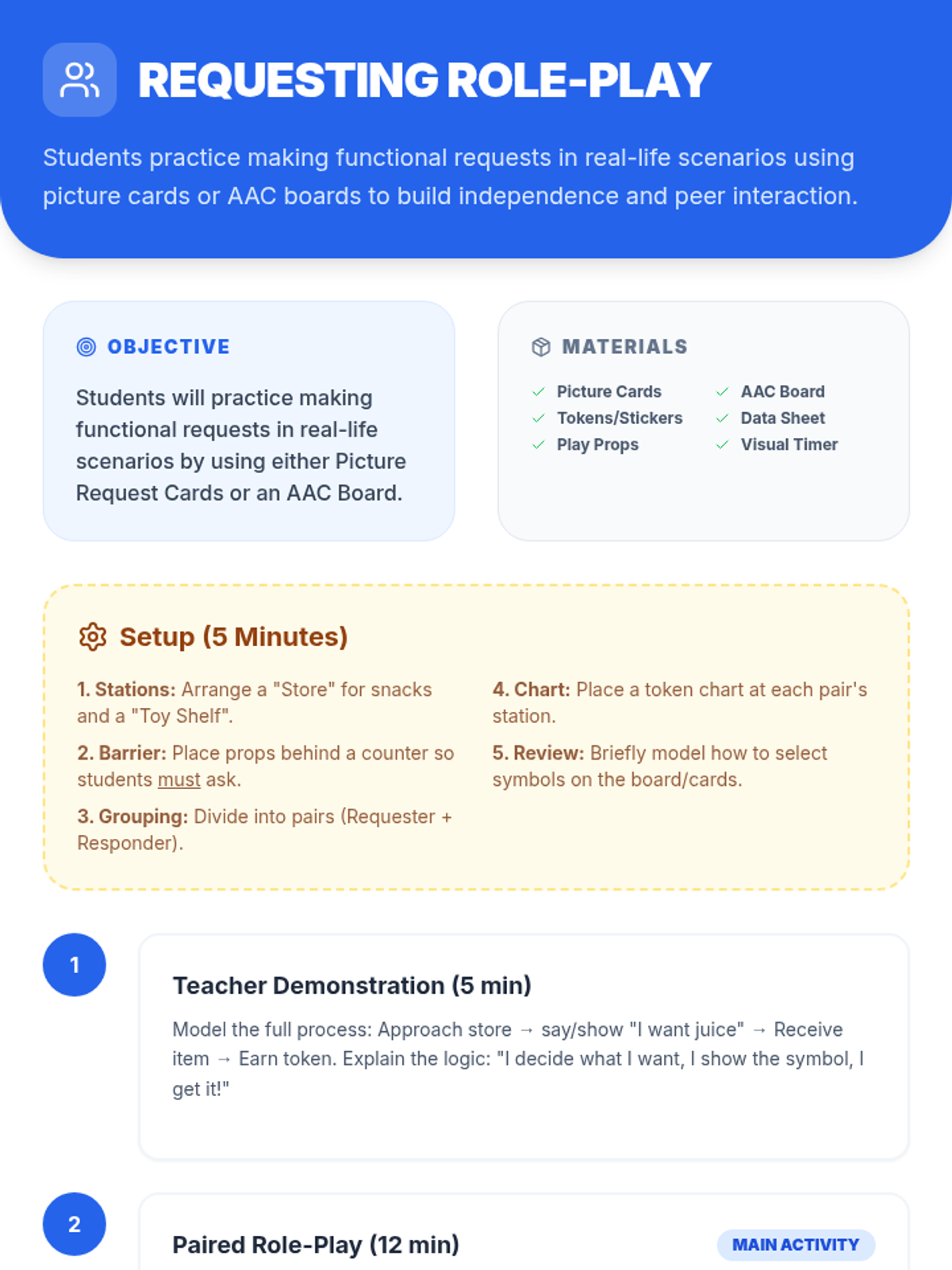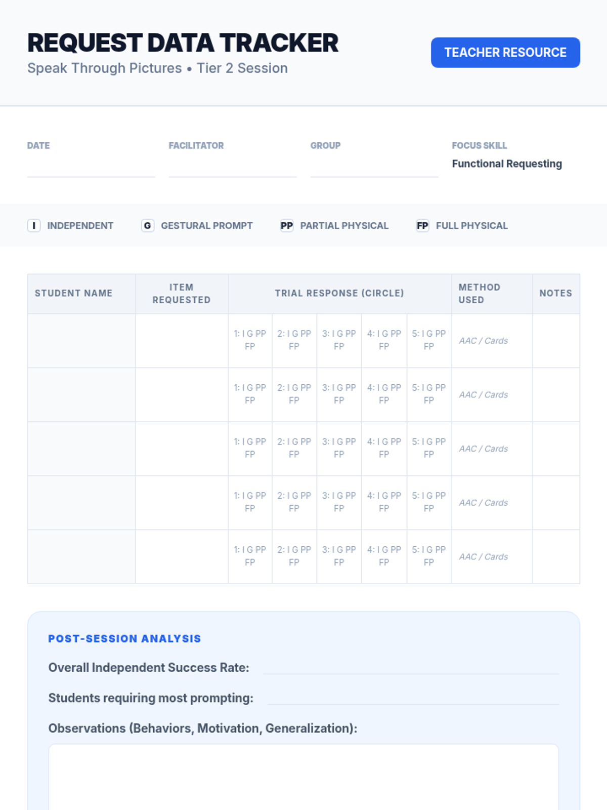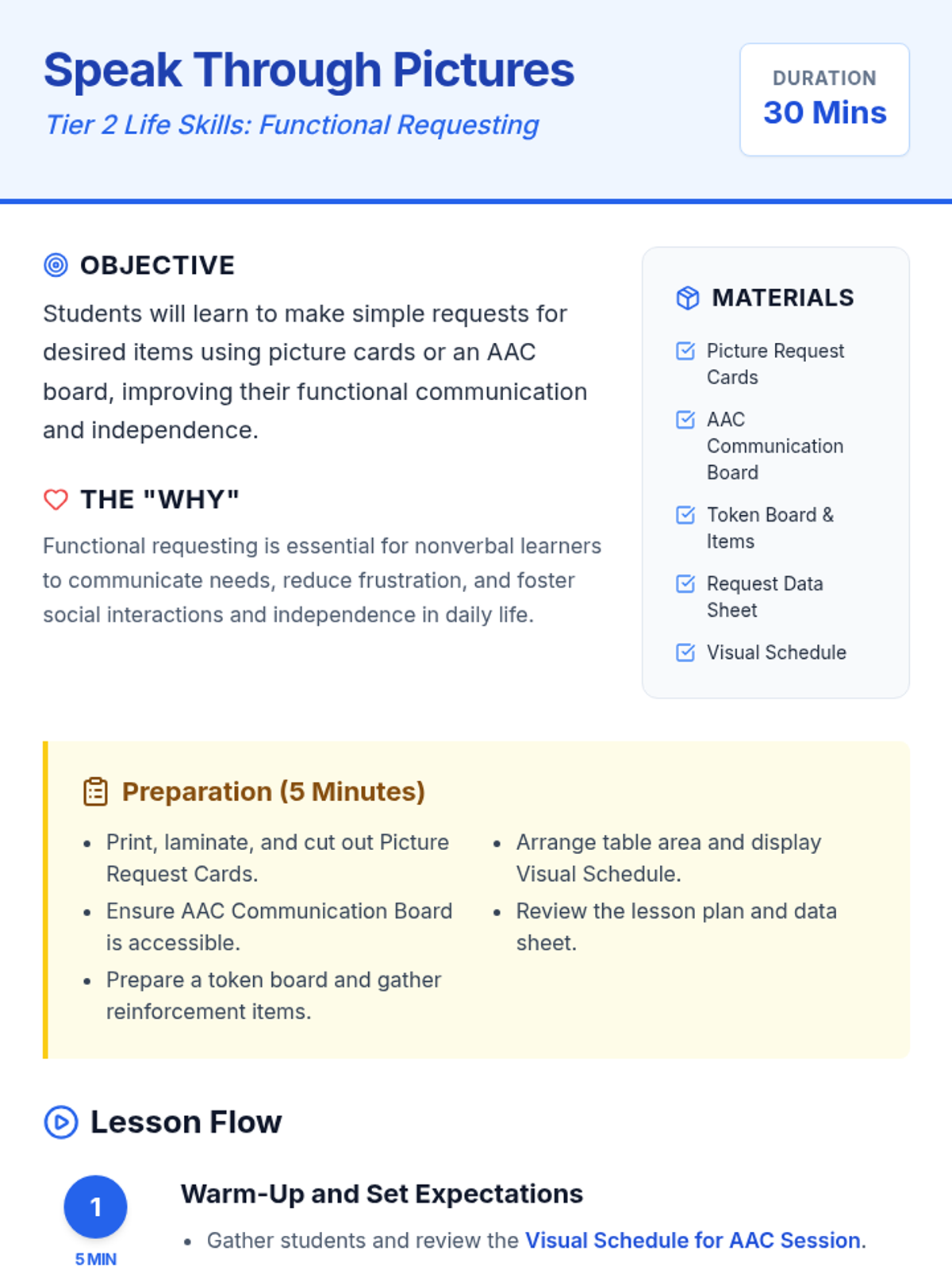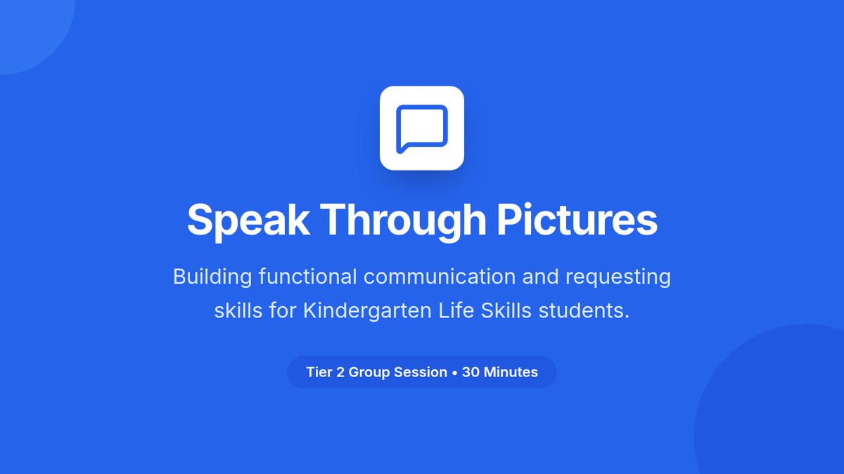 A 30-minute Tier 2 group session for kindergarten life skills students focusing on functional communication through picture cards and AAC boards. Students practice making requests to build independence and reduce frustration.
