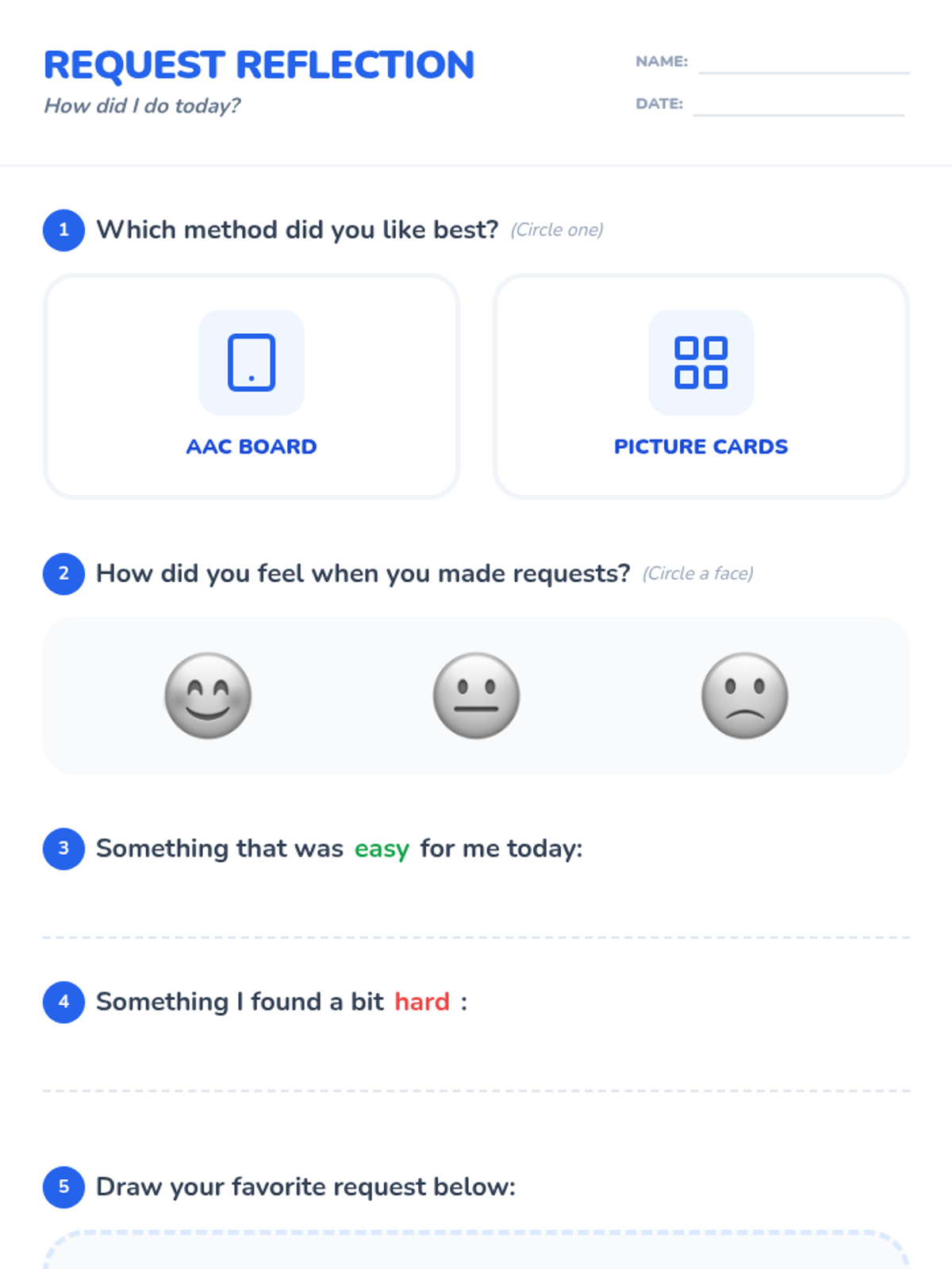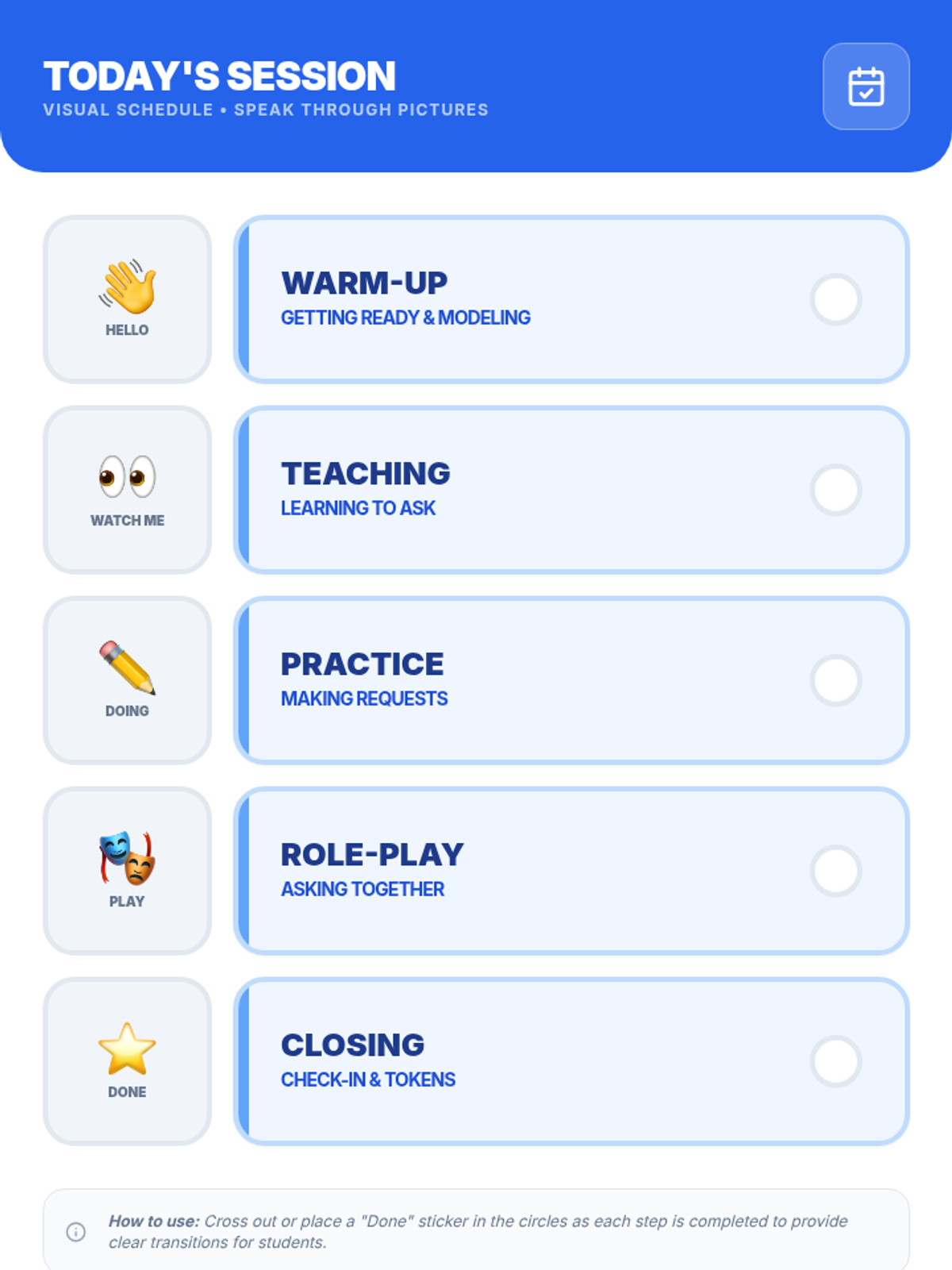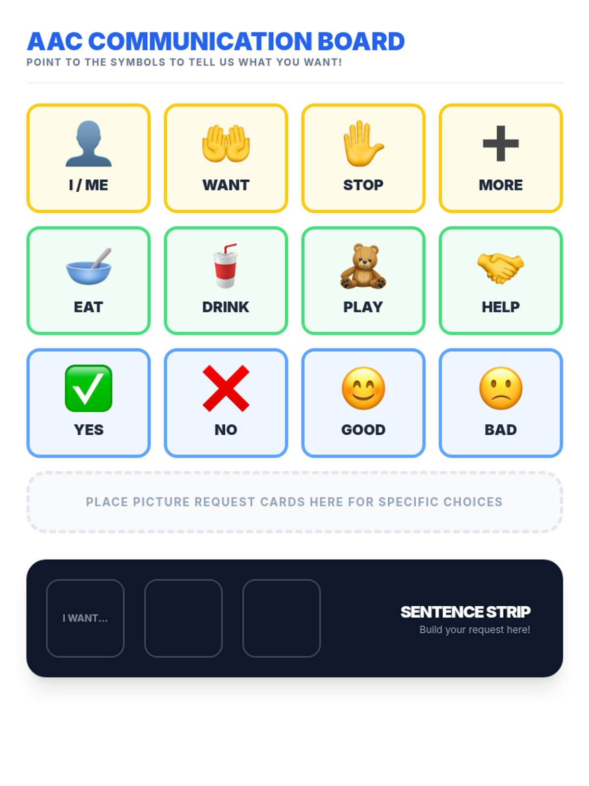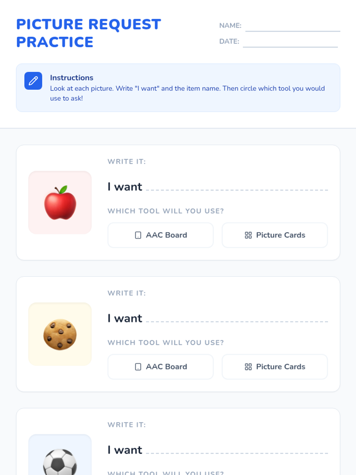 A 30-minute Tier 2 group session for kindergarten life skills students focusing on functional communication through picture cards and AAC boards. Students practice making requests to build independence and reduce frustration.