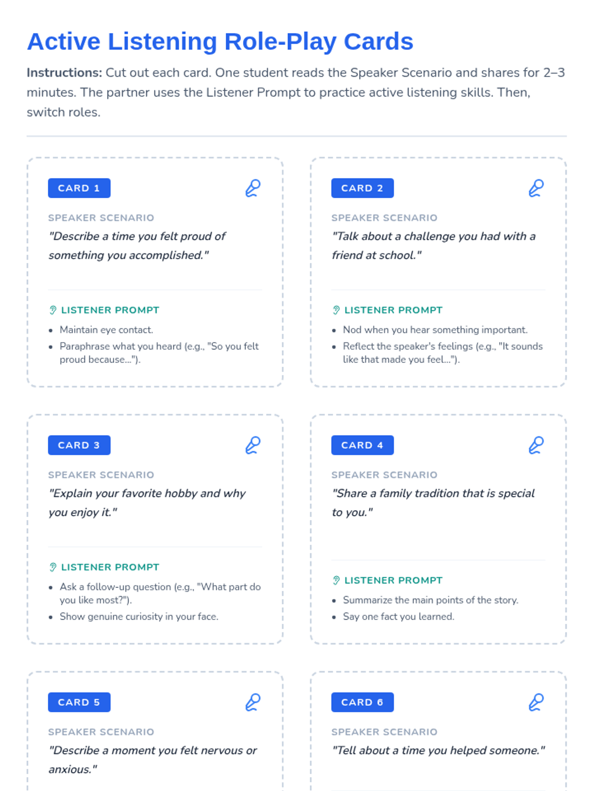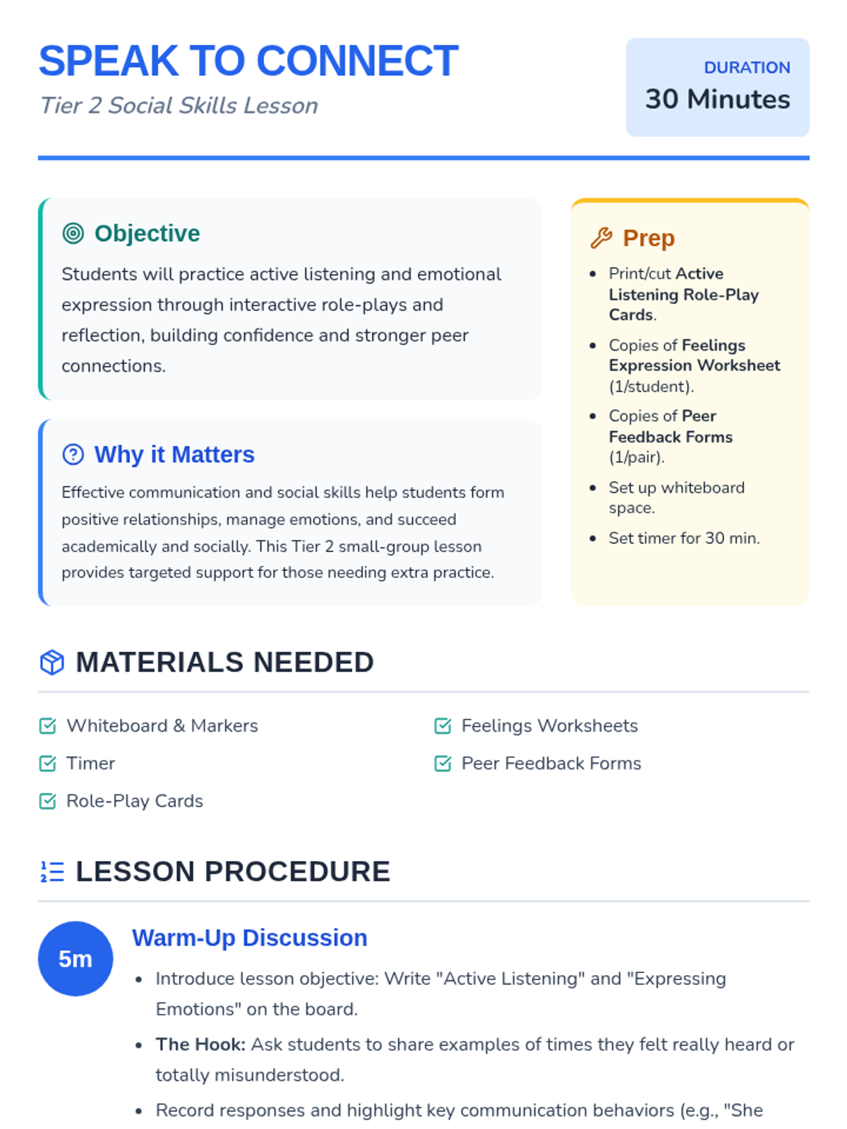 A 30-minute Tier 2 group session for 6th graders to practice active listening and emotional expression through role-plays and reflection.