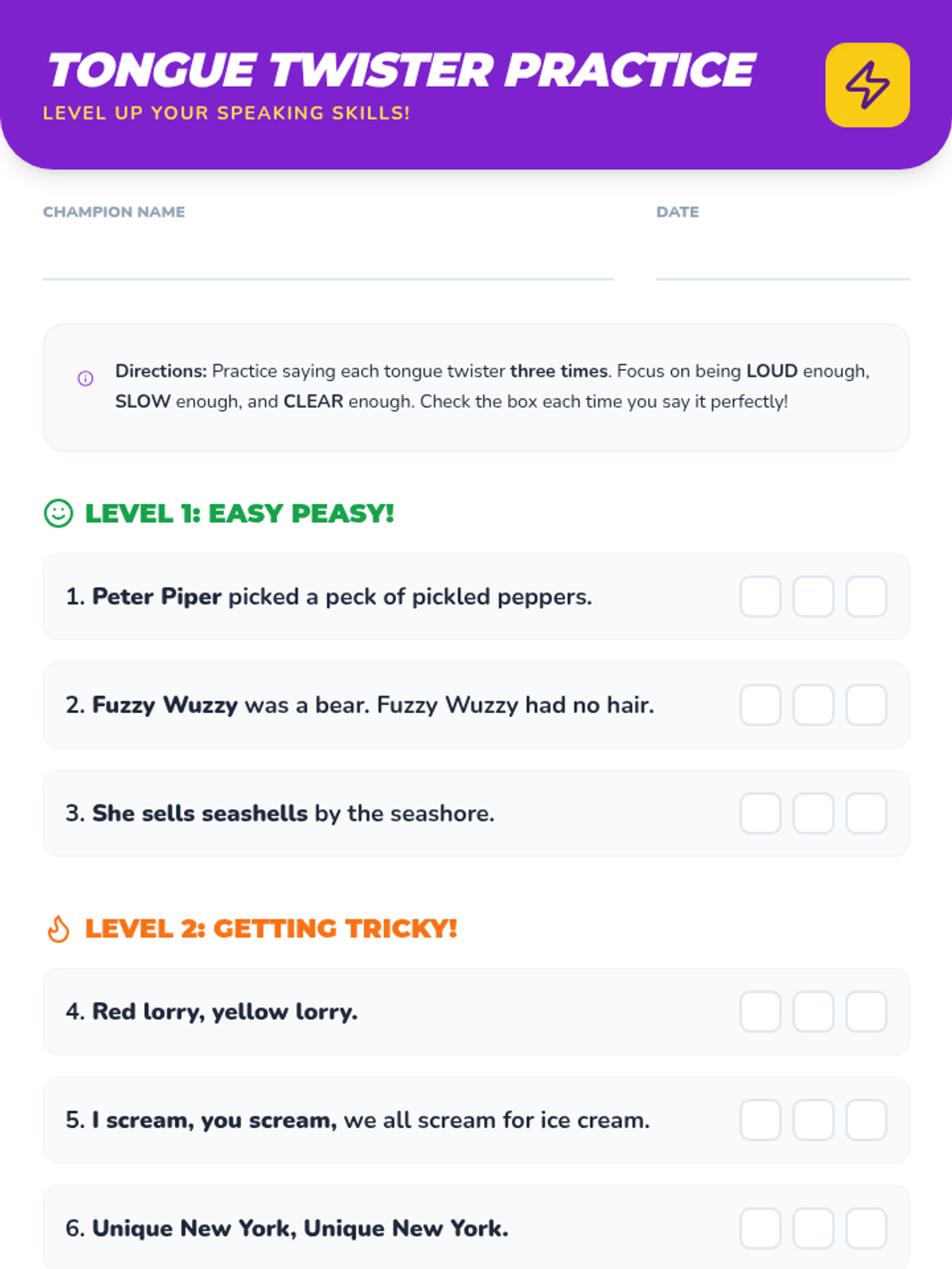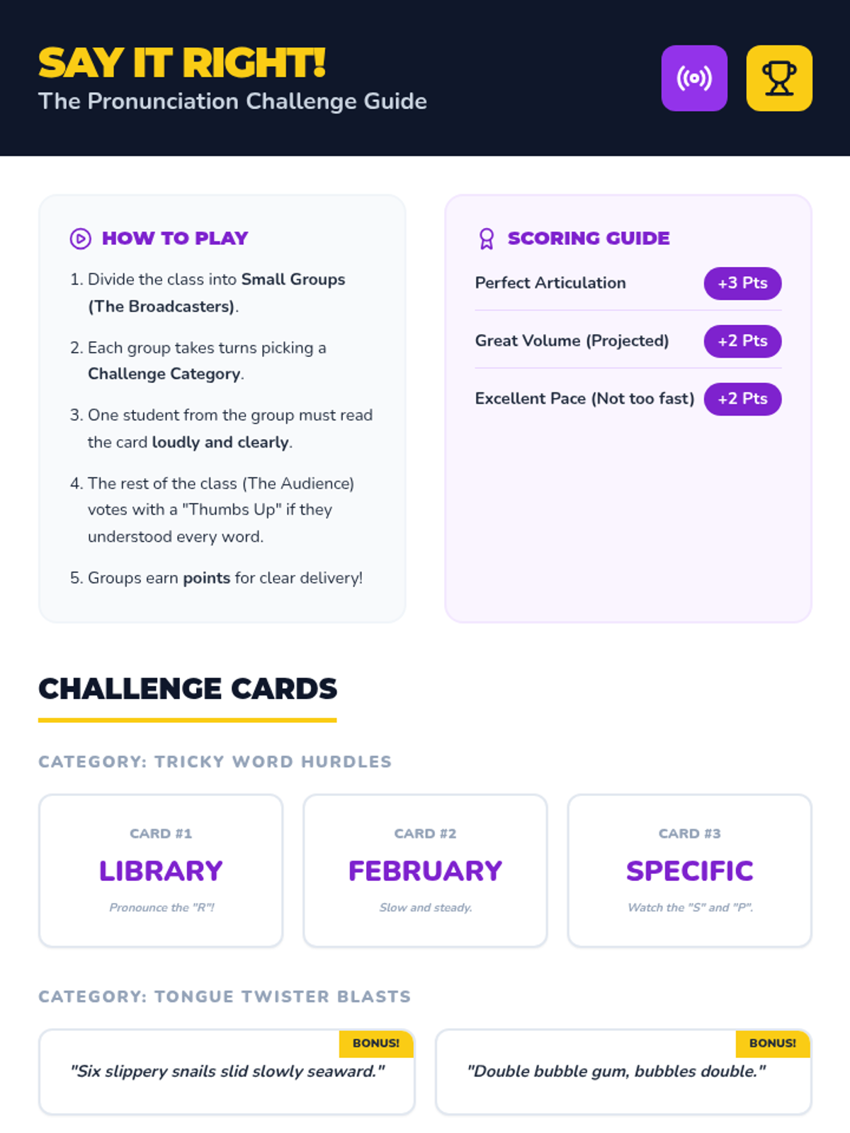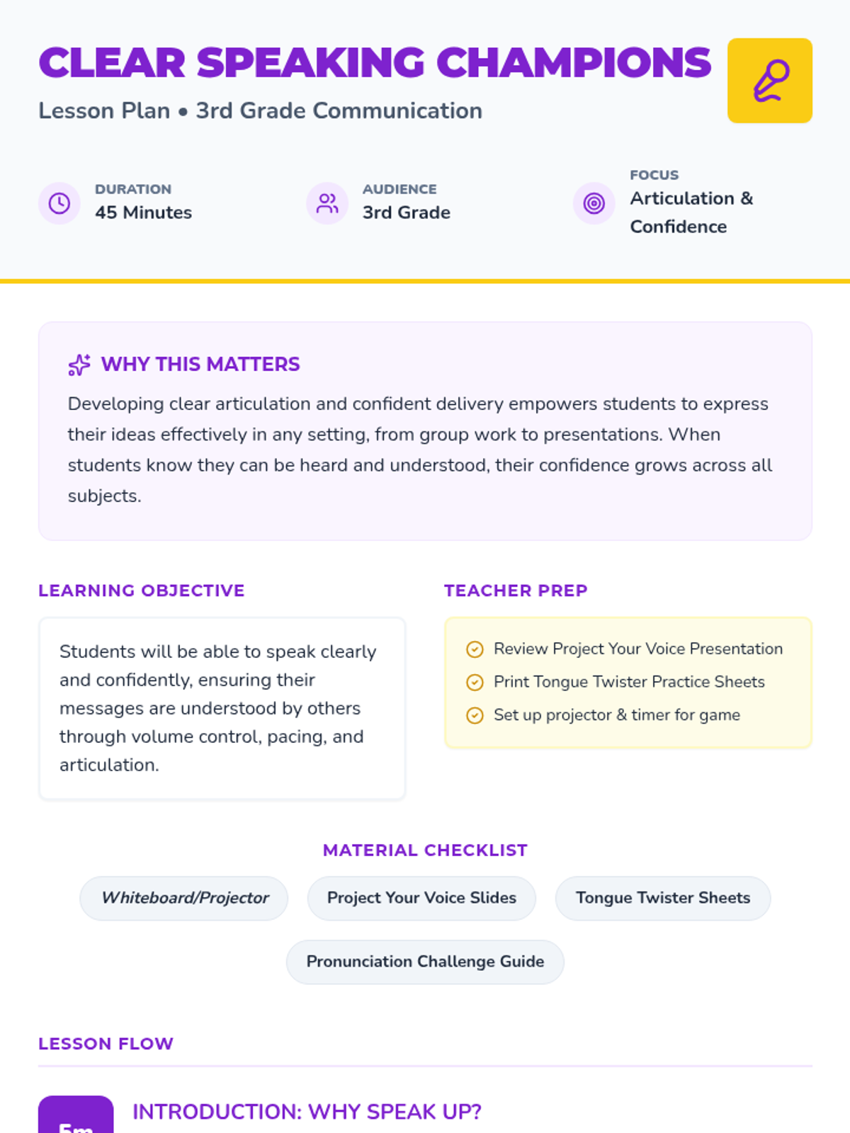A fun, interactive lesson designed to help 3rd graders develop clear articulation, confident volume, and appropriate pacing for effective communication. Students will practice through vocal warm-ups, tongue twisters, and a pronunciation game.