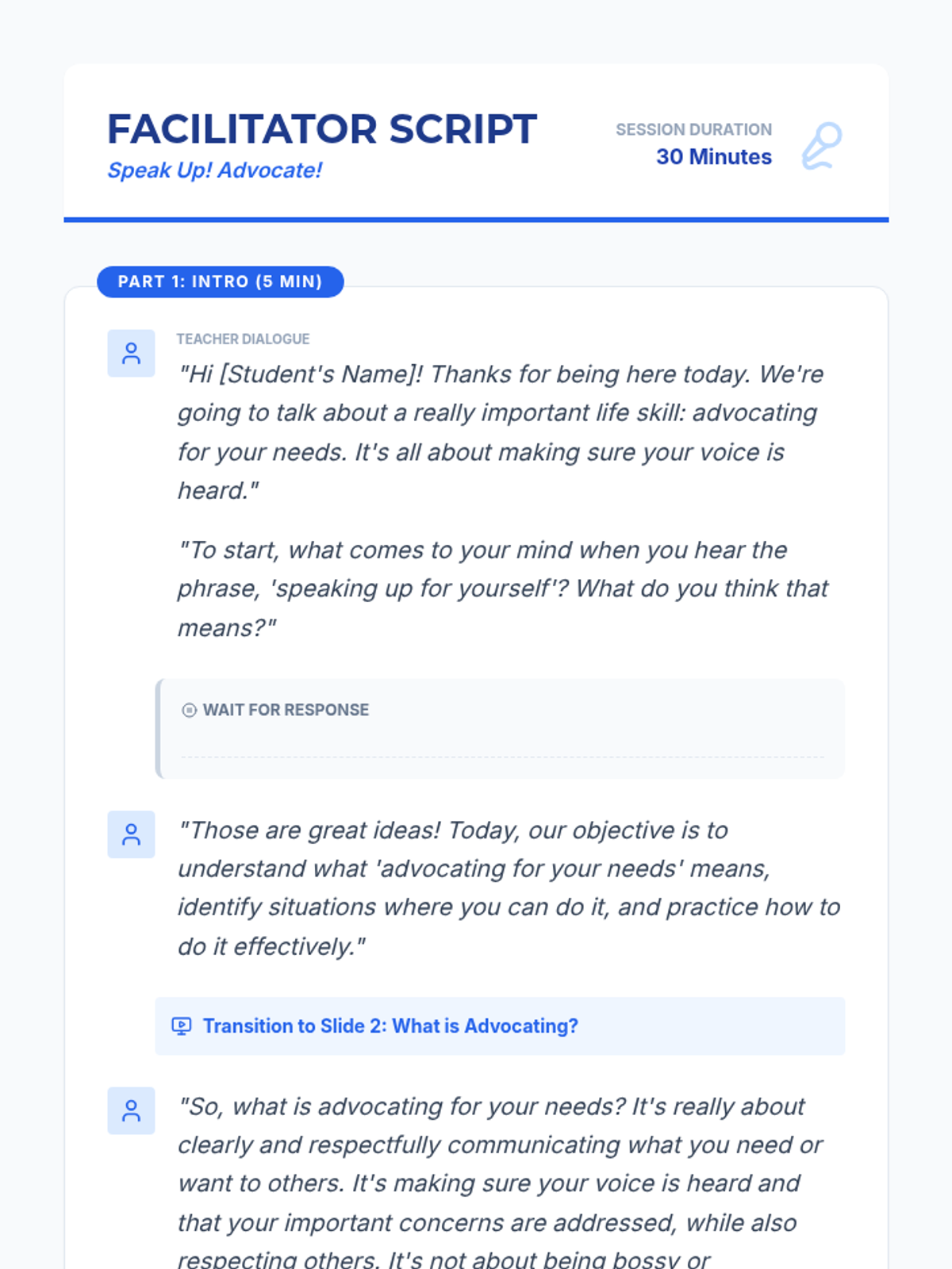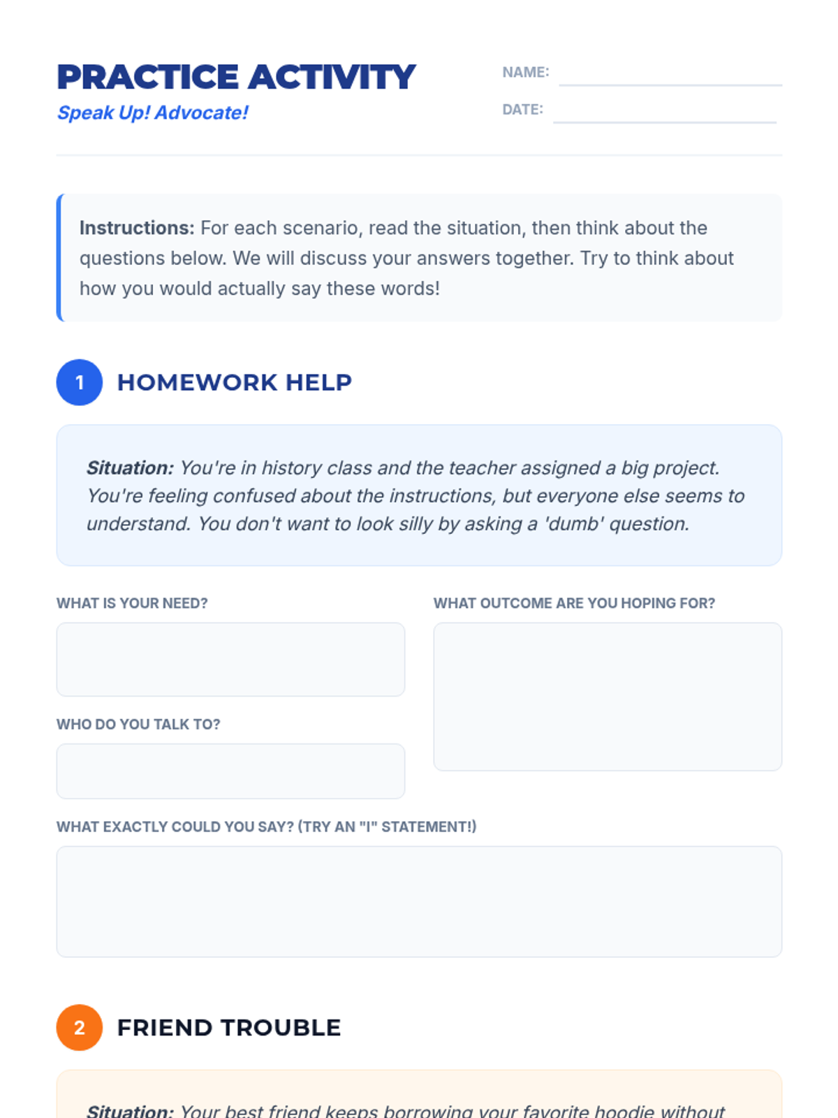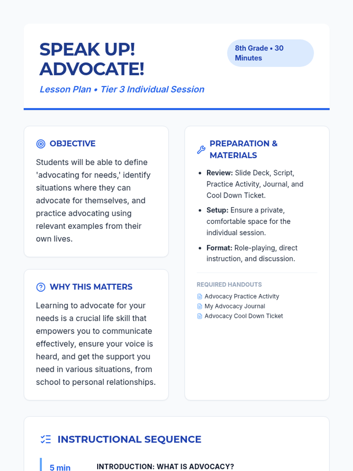 This individual Tier 3 lesson empowers an 8th-grade student to understand, identify, and practice self-advocacy in various real-life contexts like school, home, and friendships. Through guided discussion and scenario-based practice, the student builds the confidence to communicate their needs respectfully and effectively.