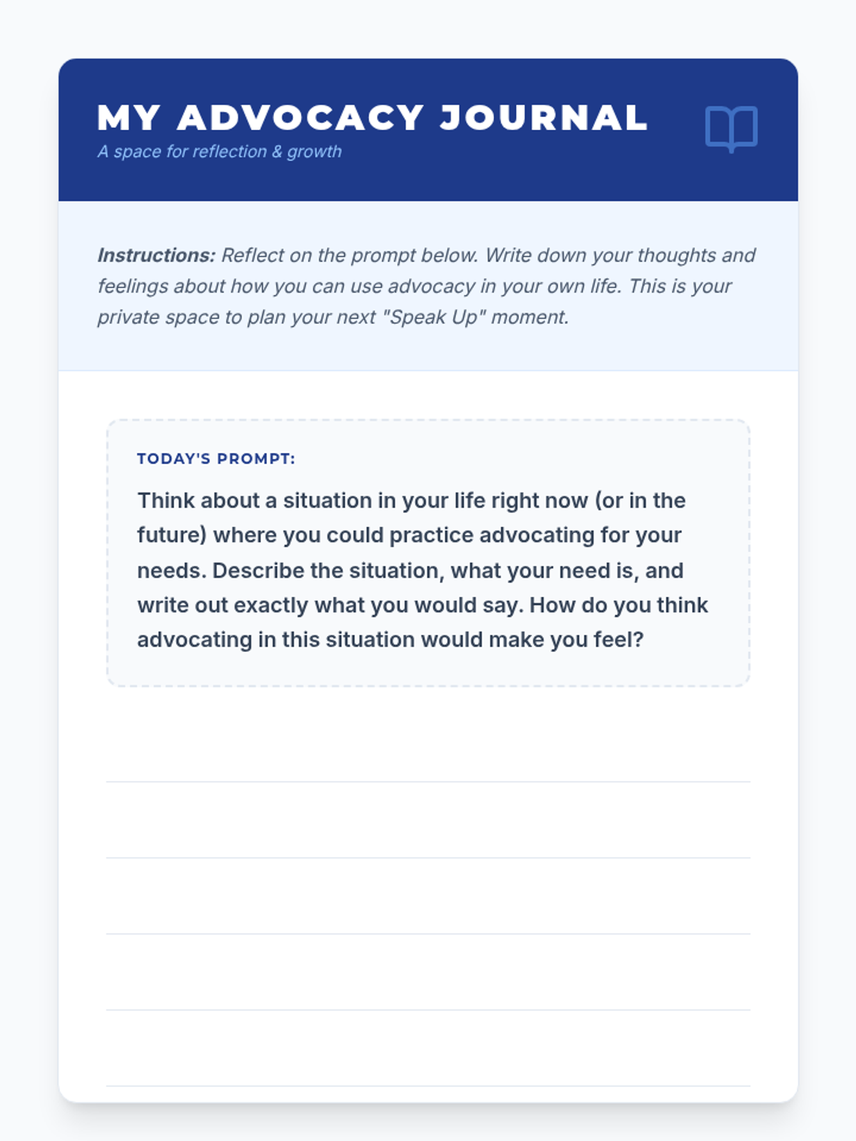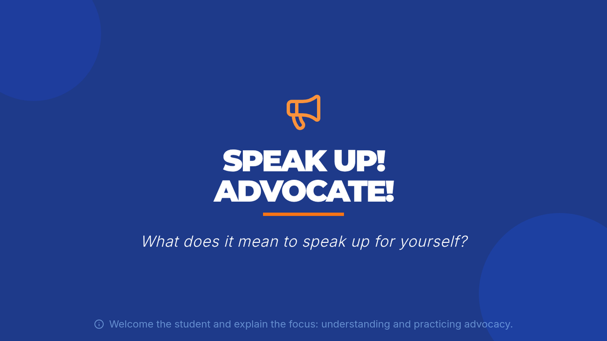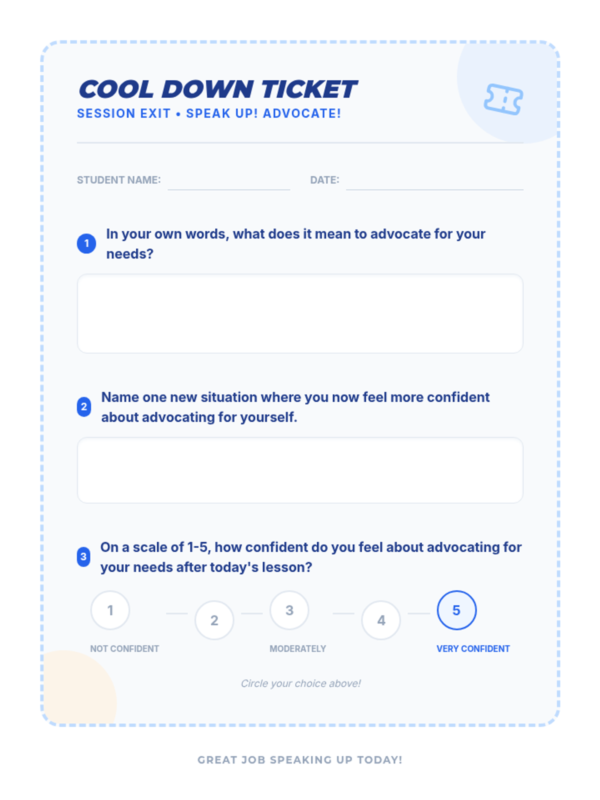 This individual Tier 3 lesson empowers an 8th-grade student to understand, identify, and practice self-advocacy in various real-life contexts like school, home, and friendships. Through guided discussion and scenario-based practice, the student builds the confidence to communicate their needs respectfully and effectively.