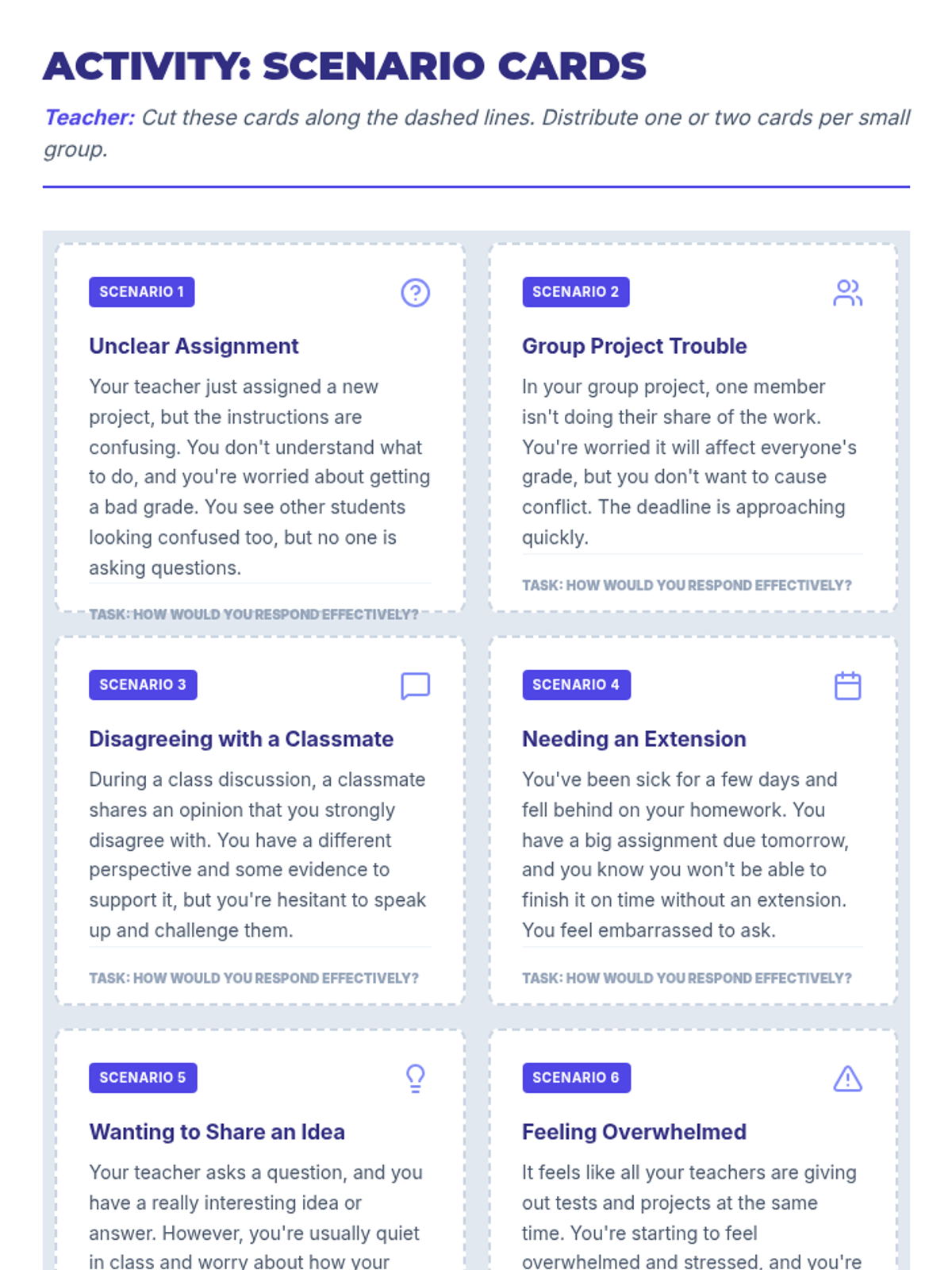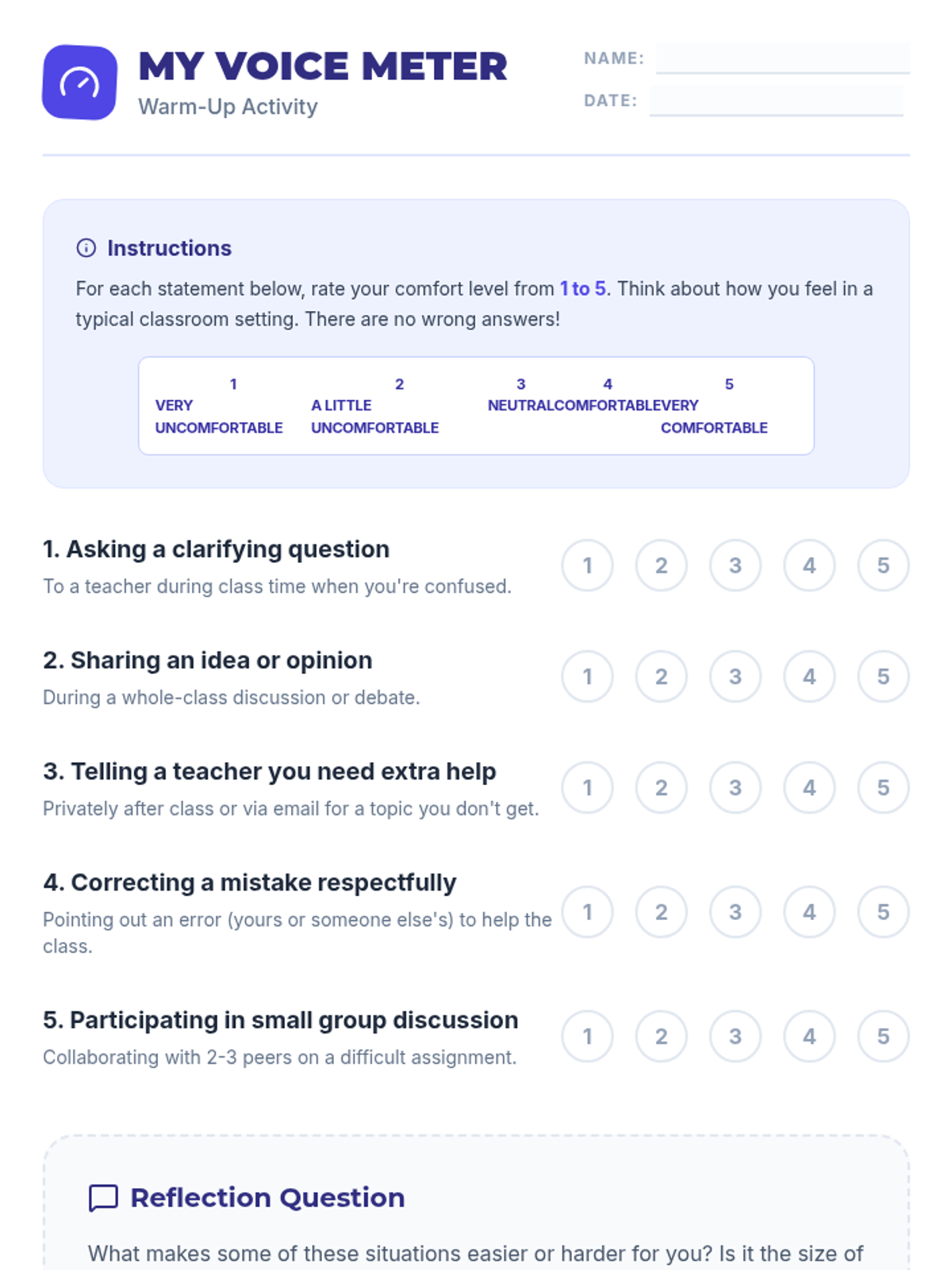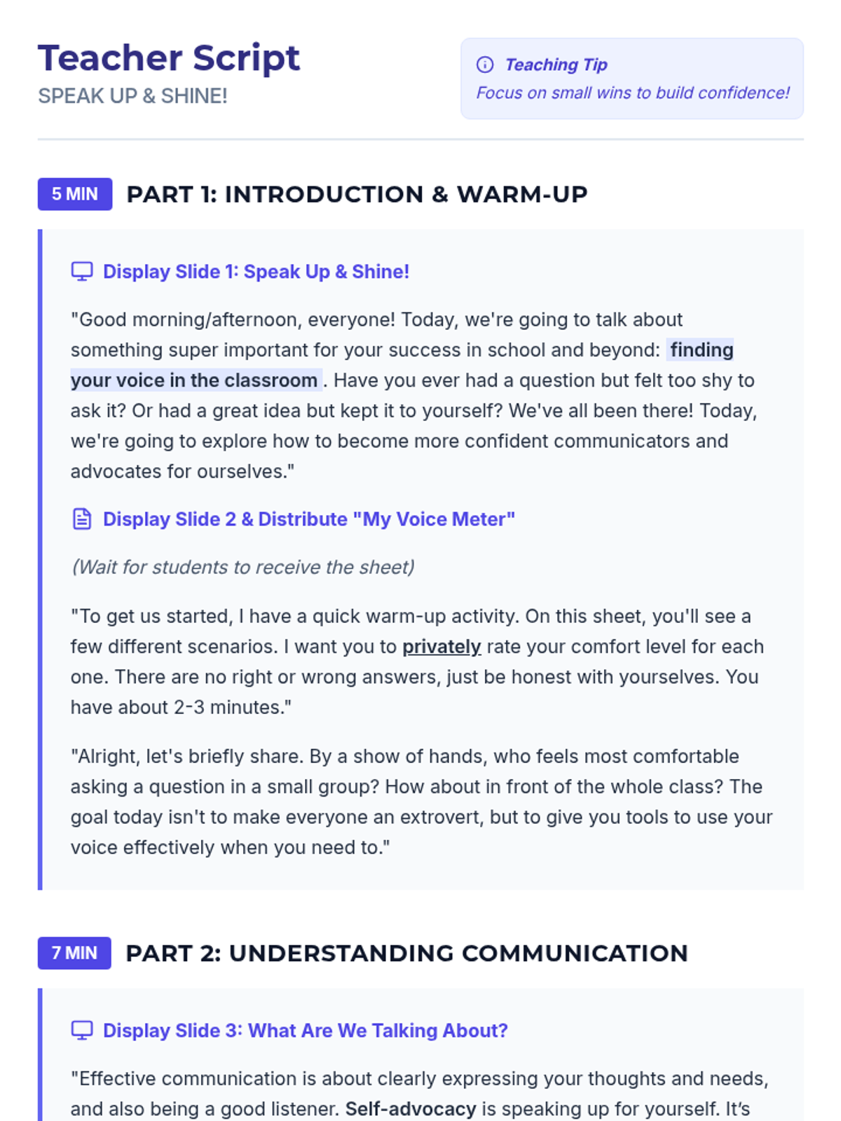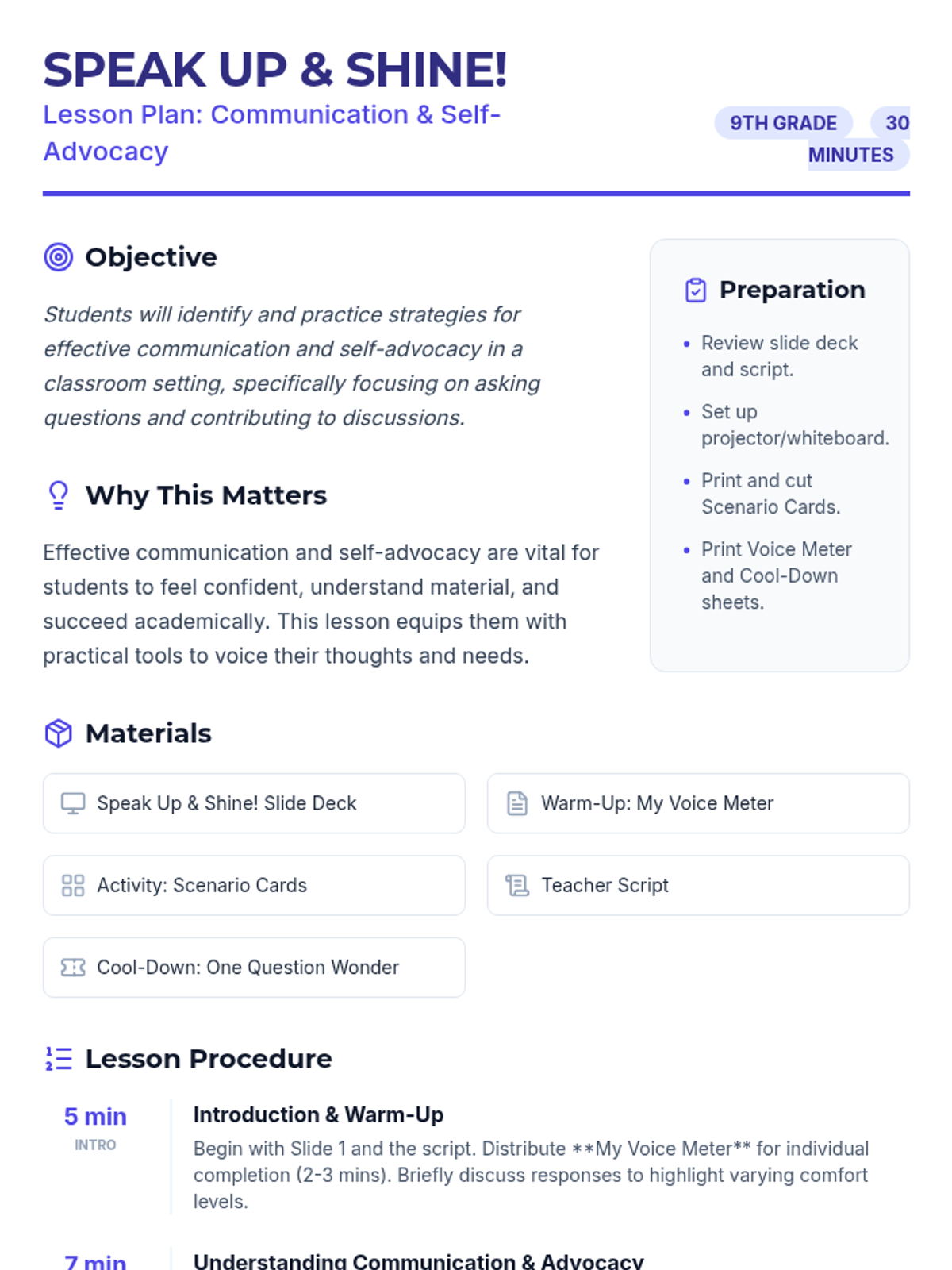 A 30-minute interactive lesson for 9th-grade students focused on building confidence in communication and self-advocacy through self-reflection, discussion, and role-playing scenarios.
