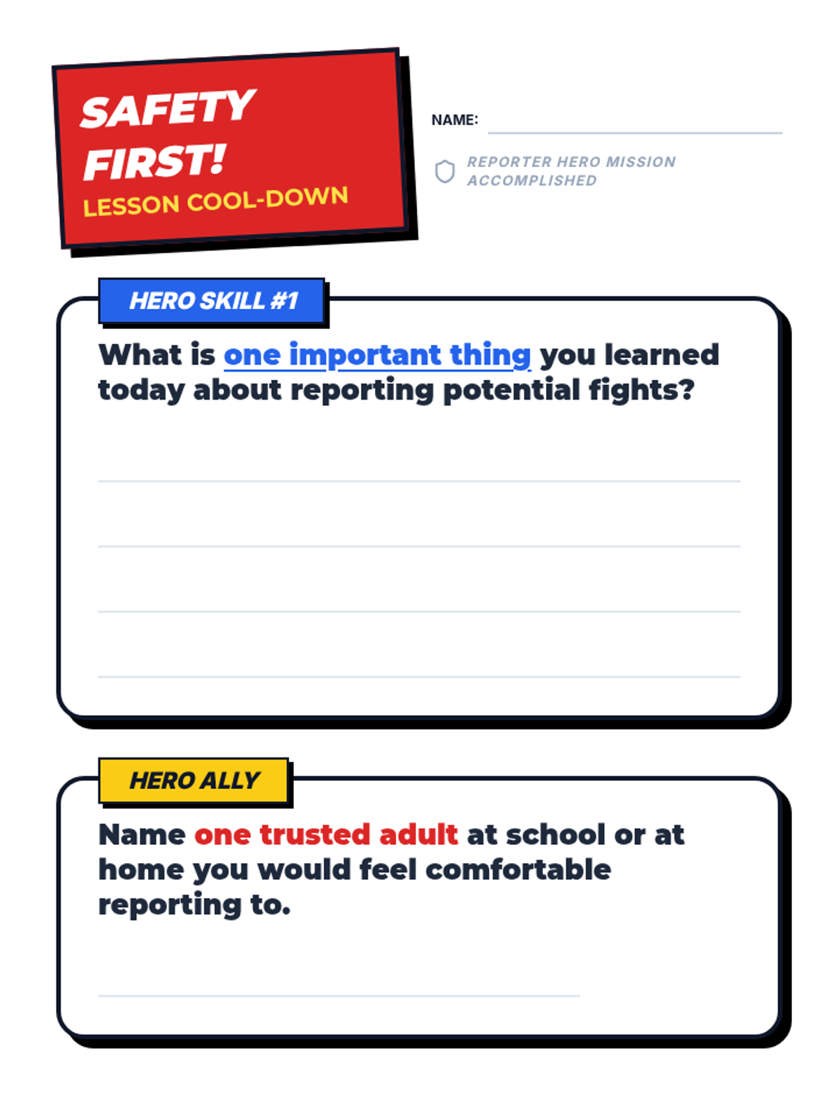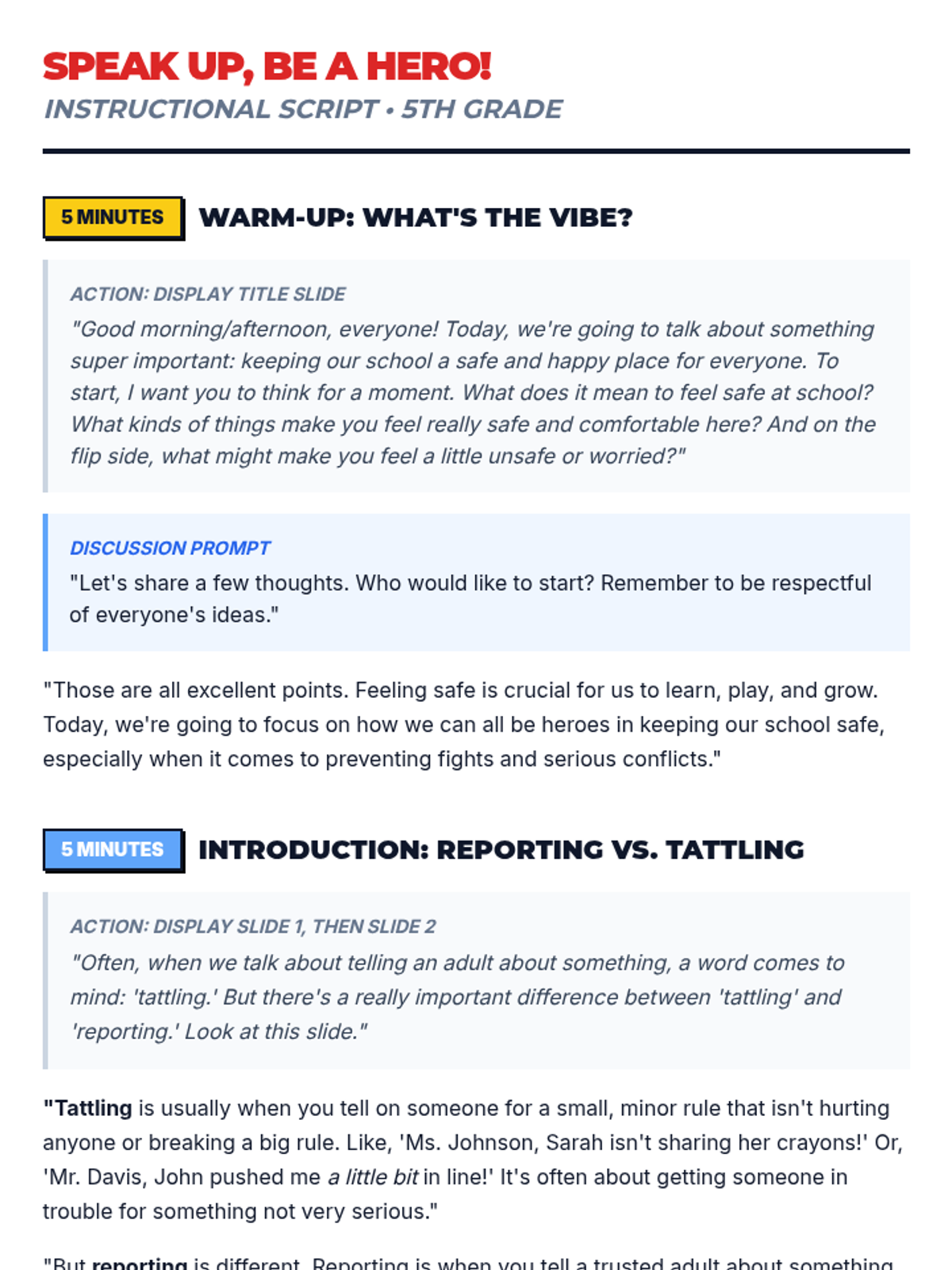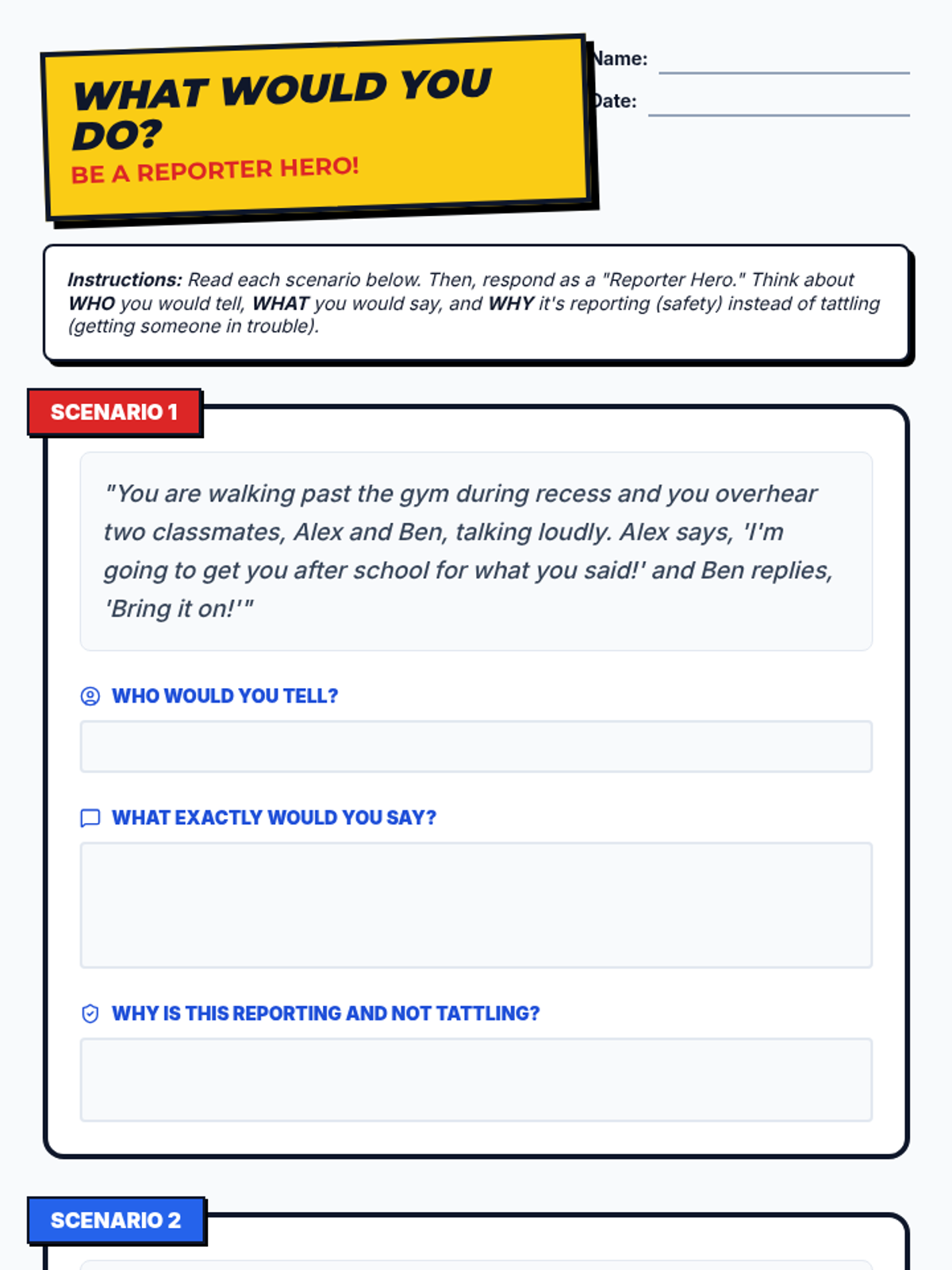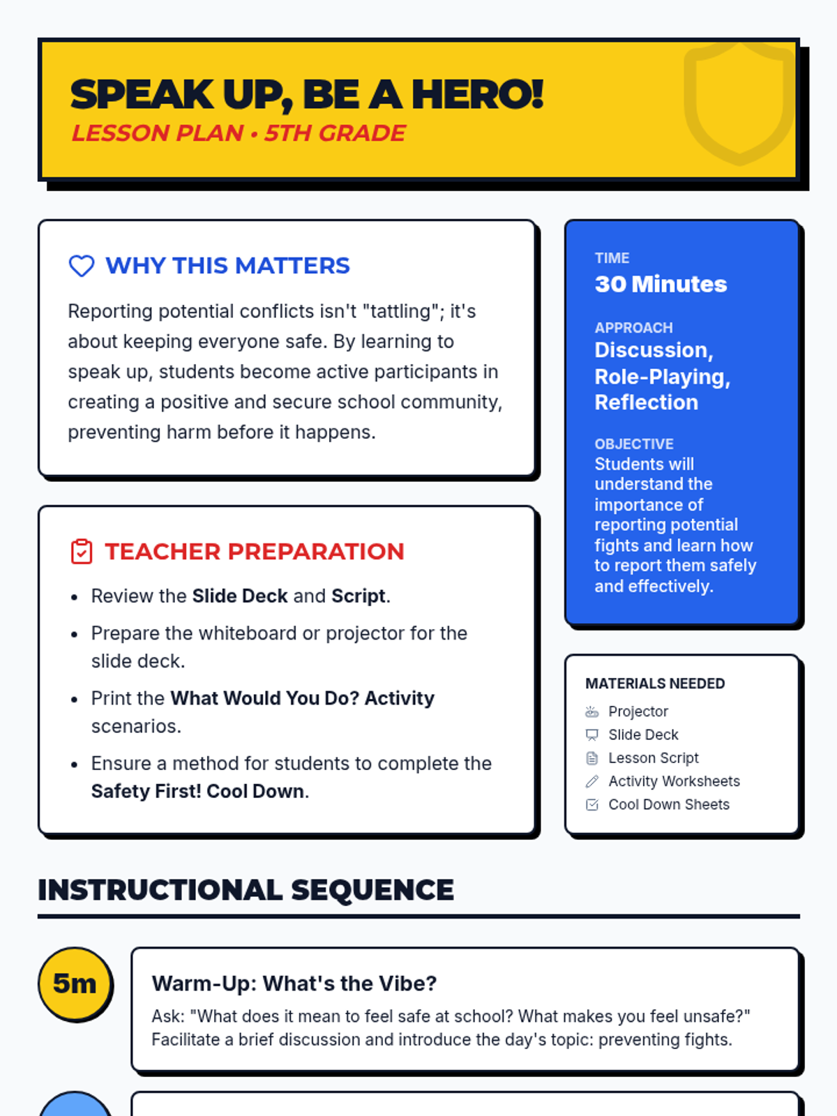 A 30-minute interactive lesson for 5th graders on the importance of reporting potential conflicts and fights. Students learn the difference between reporting and tattling, identify trusted adults, and practice response strategies through scenarios.
