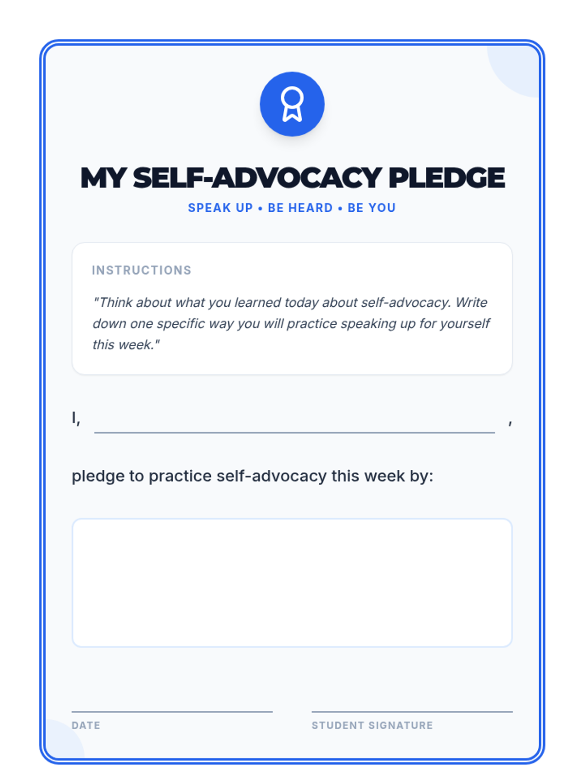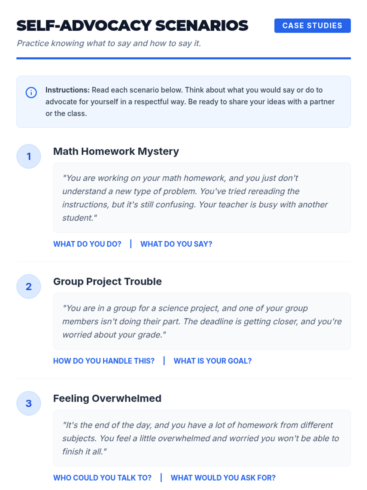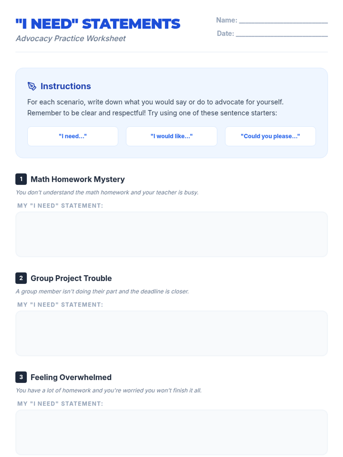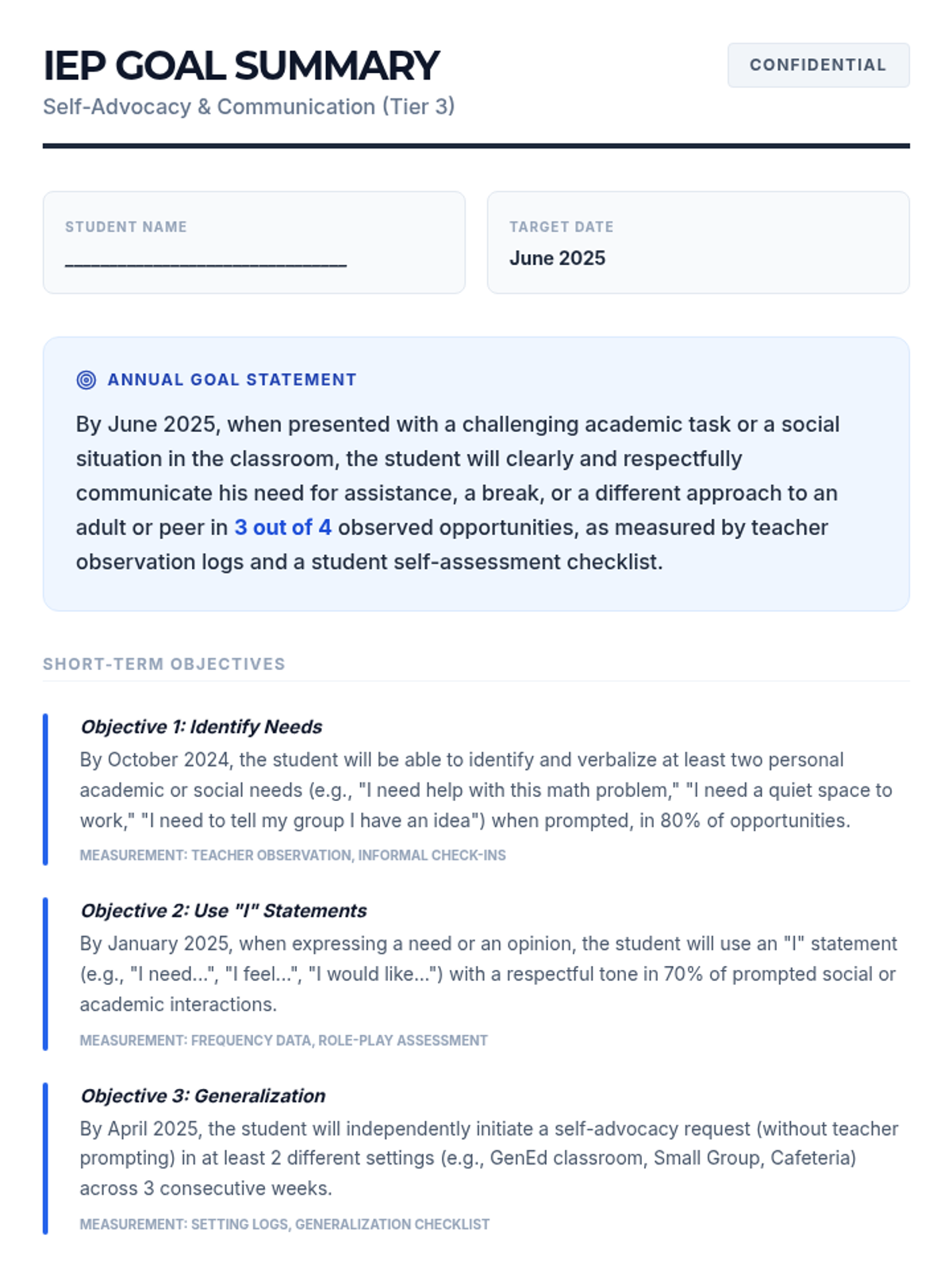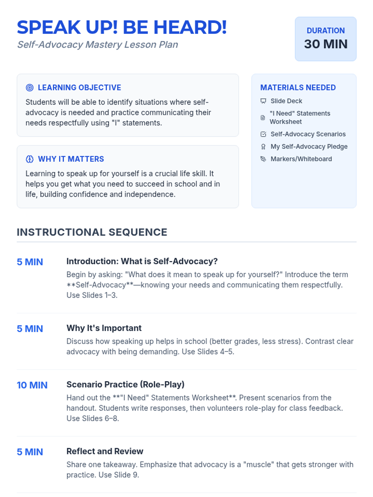 A Tier 3 intervention lesson designed for 5th-grade students to develop self-advocacy skills. Students learn to identify their academic and social needs and practice communicating them respectfully using "I" statements.