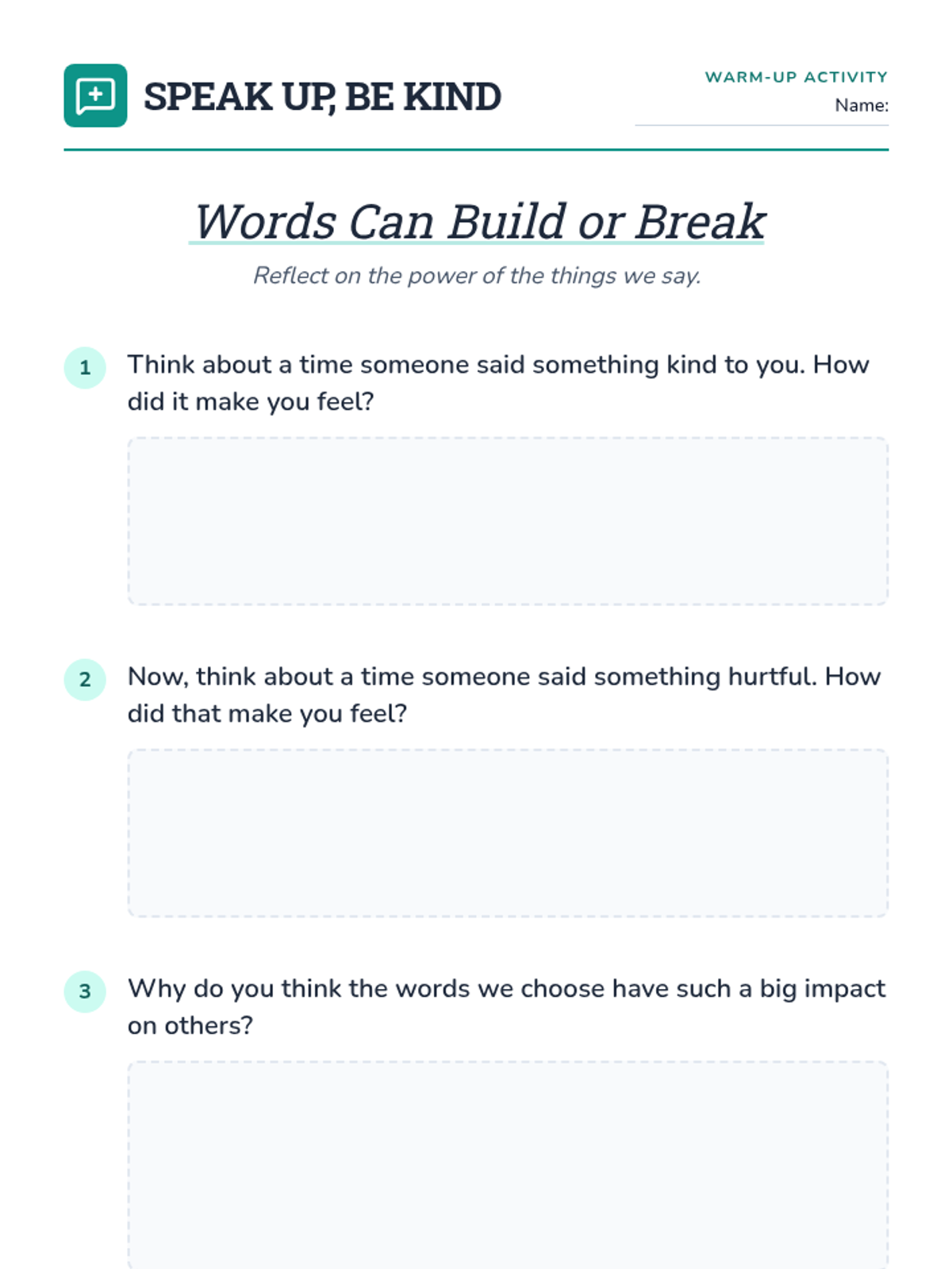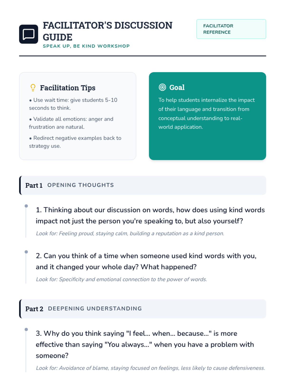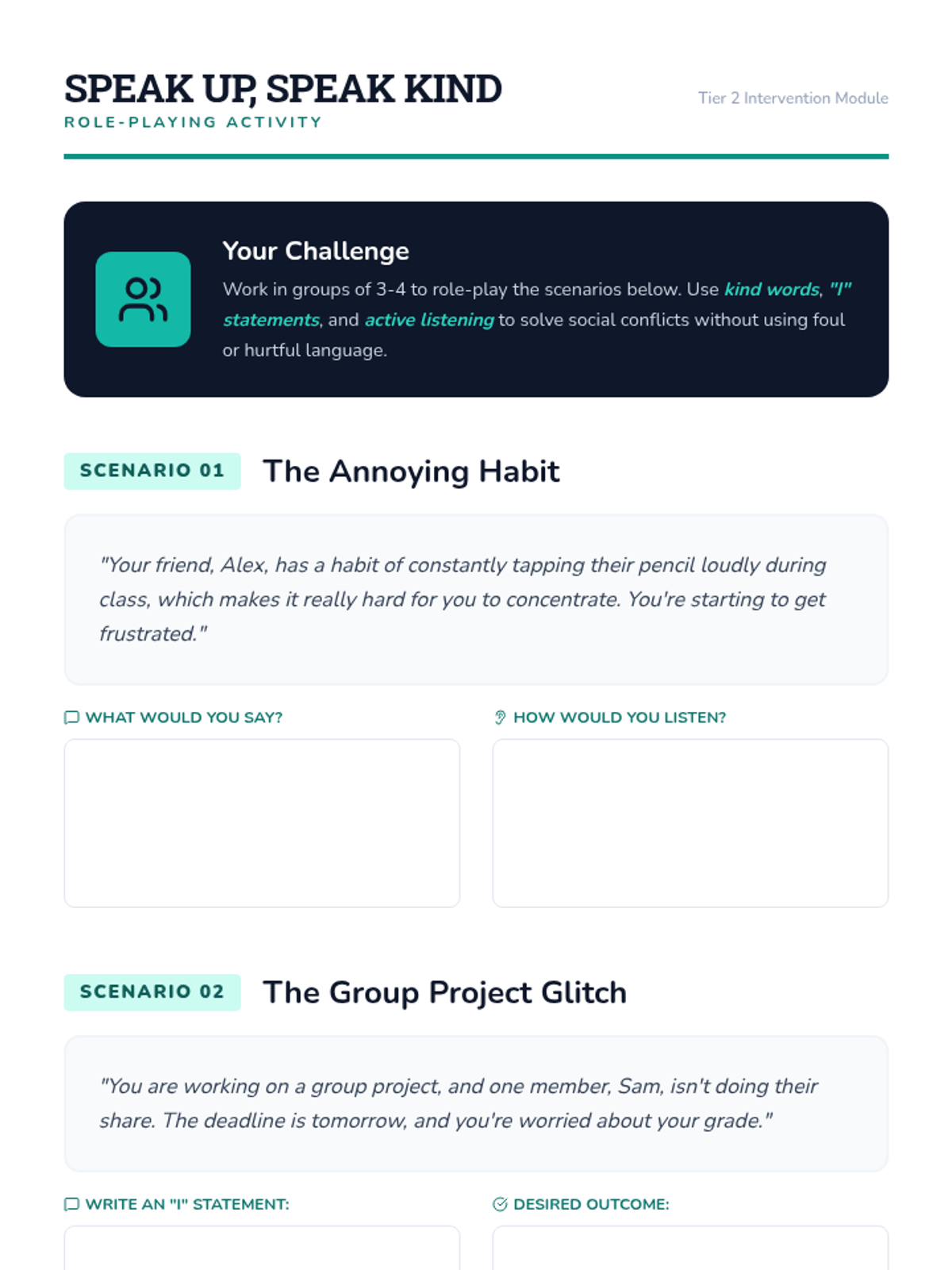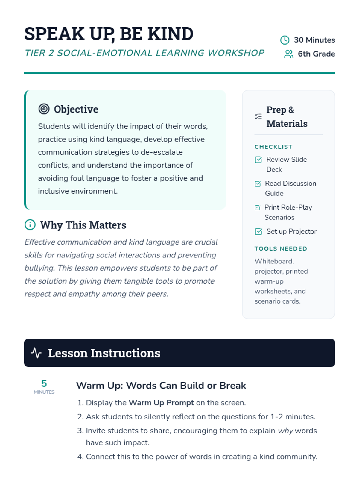 This 30-minute, Tier 2 workshop for 6th-grade students focuses on empowering students to combat bullying through positive communication. Students will learn and practice using kind words, developing effective communication skills, and understanding the impact of language.