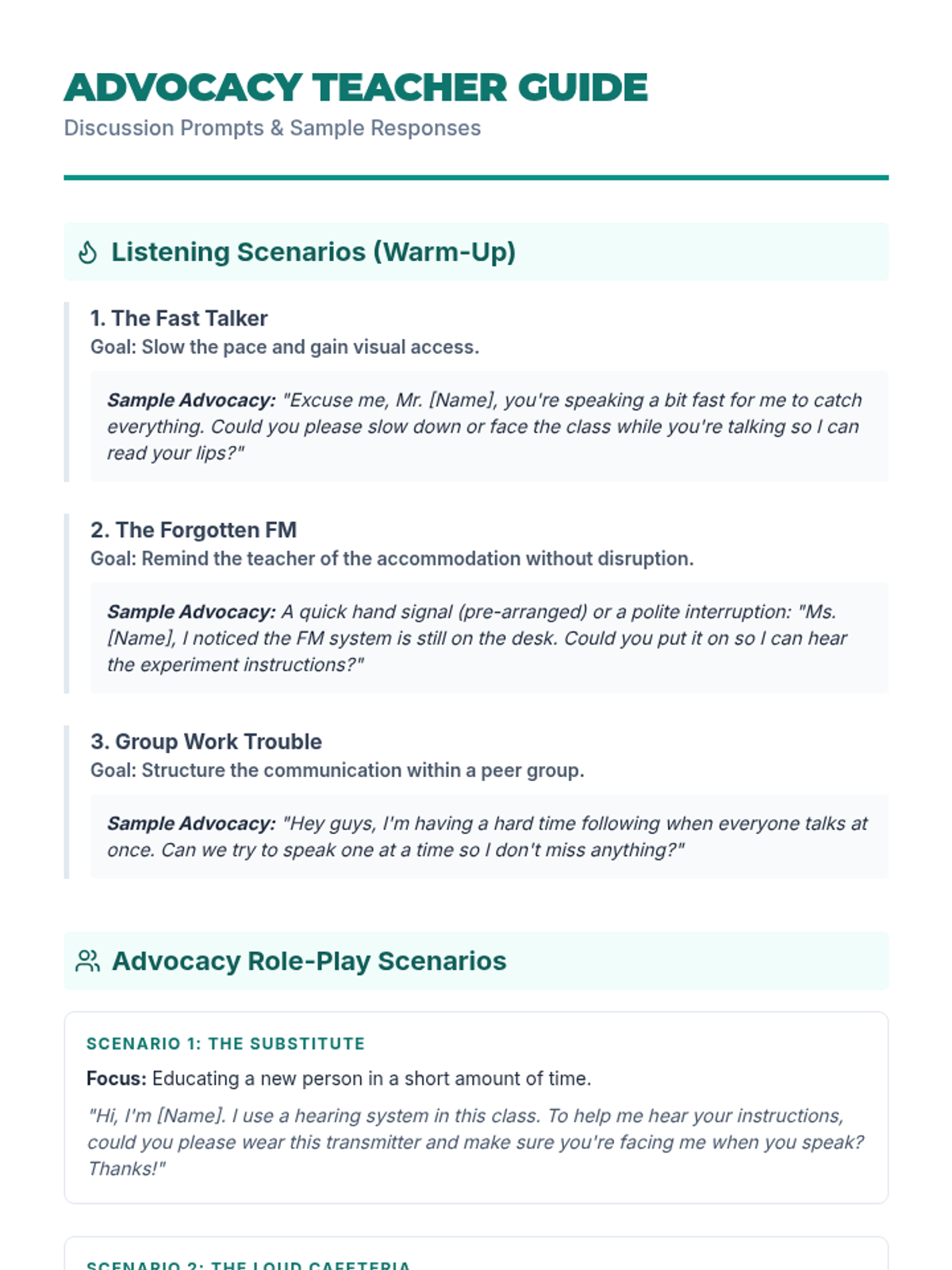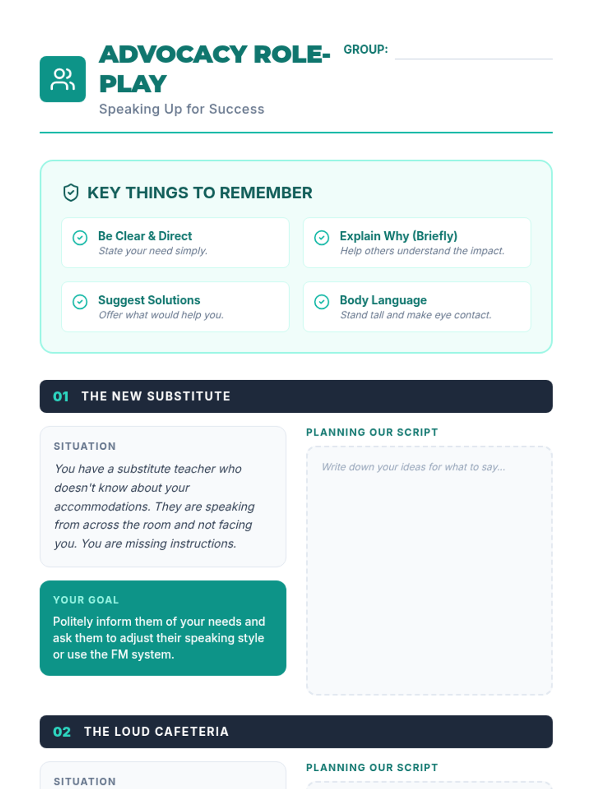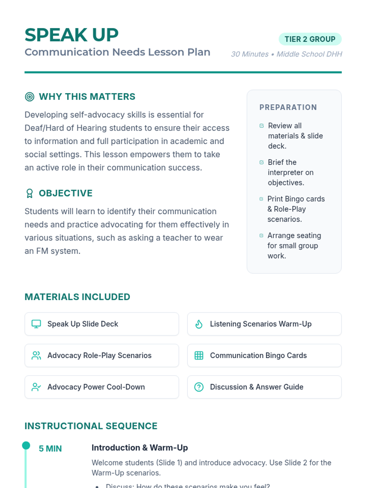 A 30-minute Tier 2 lesson for middle school Deaf/Hard of Hearing students focused on identifying communication needs and practicing effective self-advocacy strategies.