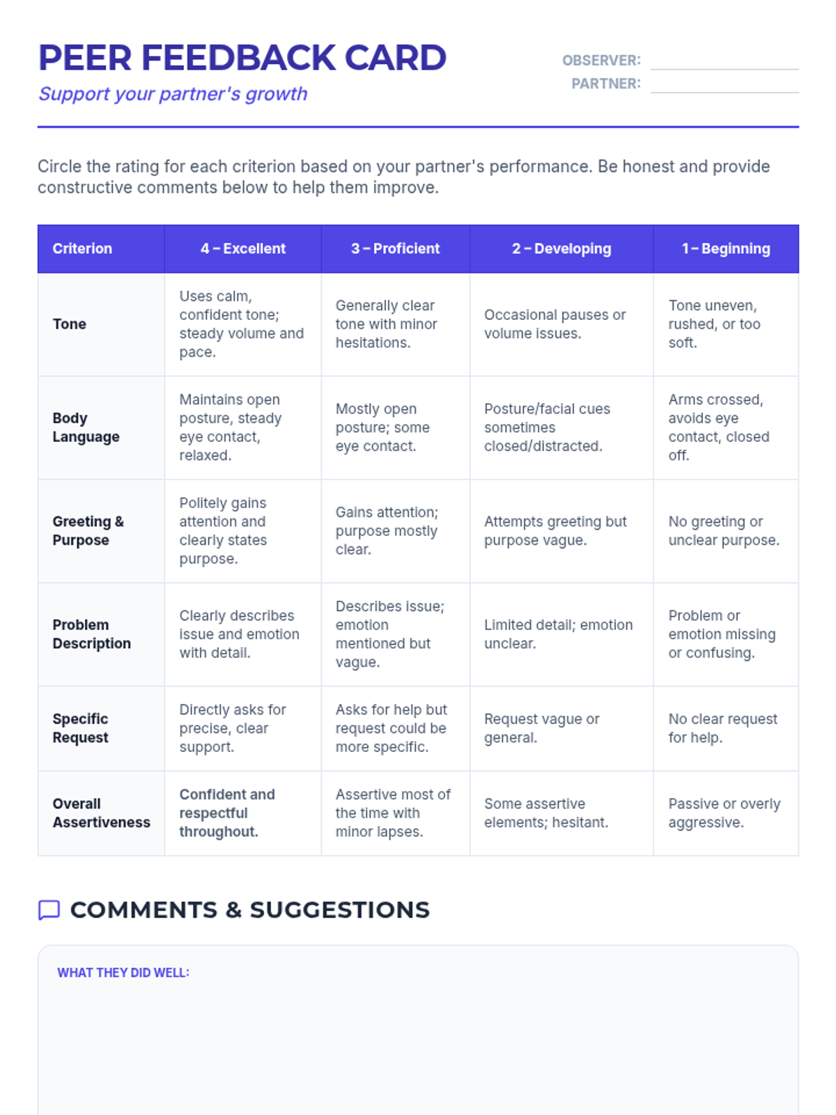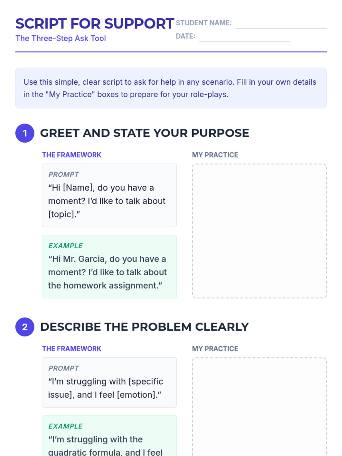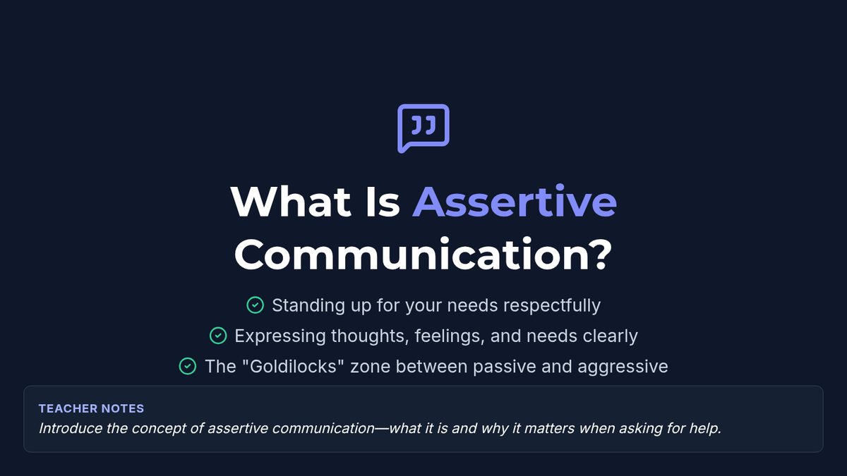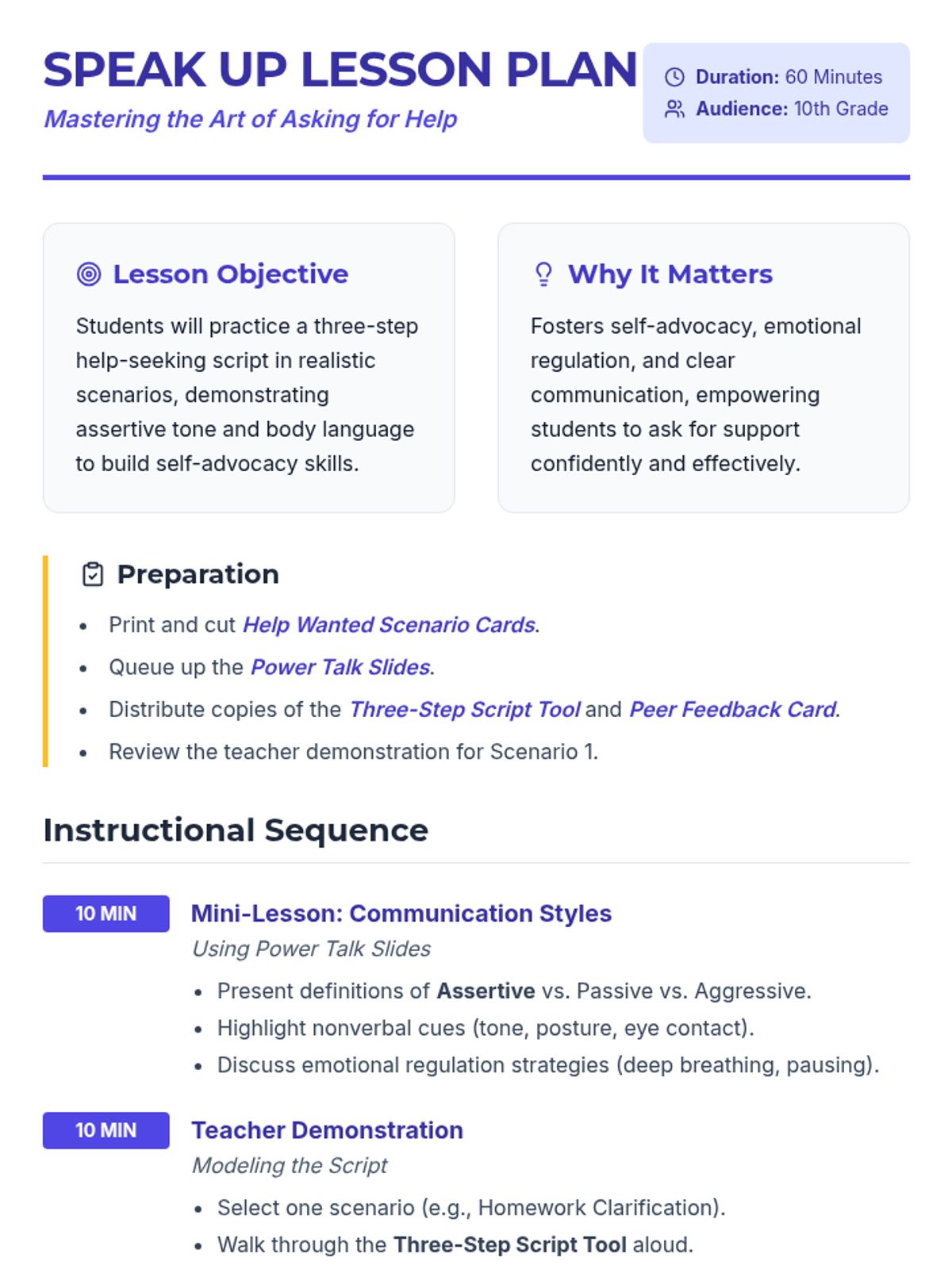 A 60-minute lesson for 10th graders to master self-advocacy through a three-step help-seeking script, featuring assertive communication training and peer-to-peer role-plays.