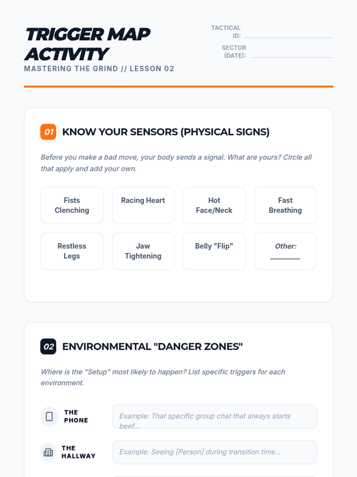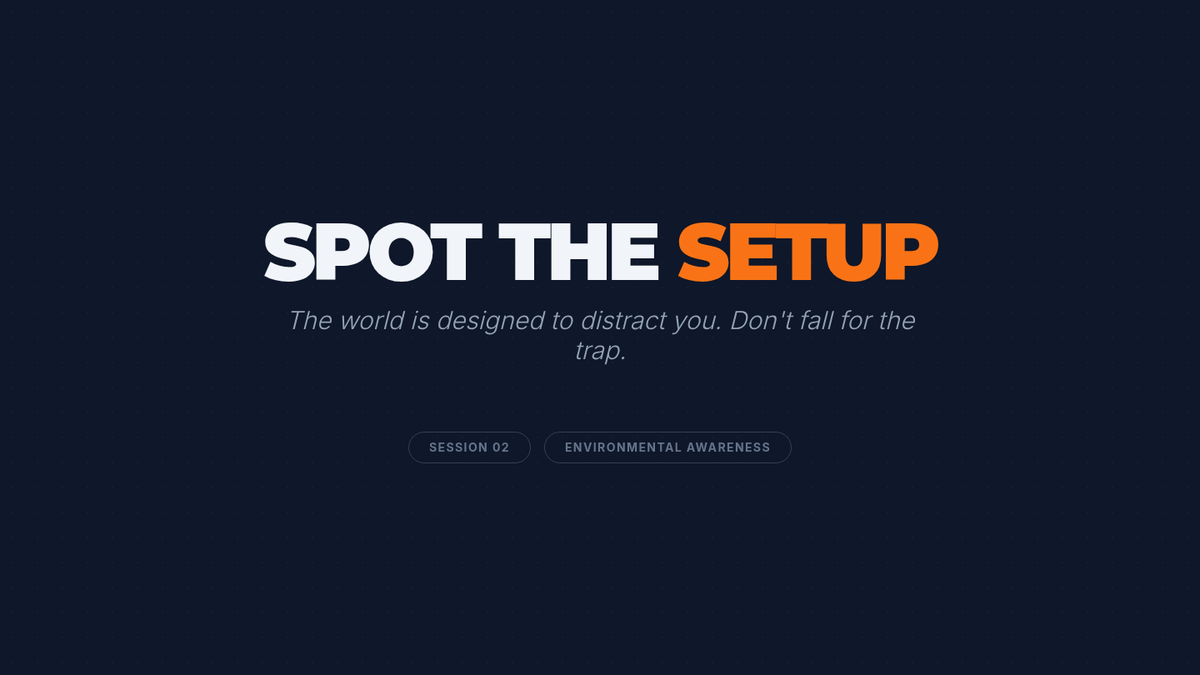 Students identify internal and environmental 'setups'—triggers that lead to self-sabotage. They create tactical maps of their daily routines to anticipate and bypass distractions in an urban school environment.