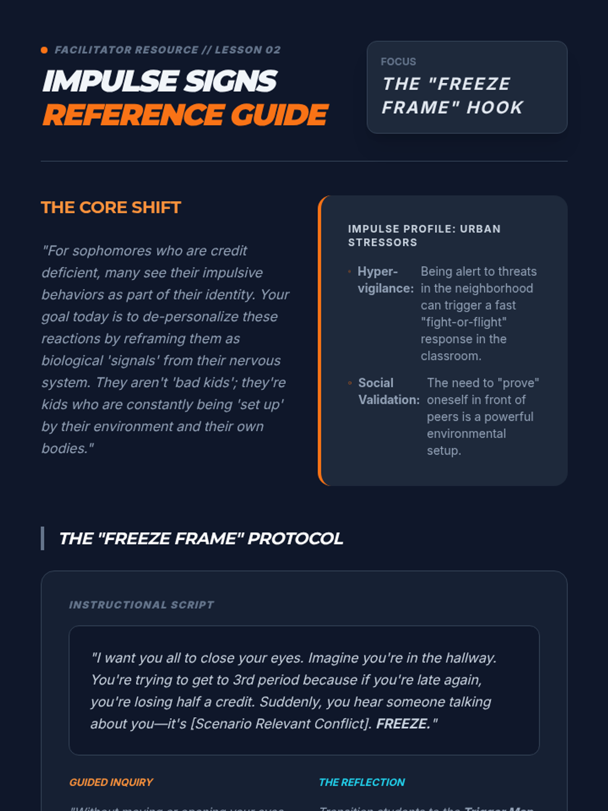 Equips students with high-level cognitive strategies to override impulsive reactions. Focuses on 'reframing' stressful situations and using 'if-then' planning to maintain composure under pressure.