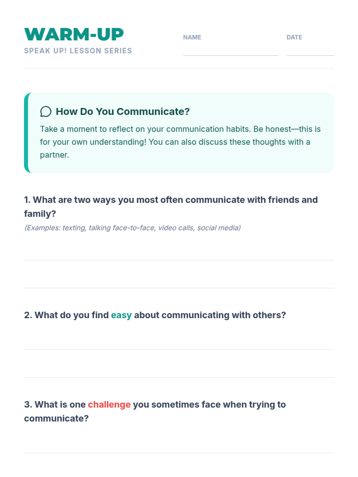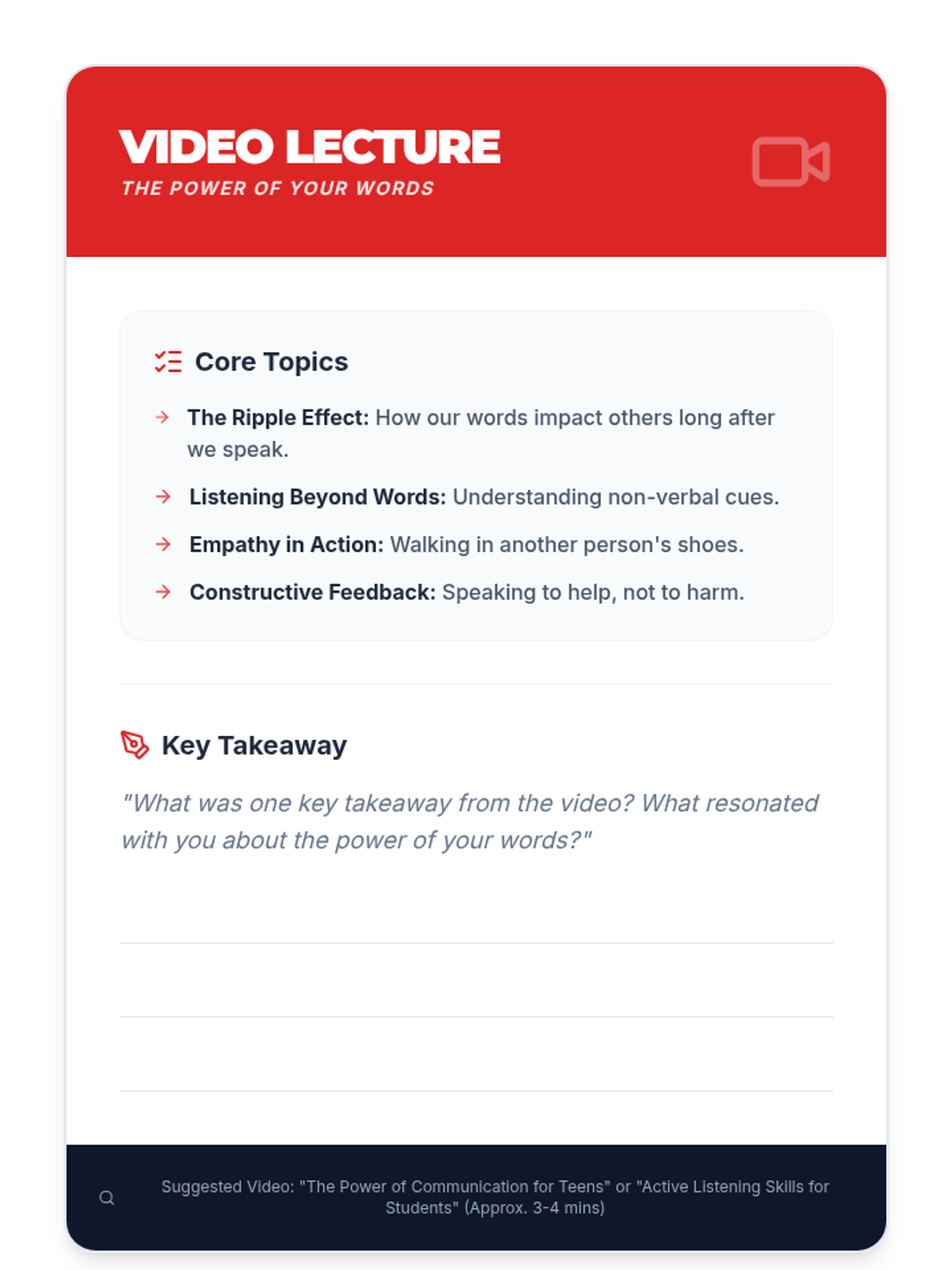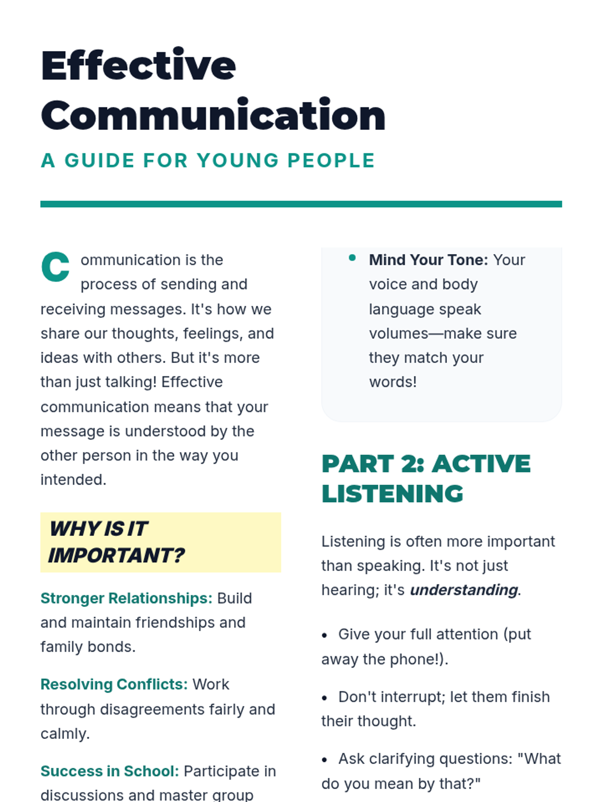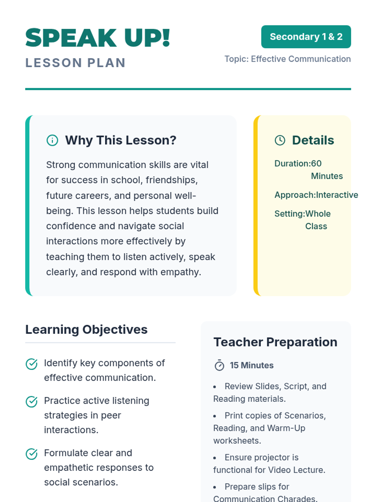 This lesson empowers Secondary 1 & 2 students with essential communication skills, focusing on active listening, clear expression, and empathy through interactive activities and real-life scenarios.