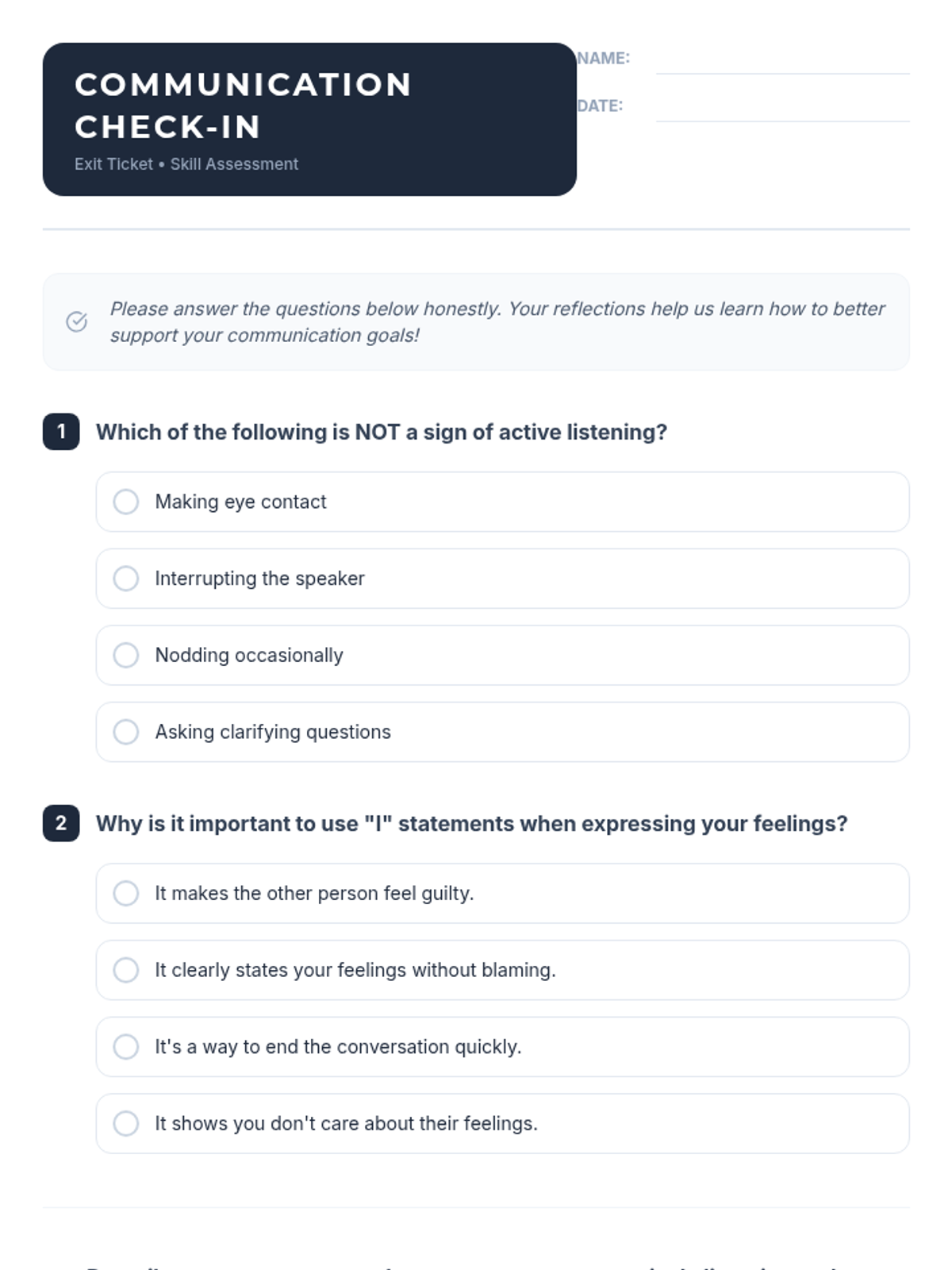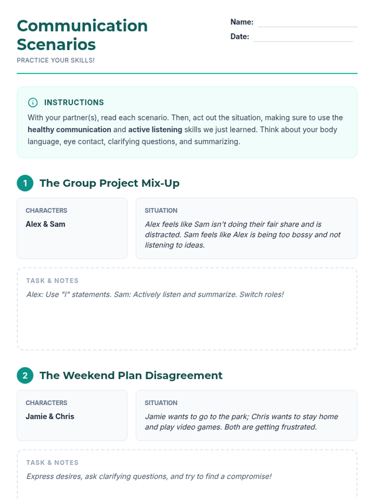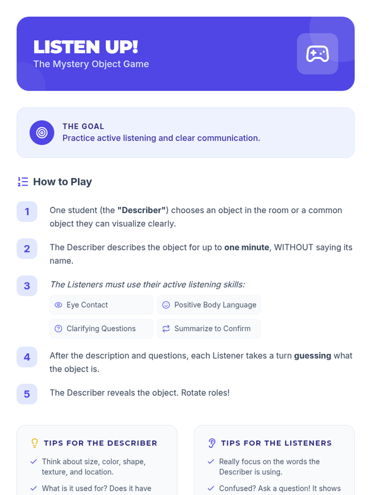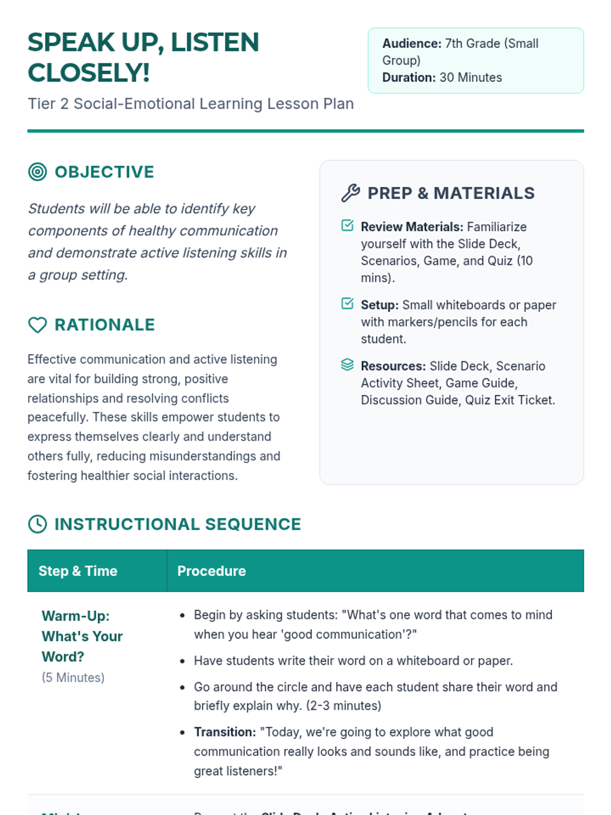 A 30-minute Tier 2 small group lesson for 7th-grade students focused on developing active listening and healthy communication skills through interactive scenarios and games.