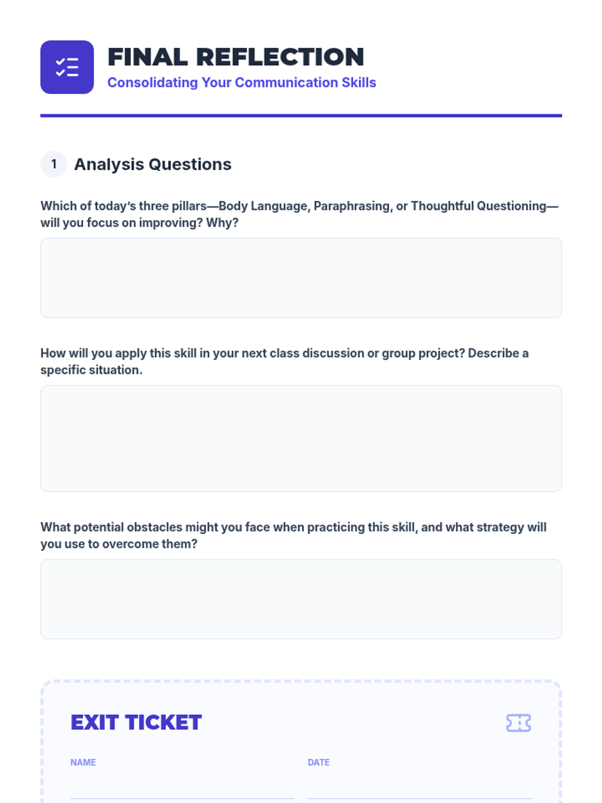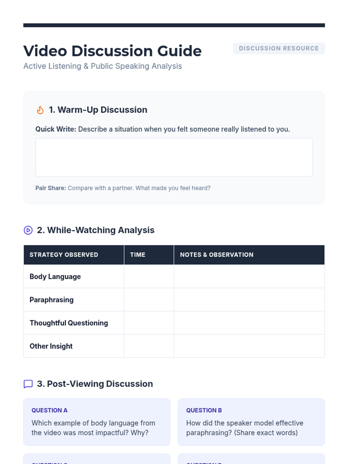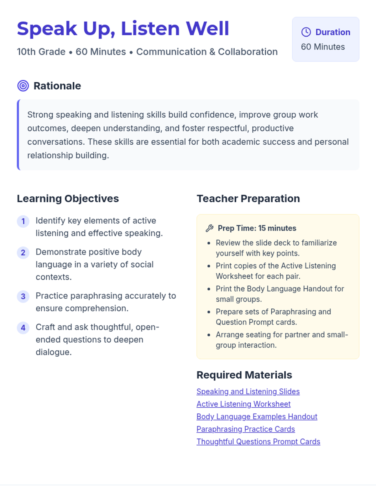 A dynamic 60-minute 10th-grade lesson focusing on active listening and public speaking strategies through guided discussion, role-plays, and reflective practice. Students analyze body language, paraphrasing, and questioning techniques to improve academic and personal communication.