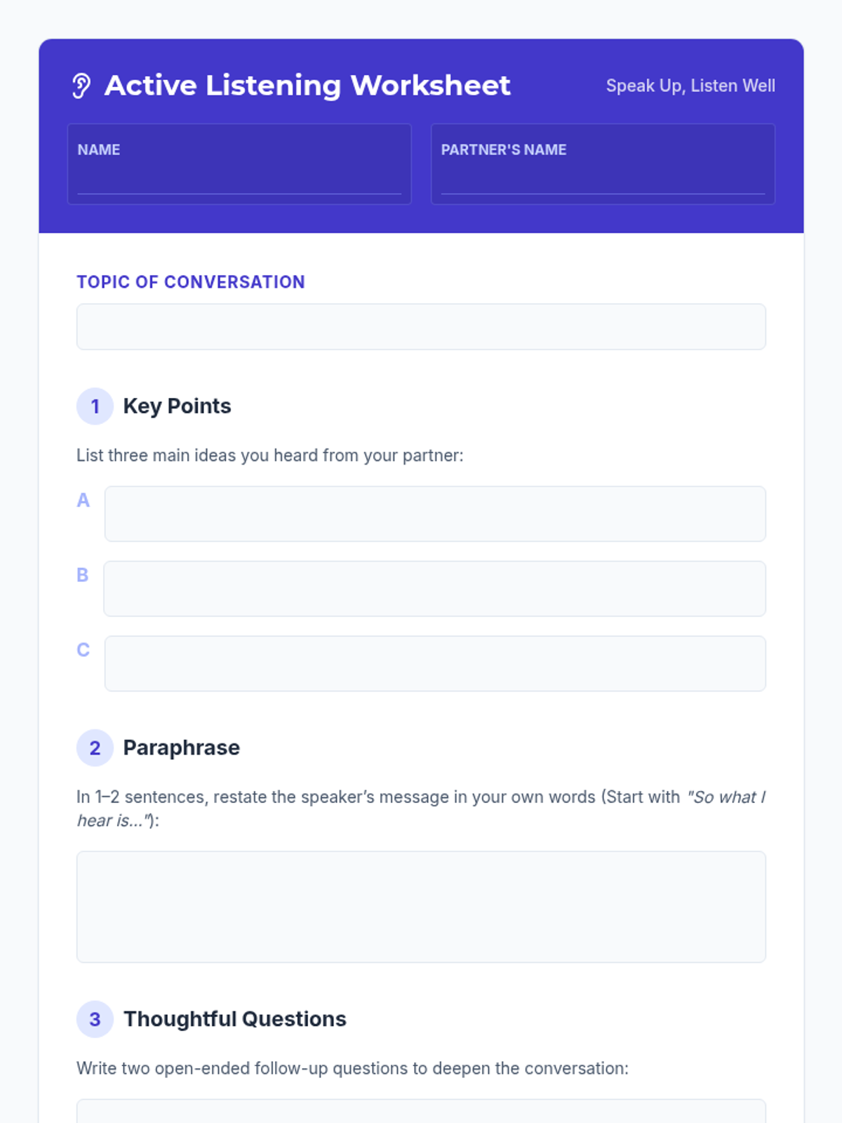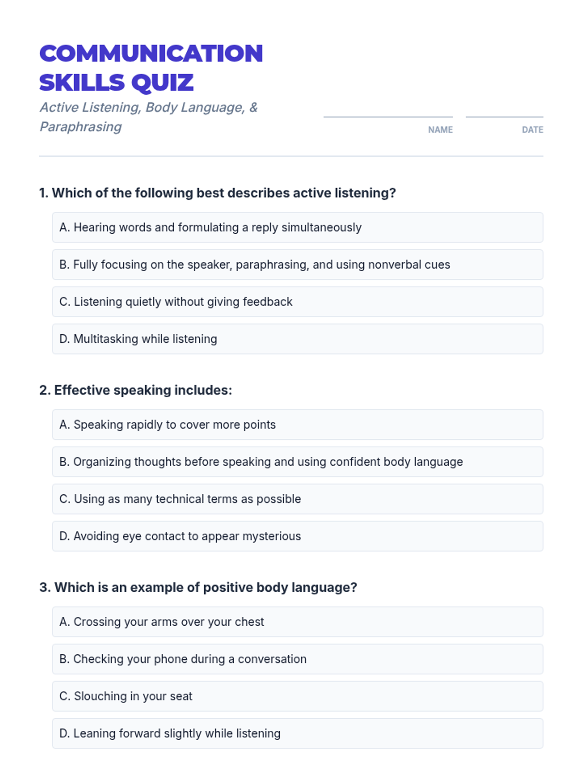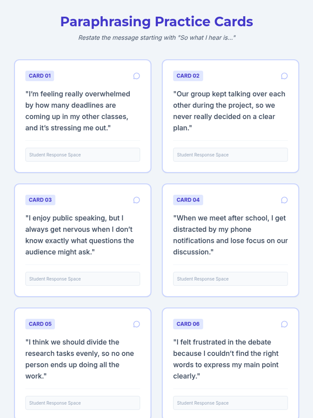 A dynamic 60-minute 10th-grade lesson focusing on active listening and public speaking strategies through guided discussion, role-plays, and reflective practice. Students analyze body language, paraphrasing, and questioning techniques to improve academic and personal communication.