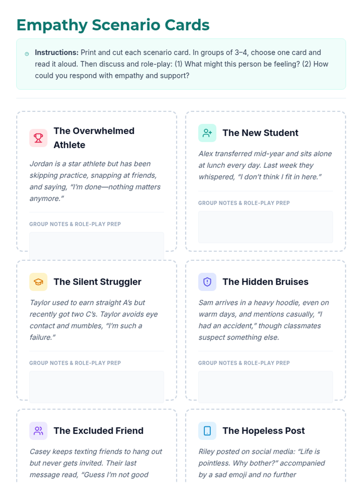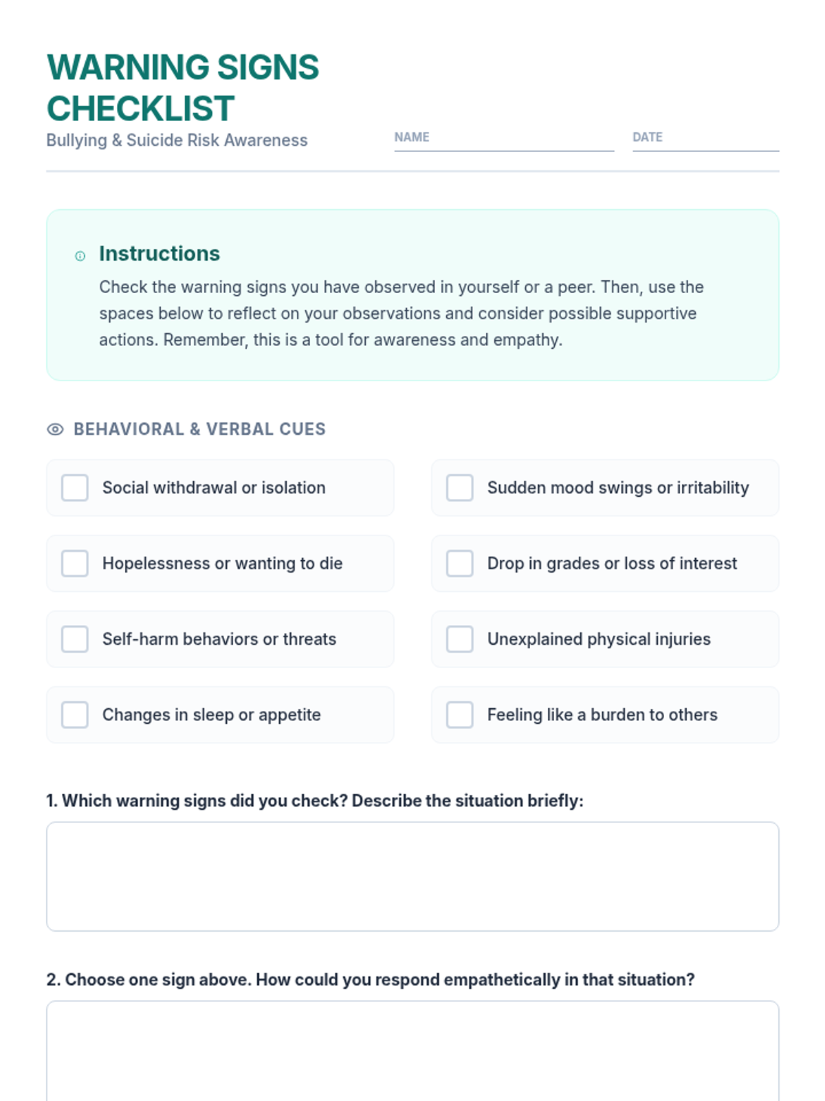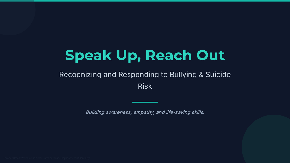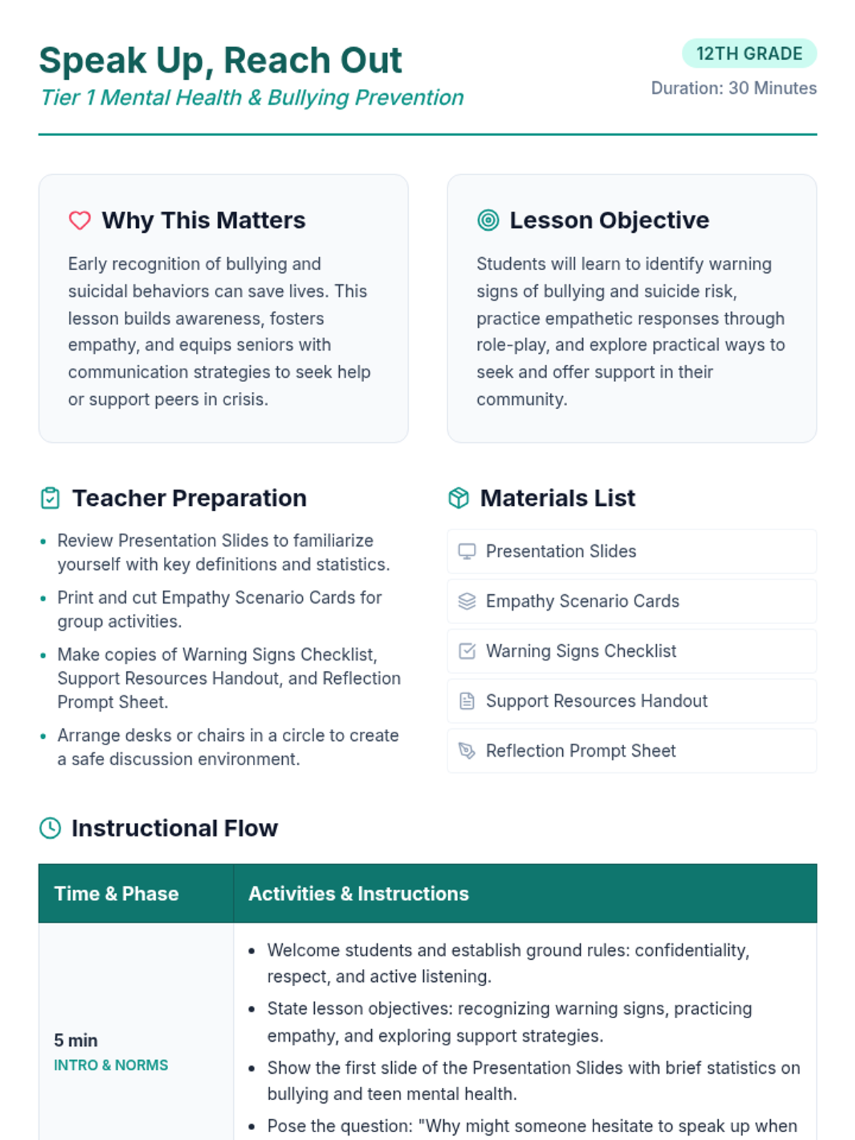 A 30-minute Tier 1 lesson for 12th graders focused on recognizing bullying and suicide warning signs, practicing empathy, and identifying support resources. Students engage in interactive discussion, role-play scenarios, and personal reflection to build life-saving communication skills.