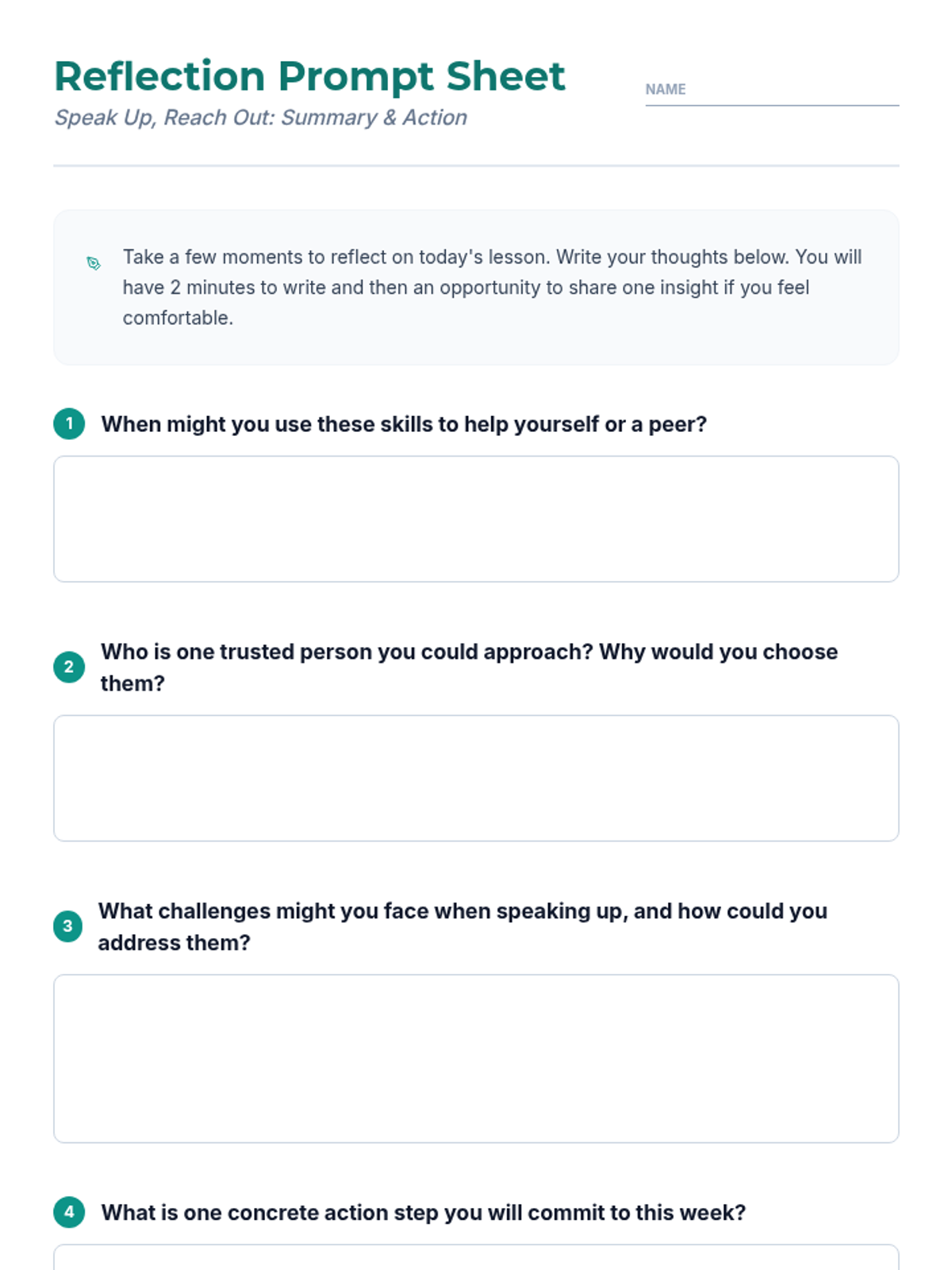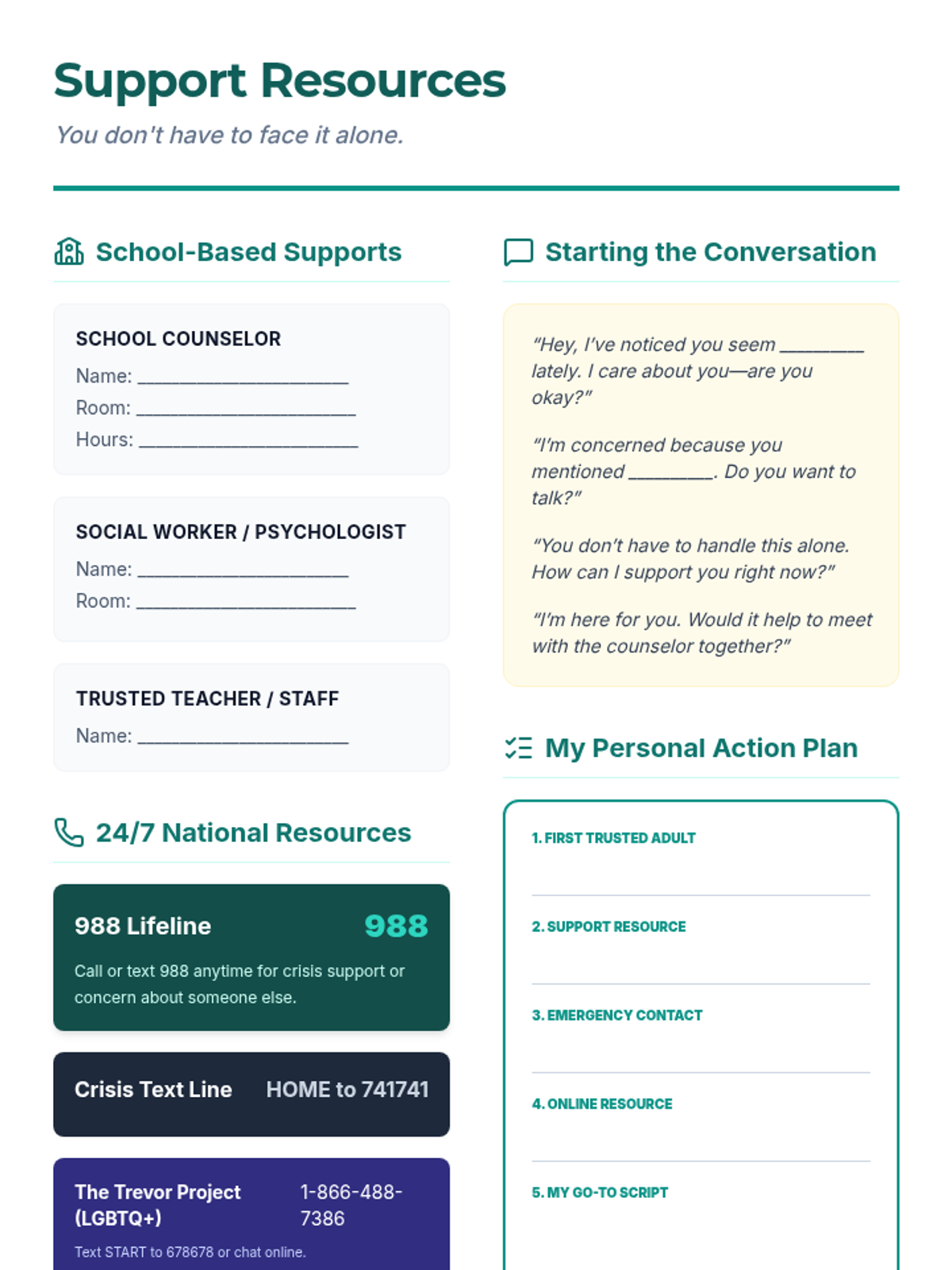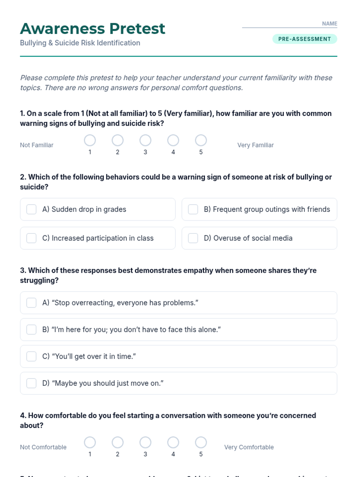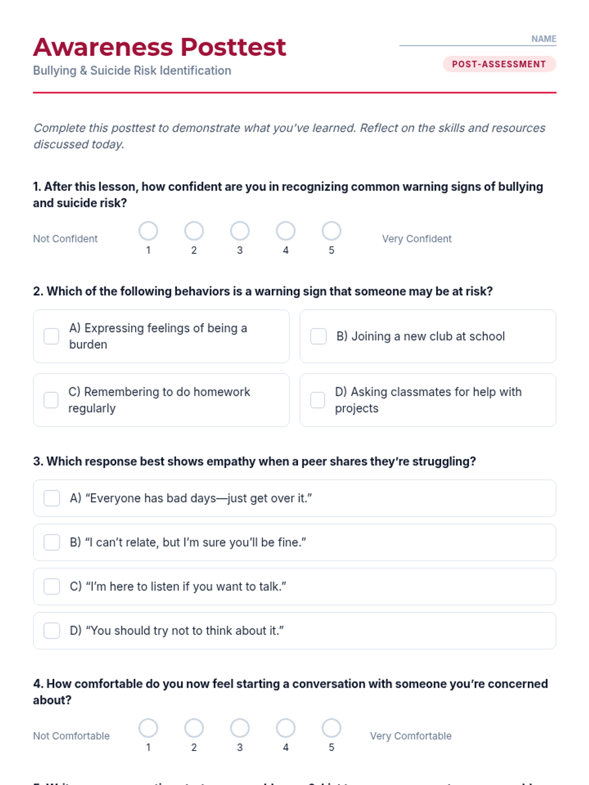 A 30-minute Tier 1 lesson for 12th graders focused on recognizing bullying and suicide warning signs, practicing empathy, and identifying support resources. Students engage in interactive discussion, role-play scenarios, and personal reflection to build life-saving communication skills.