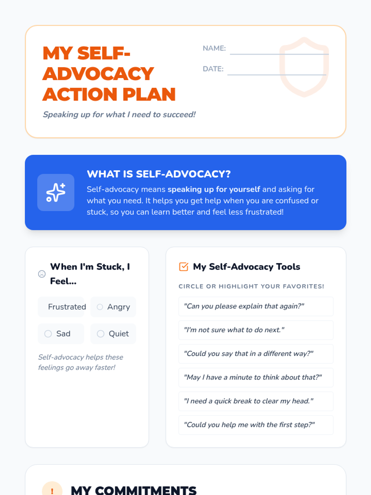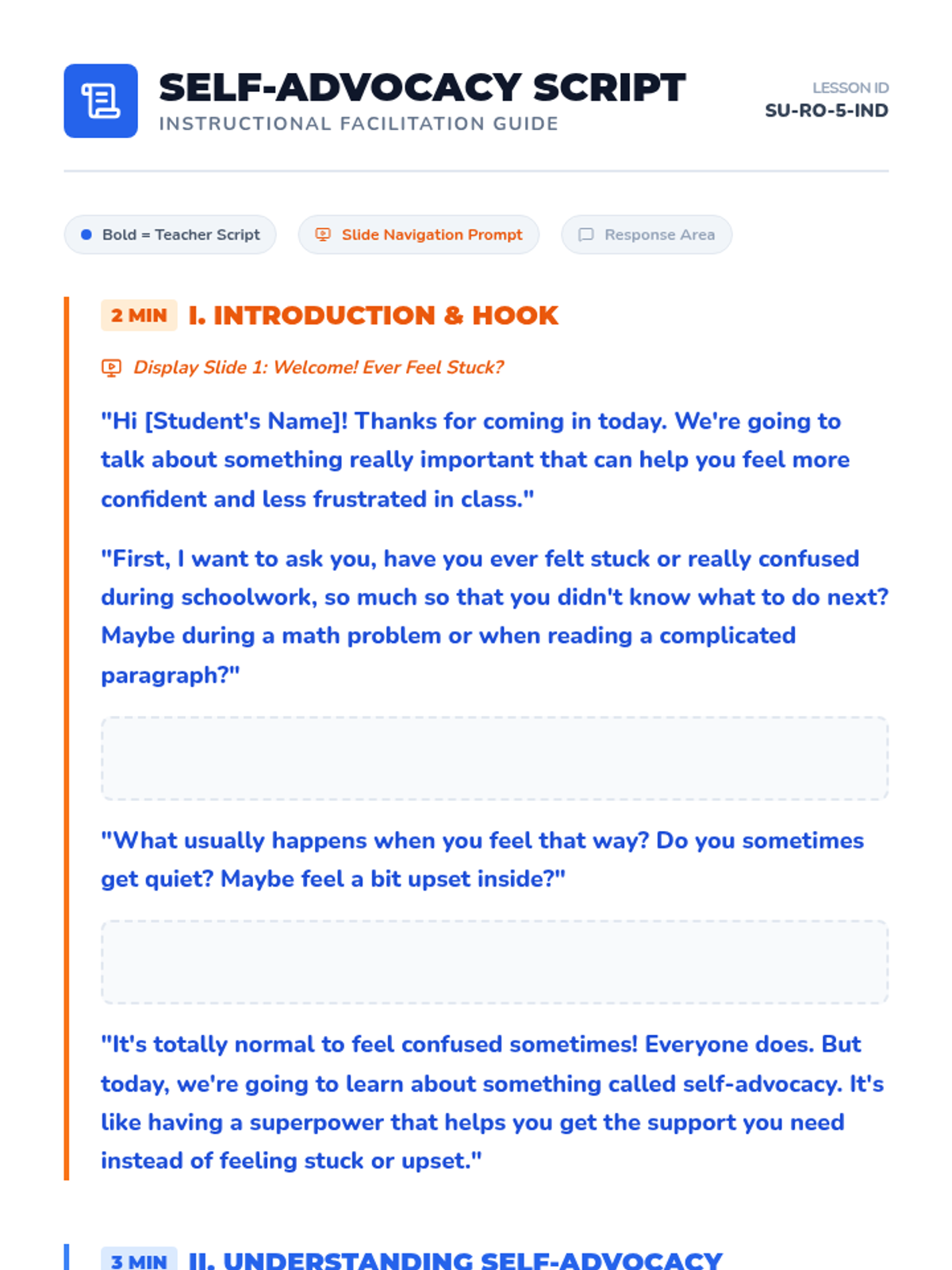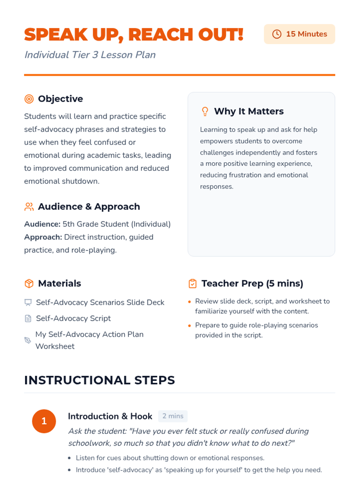 A 15-minute Tier 3 individual lesson for 5th-grade students focused on self-advocacy. Students learn and practice specific phrases to seek help when overwhelmed or confused, fostering independence and emotional resilience.