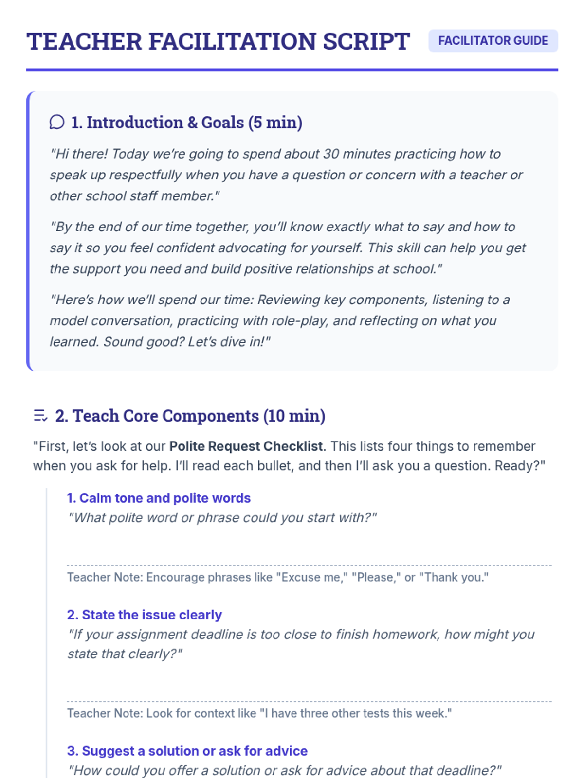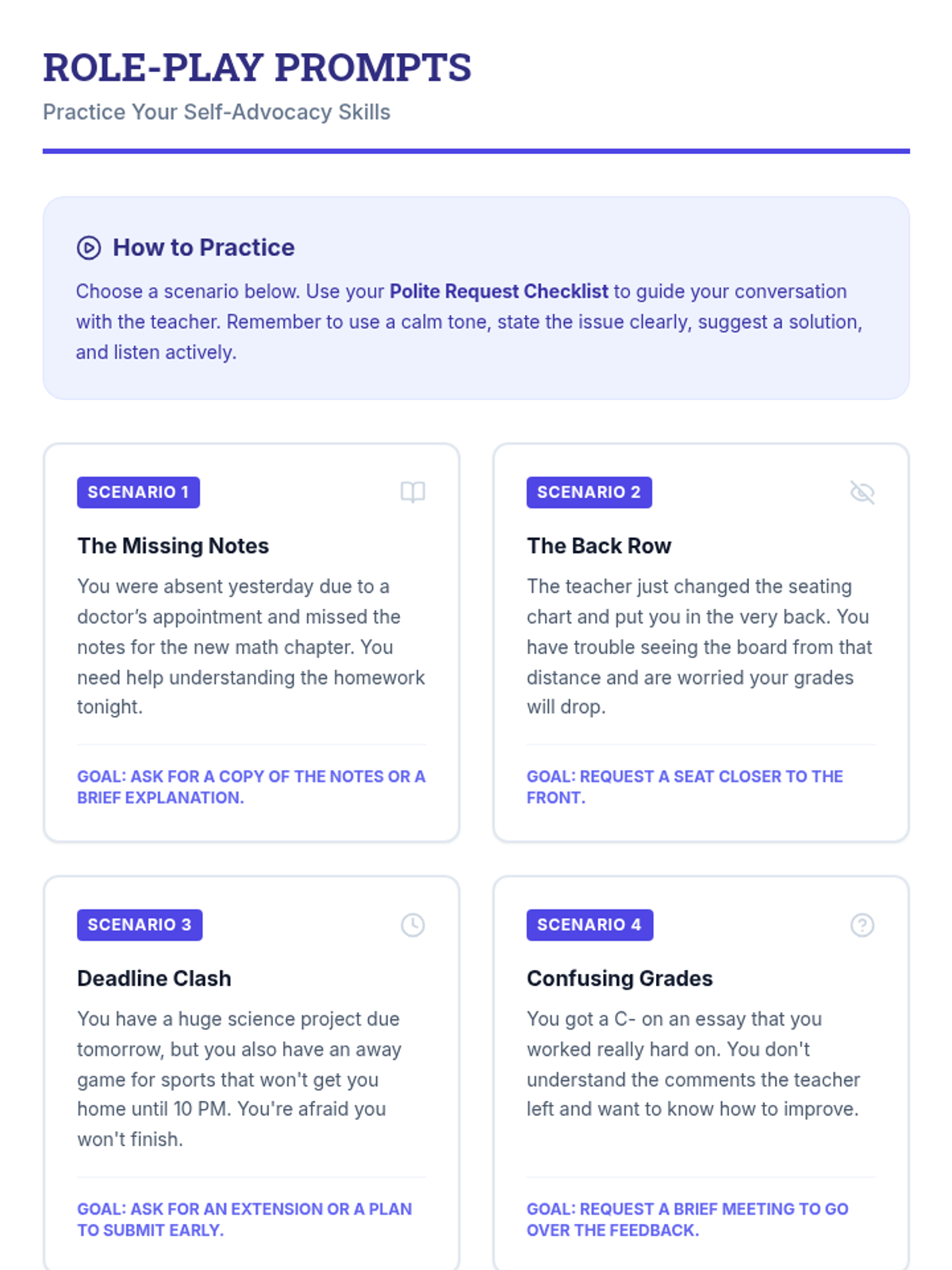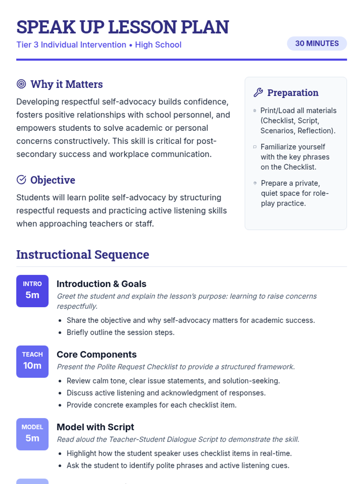 A 30-minute Tier 3 individual lesson designed to help high school students develop respectful self-advocacy skills, empowering them to communicate academic or personal concerns effectively to staff.