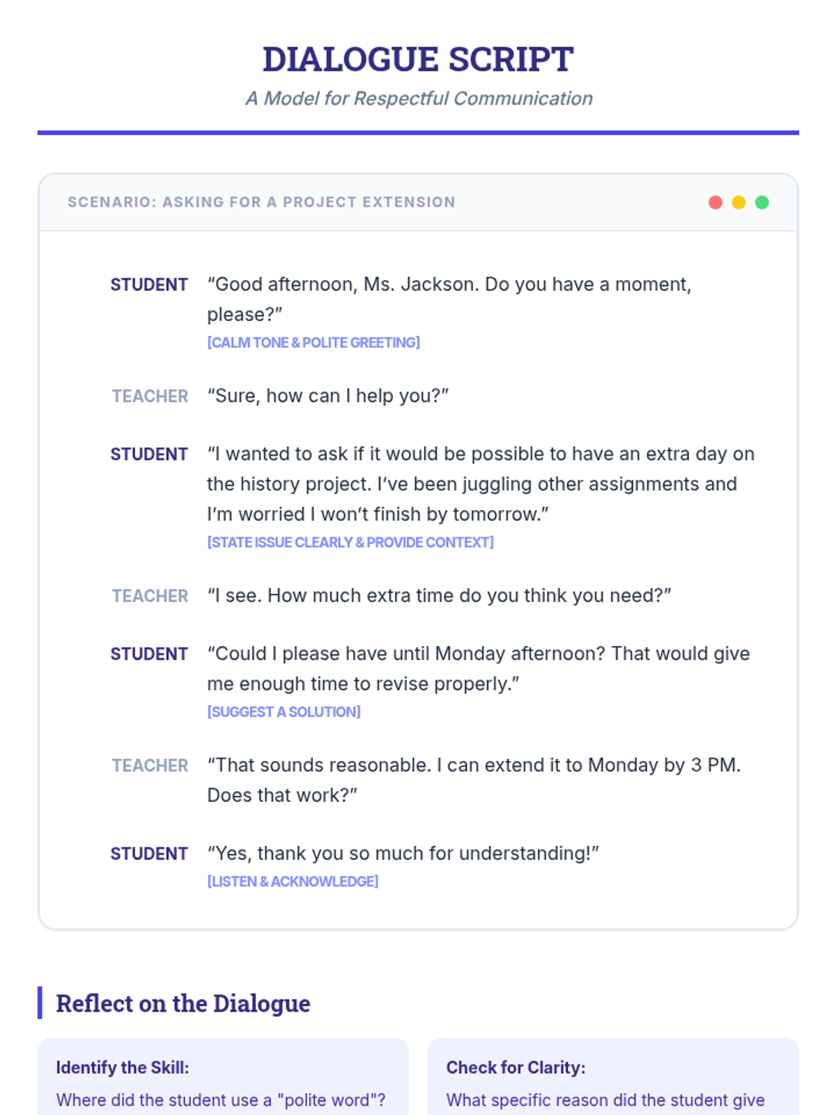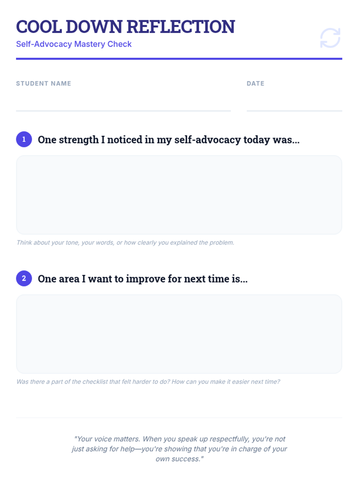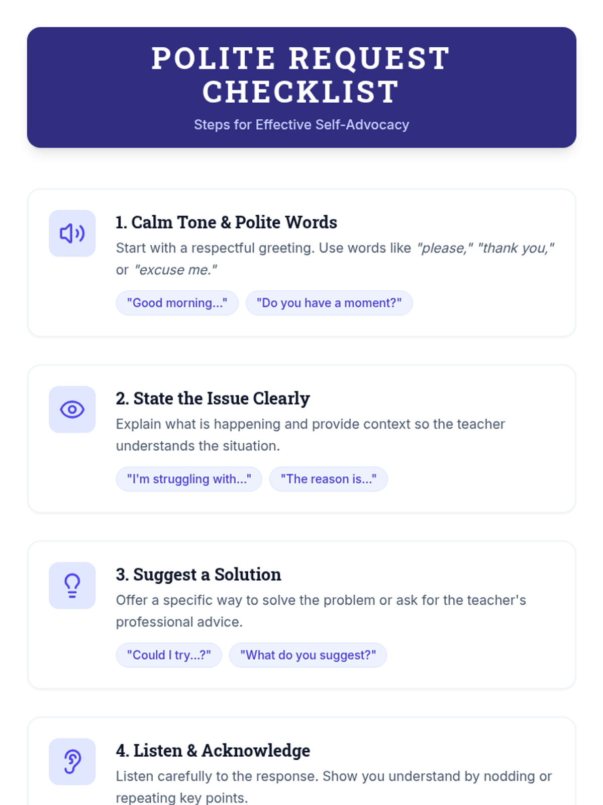 A 30-minute Tier 3 individual lesson designed to help high school students develop respectful self-advocacy skills, empowering them to communicate academic or personal concerns effectively to staff.