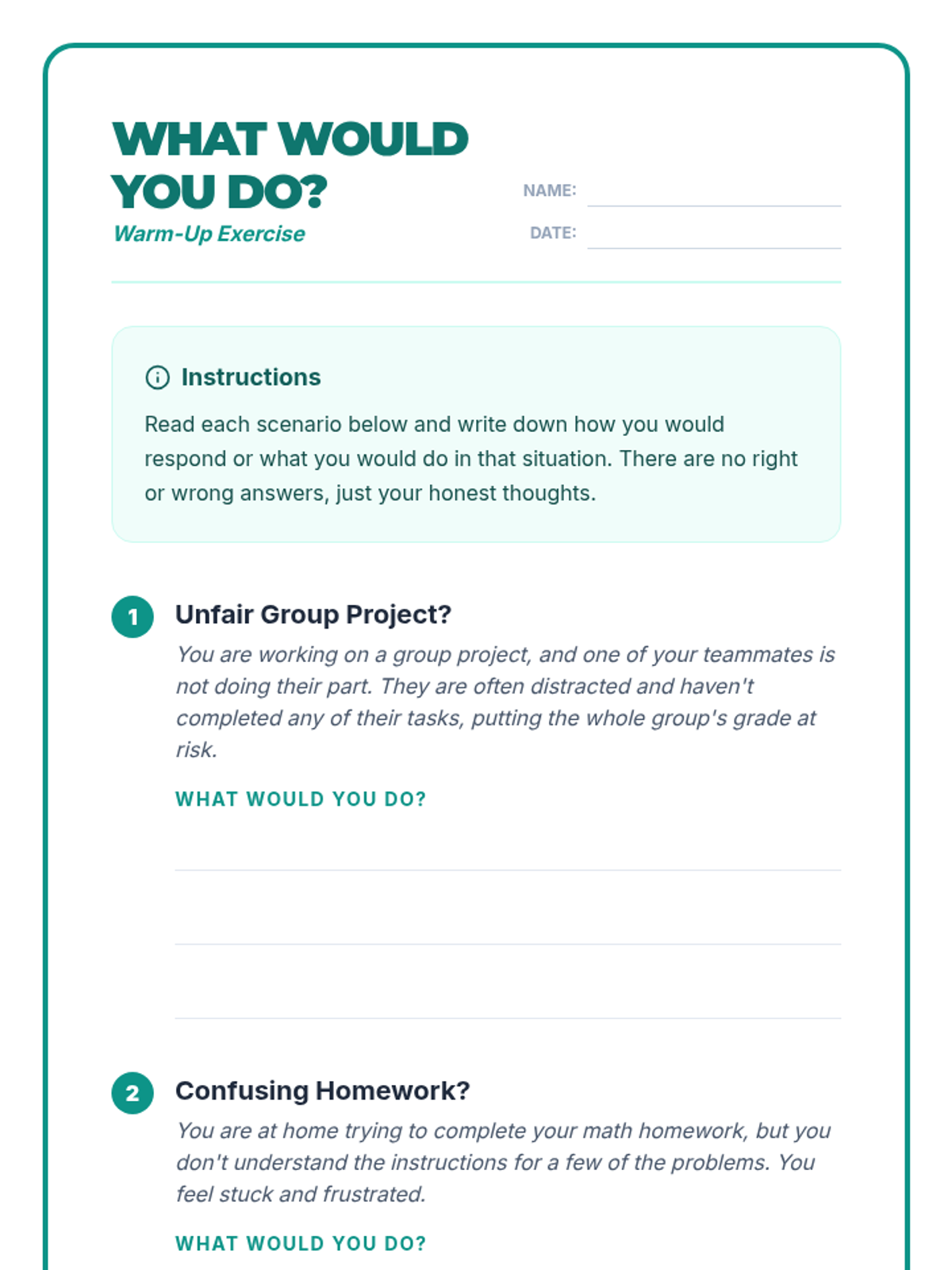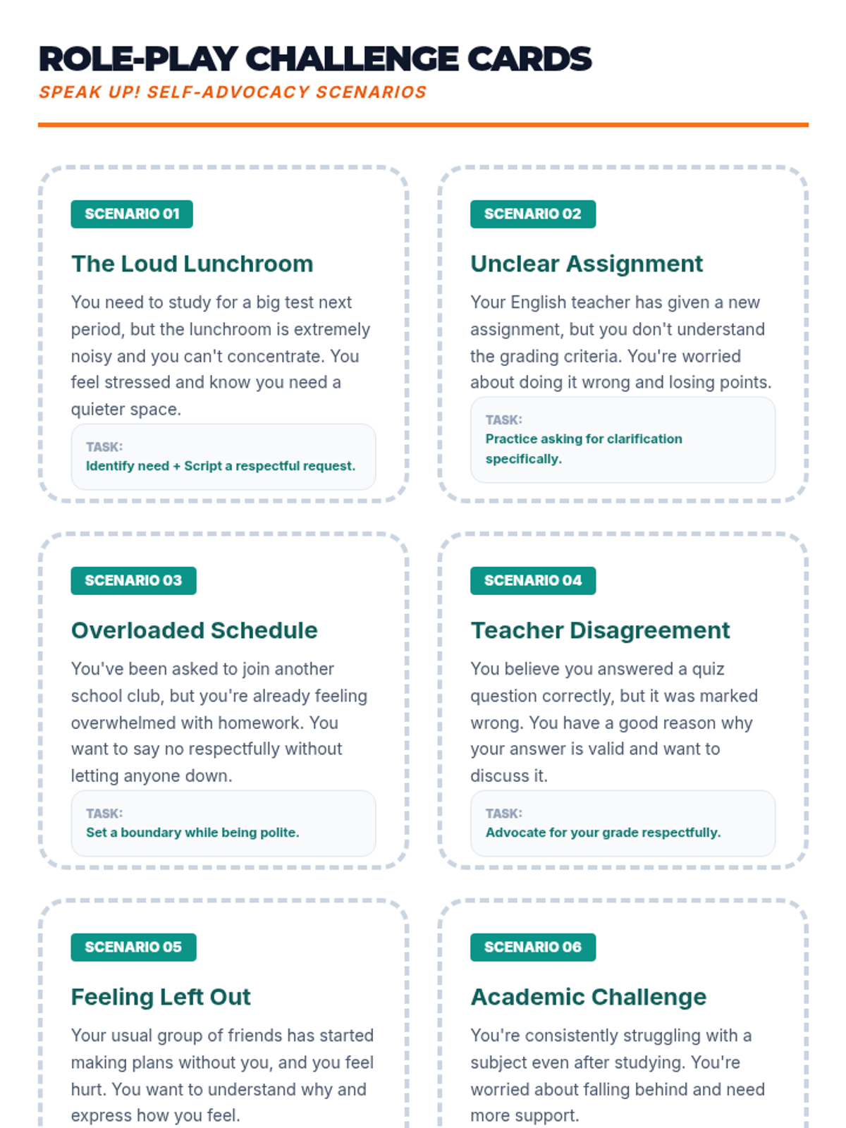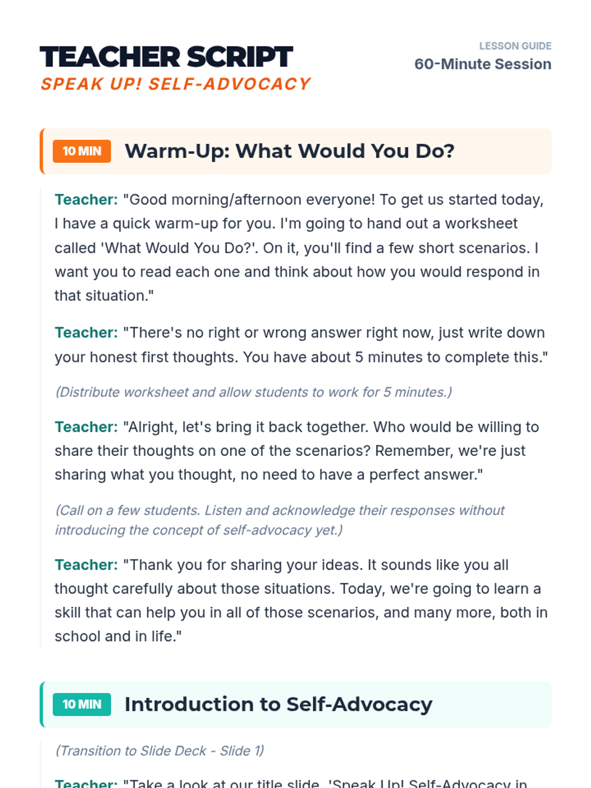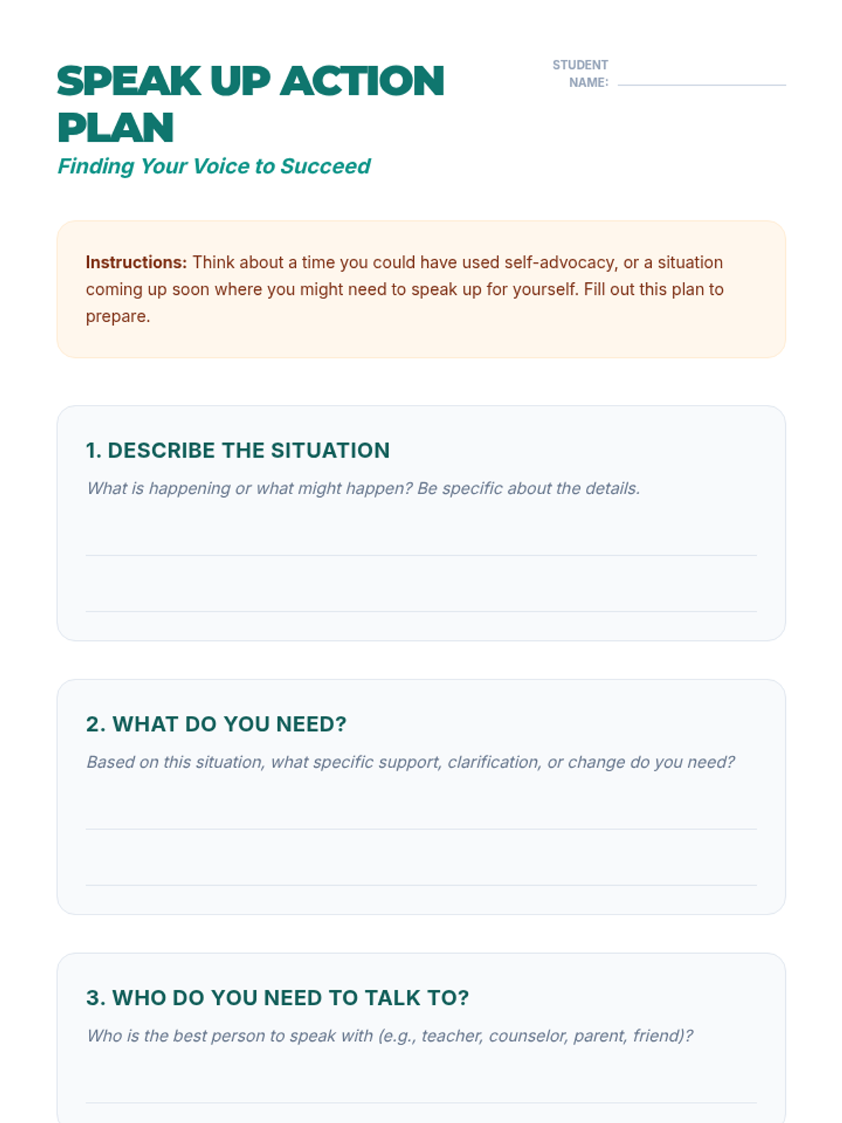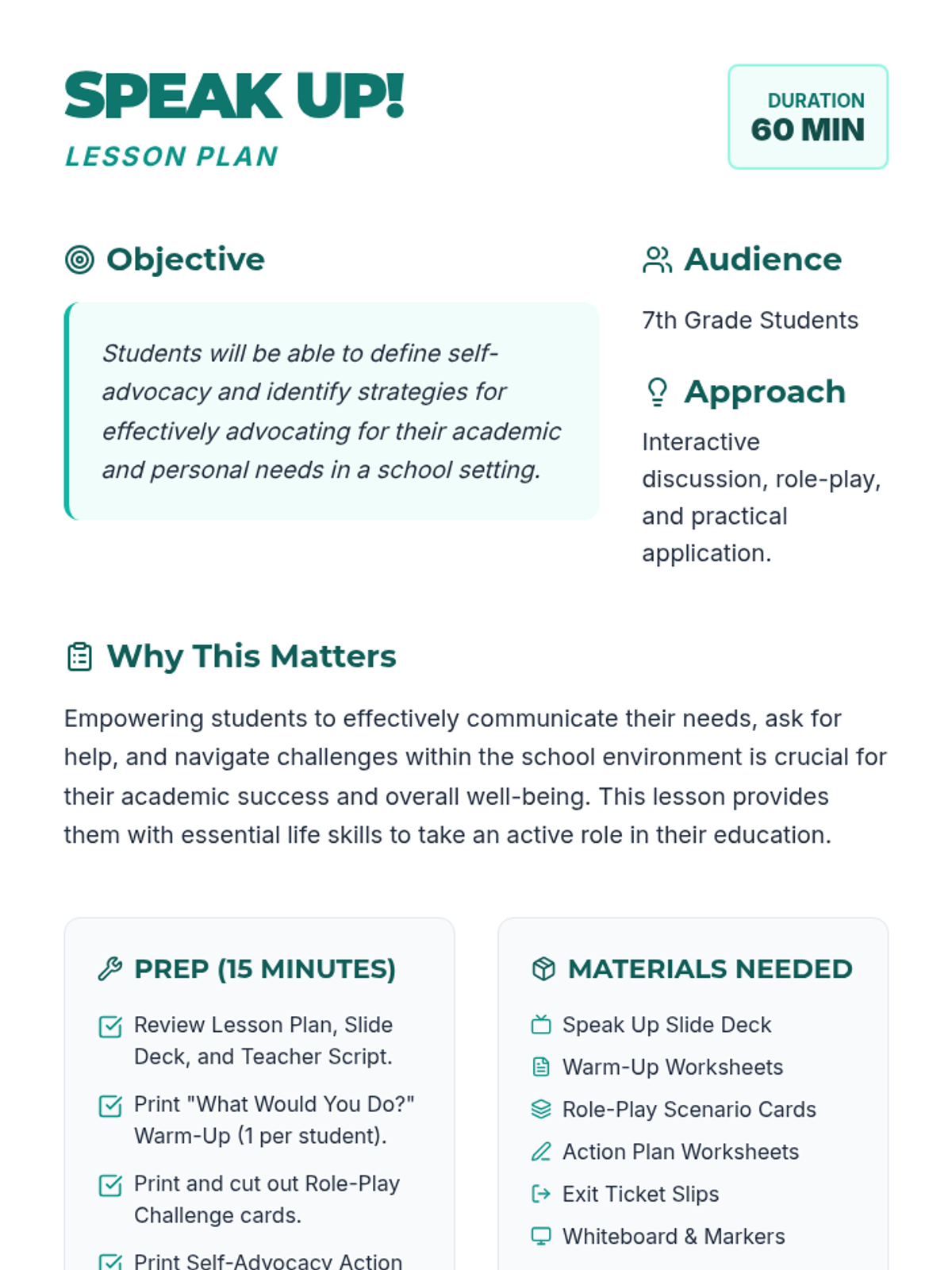 This 60-minute lesson empowers 7th-grade students to define self-advocacy and apply practical strategies for communicating their needs effectively in school. Students engage in discussions, role-playing, and individual action planning to build confidence in finding their voice.