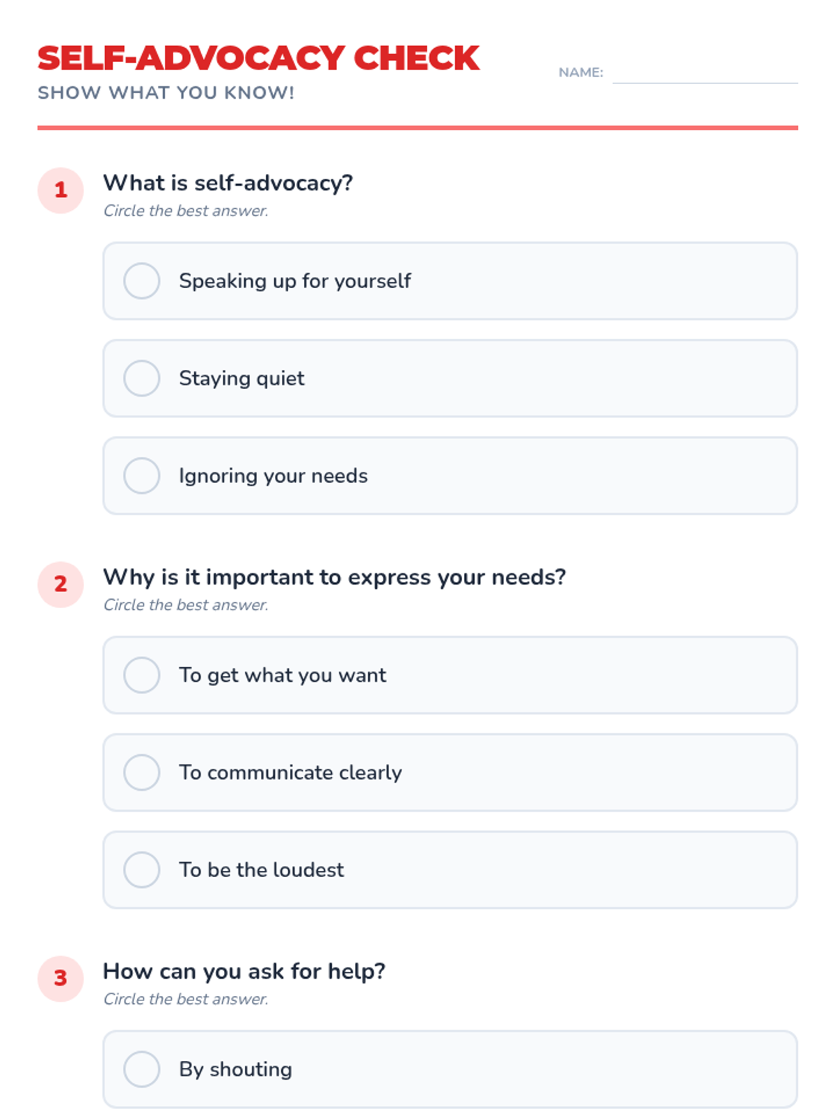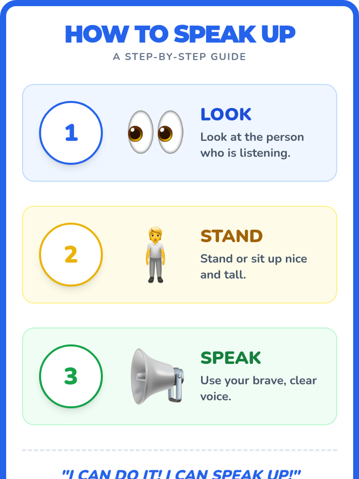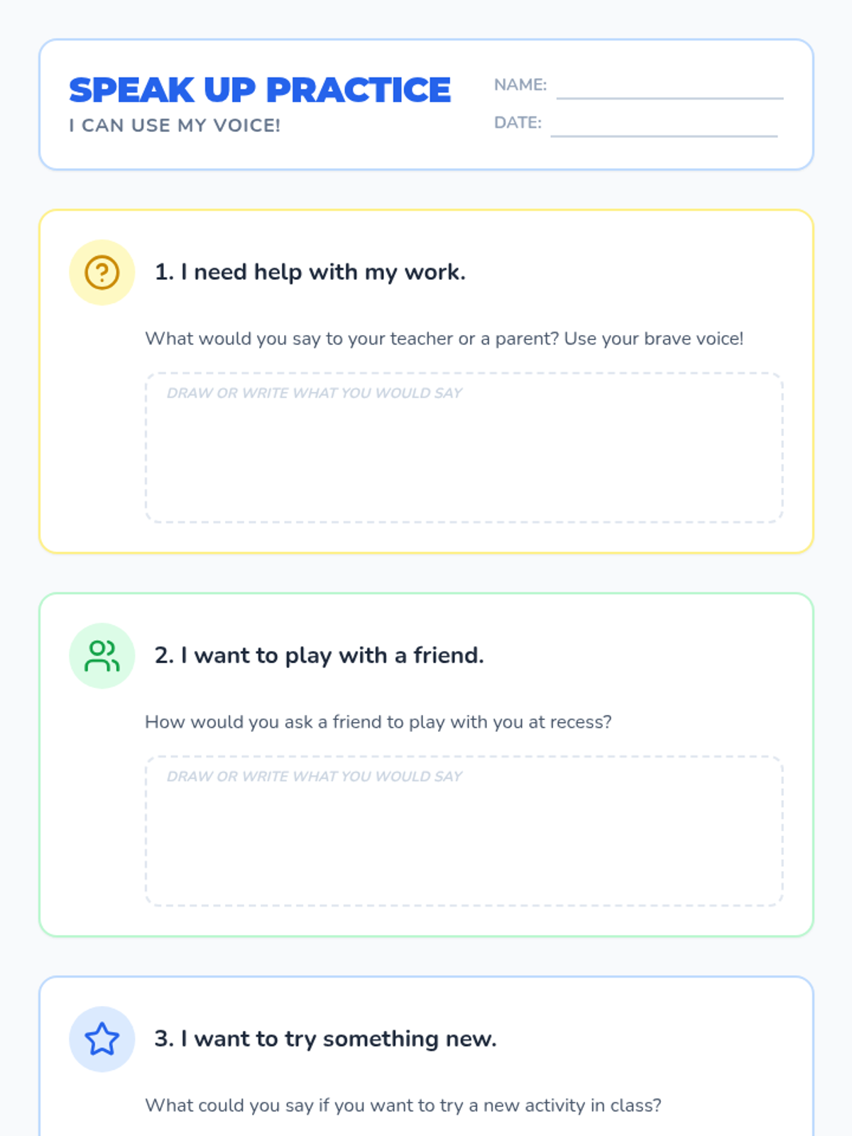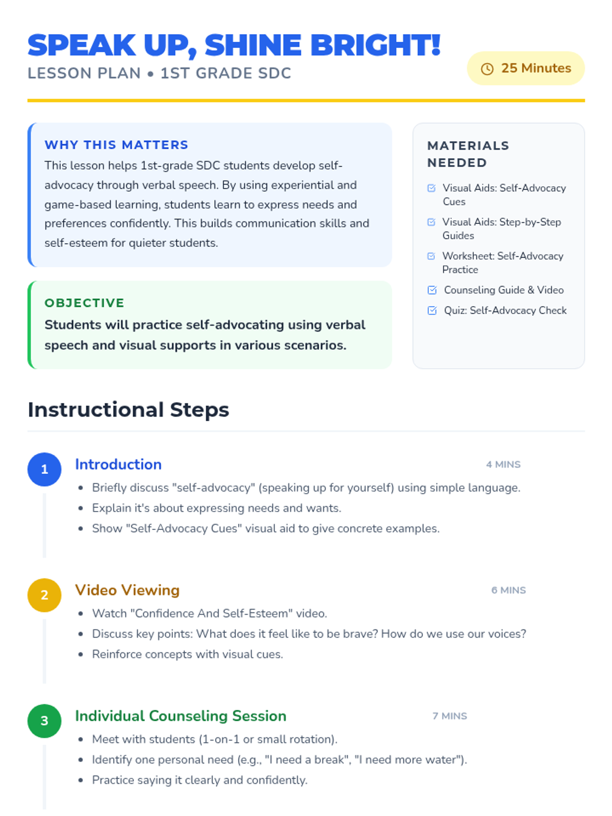 A lesson designed for 1st grade SDC students to develop self-advocacy through verbal speech, using visual aids, video, and individual counseling sessions.