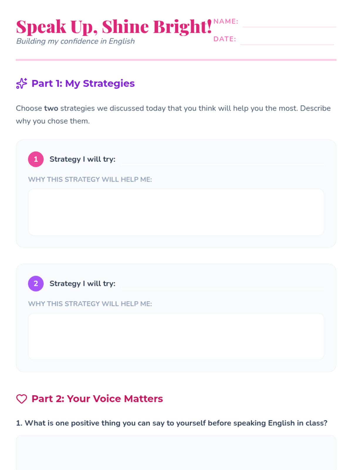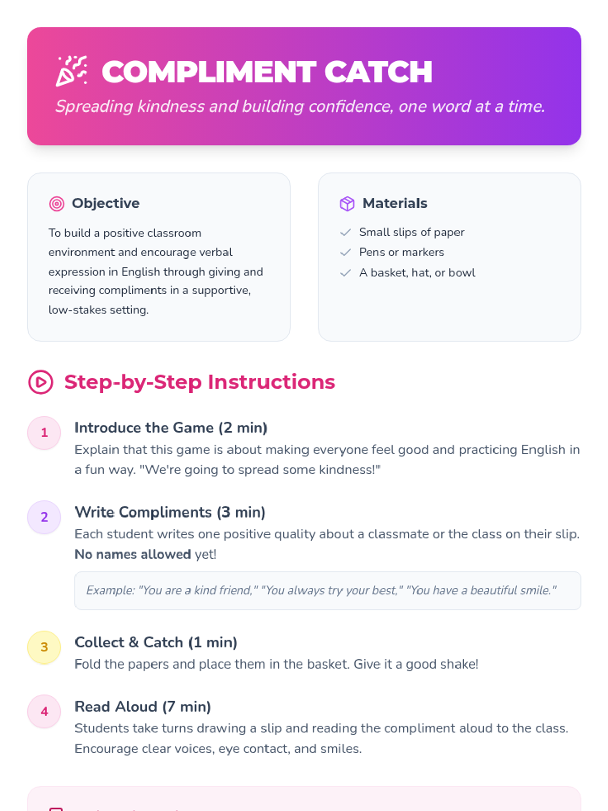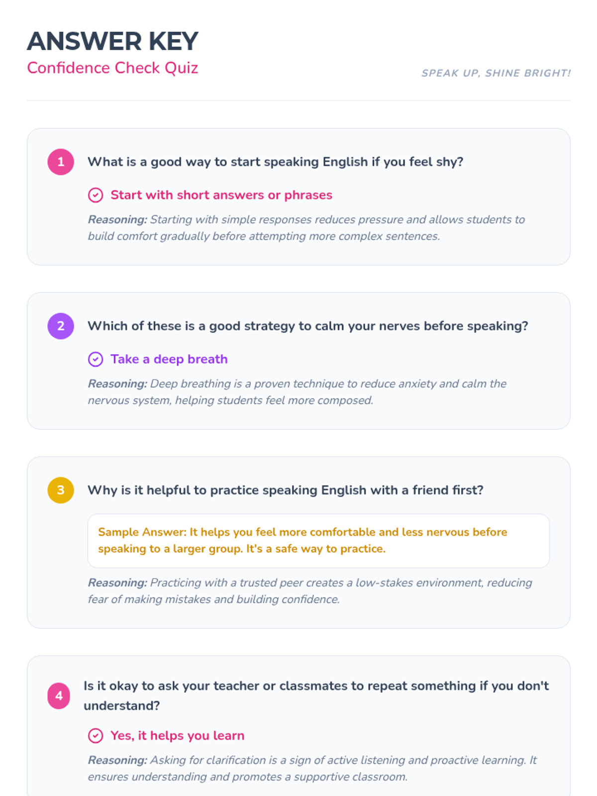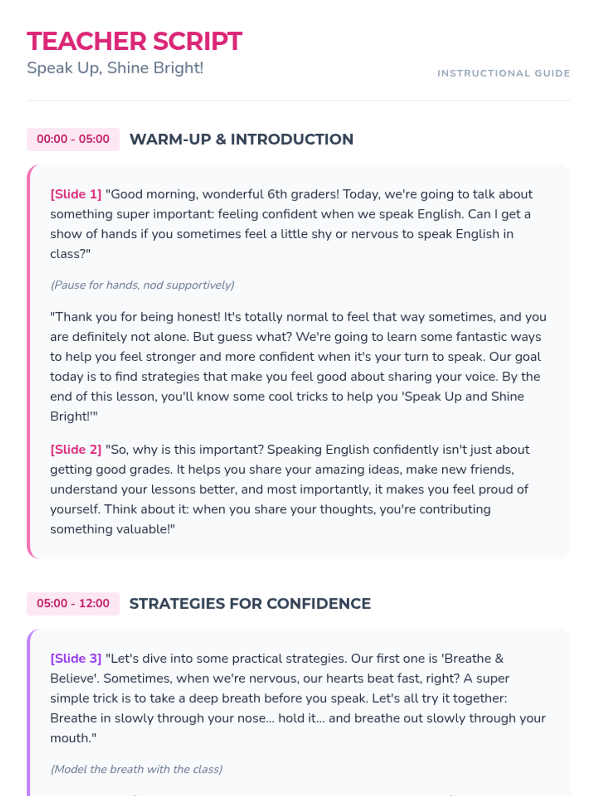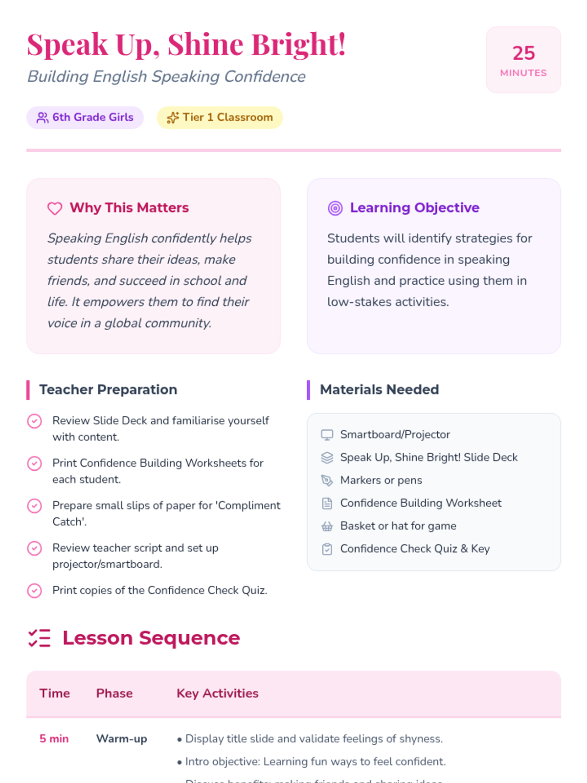 A 25-minute lesson for 6th-grade girls designed to build confidence in speaking English through practical strategies, supportive activities, and a positive classroom environment.