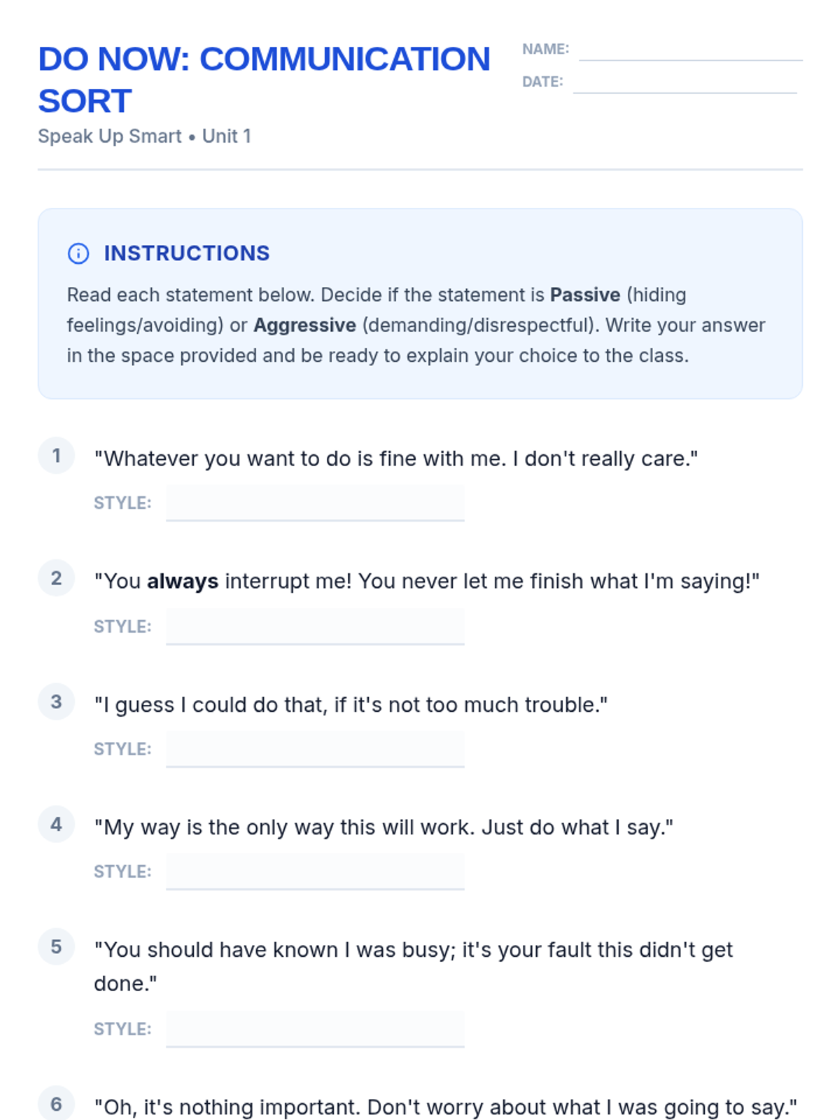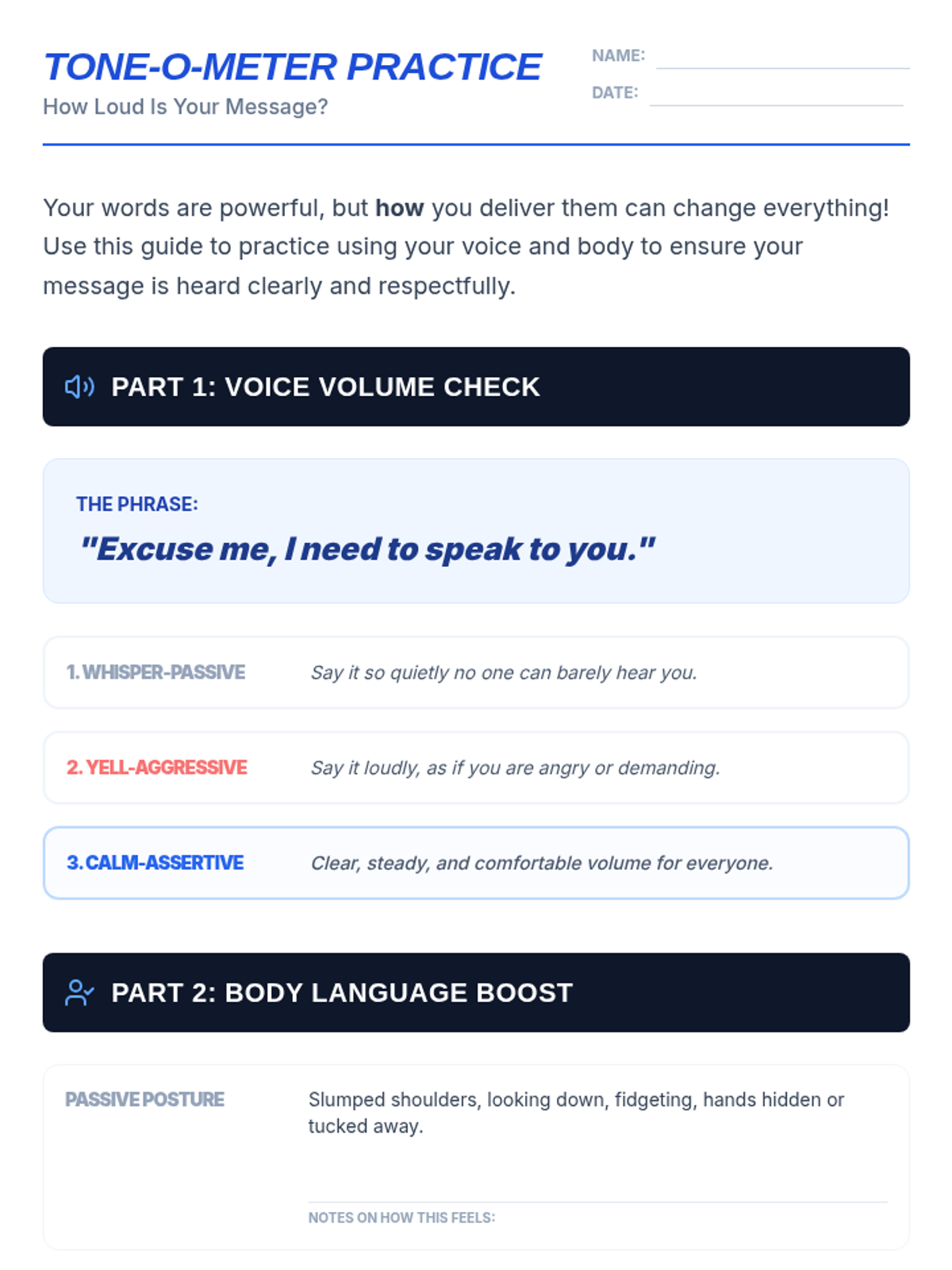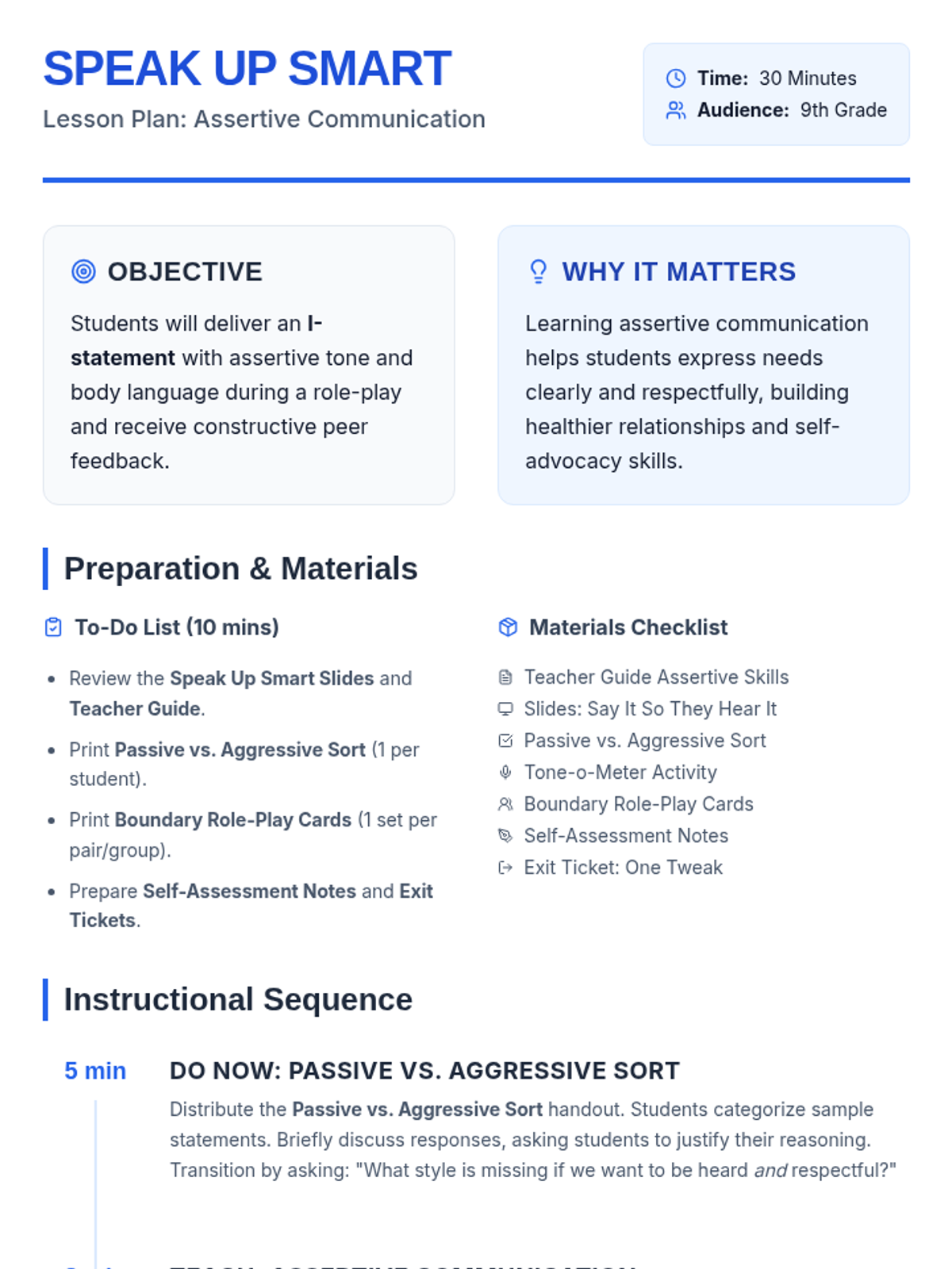 A 30-minute lesson for 9th-grade students on the power of assertive communication, focusing on 'I-statements', tone, and body language through role-play and peer feedback.