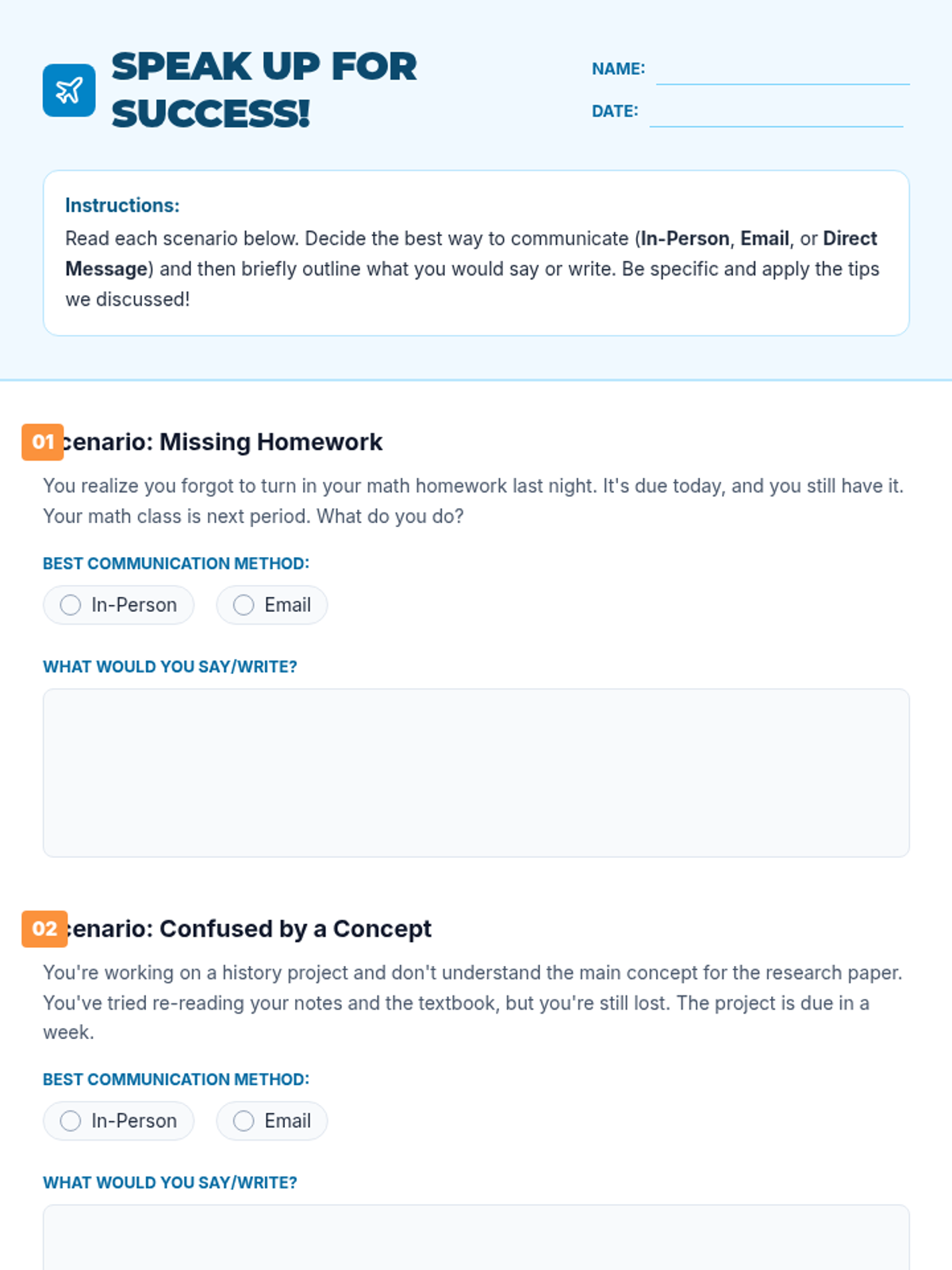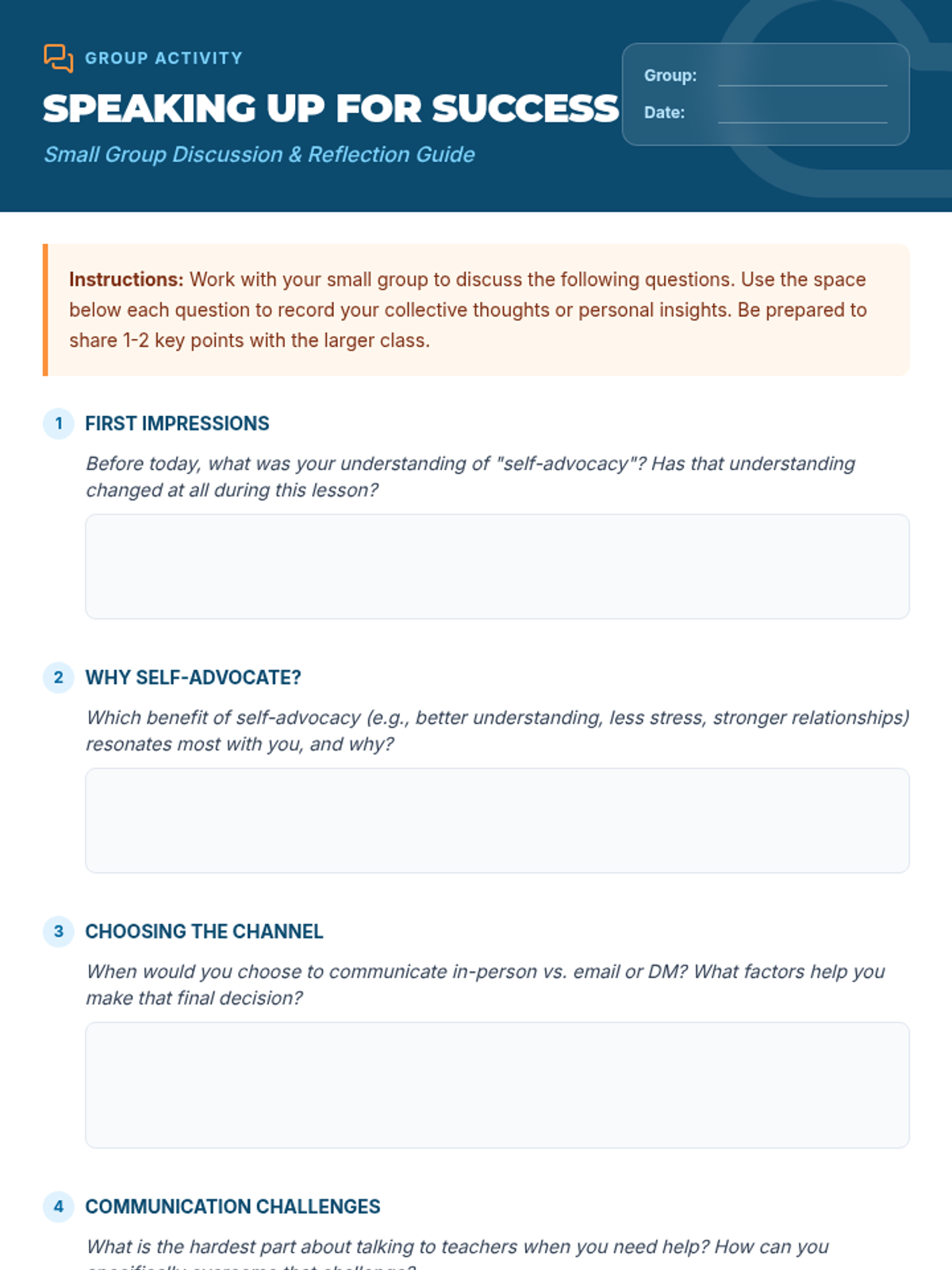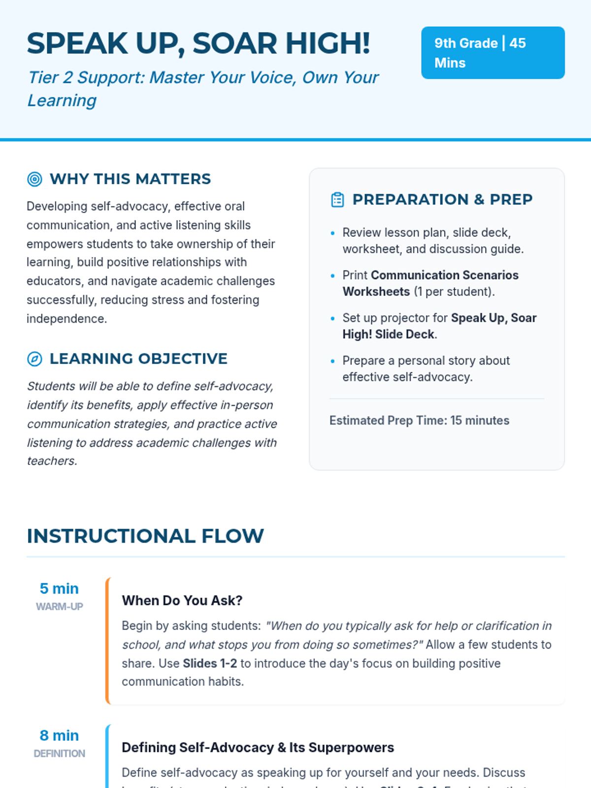 A 45-minute Tier 2 group lesson for 9th graders focused on developing self-advocacy, effective oral communication, and active listening skills to build positive teacher relationships and academic independence.