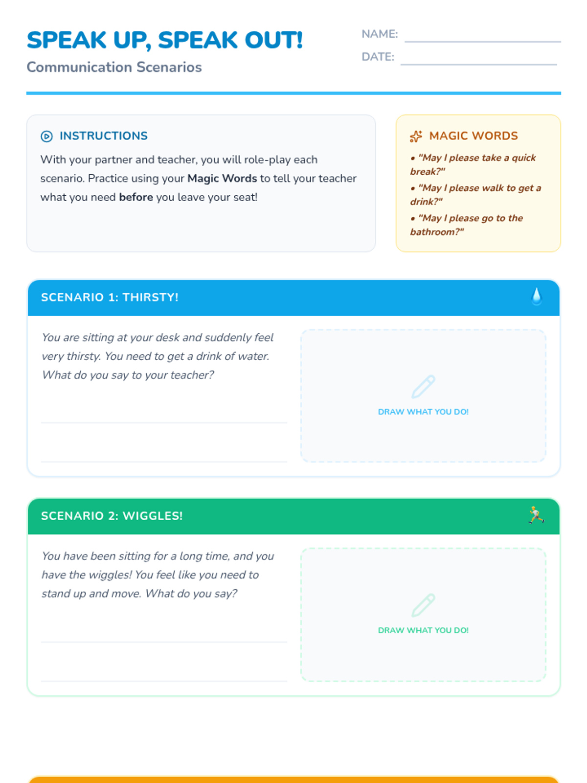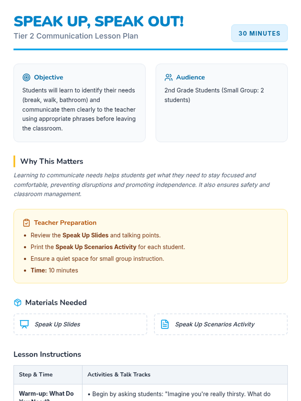 A 30-minute Tier 2 social-emotional learning lesson for second-grade students to practice communicating their physical and emotional needs to a teacher before leaving their seats.