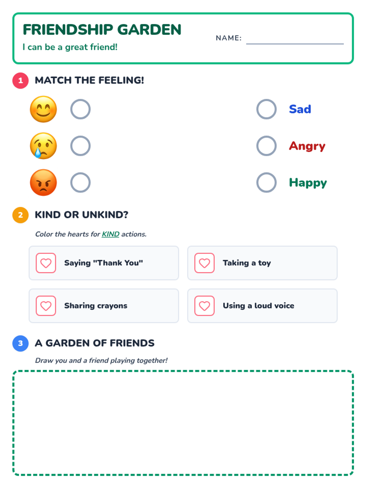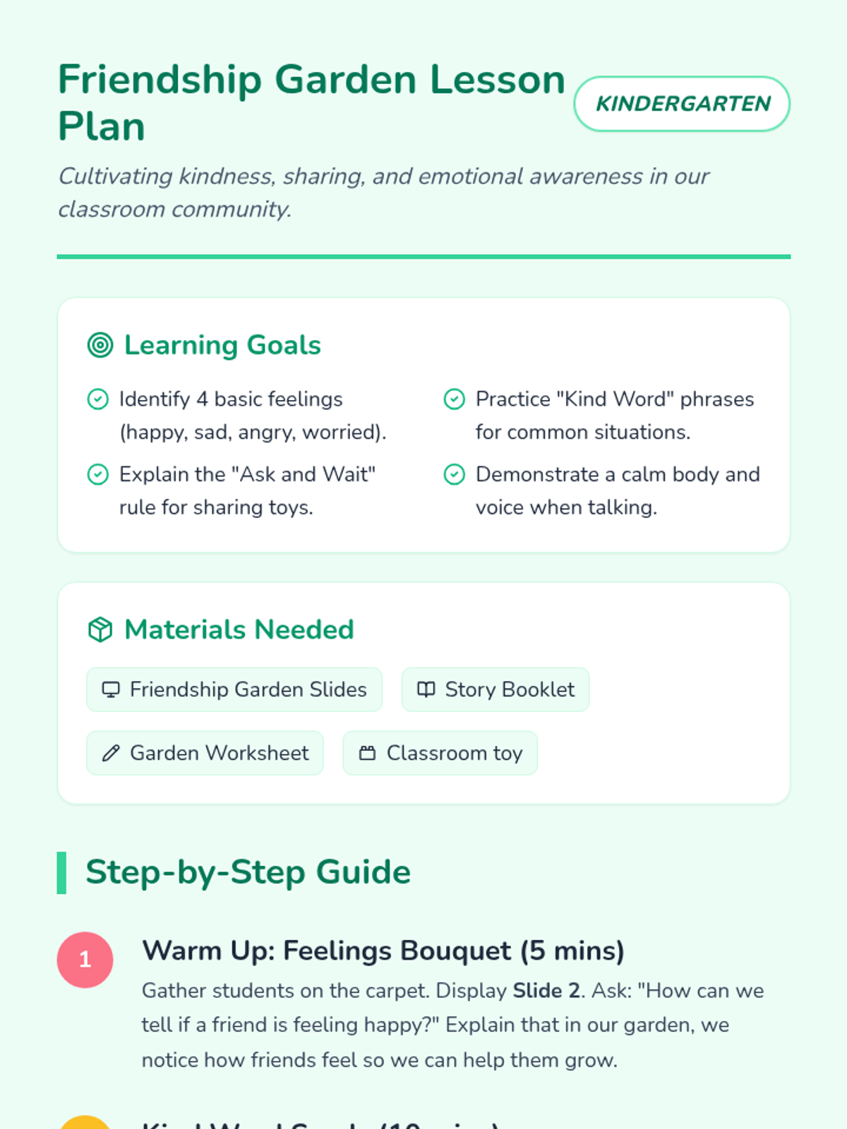 A comprehensive Kindergarten lesson focused on core friendship skills: sharing, kind words, identifying feelings, and respectful communication through the theme of a 'Friendship Garden'.