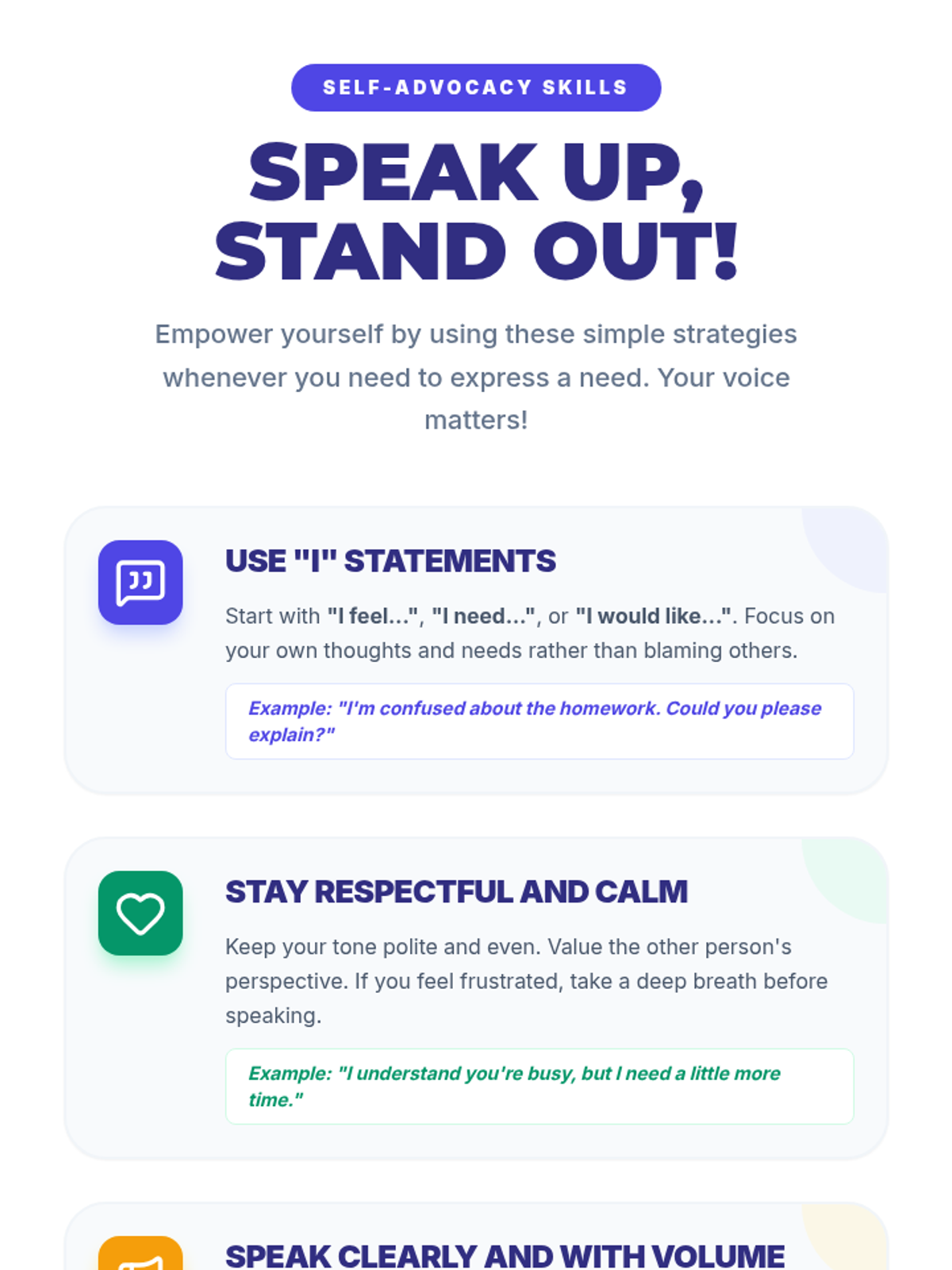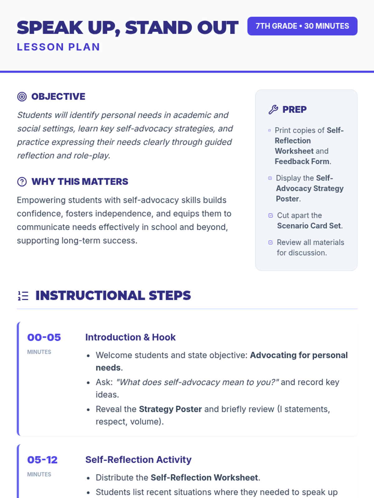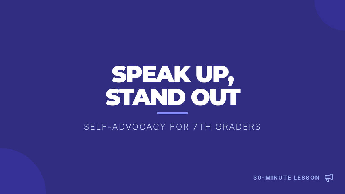 A 30-minute lesson for 7th-grade students on self-advocacy skills, covering communication strategies like 'I' statements and respectful tone through reflection and role-play.