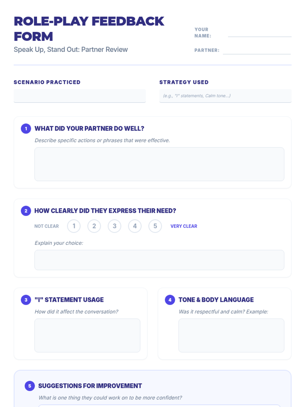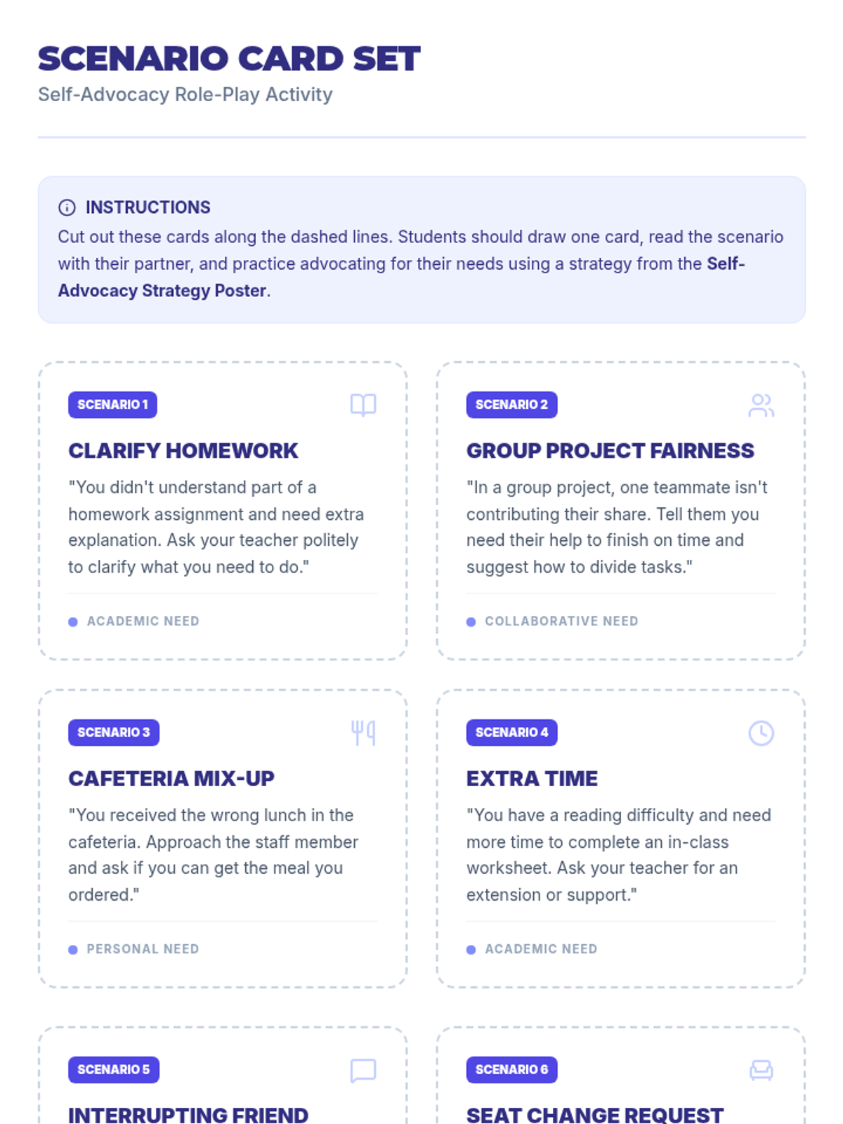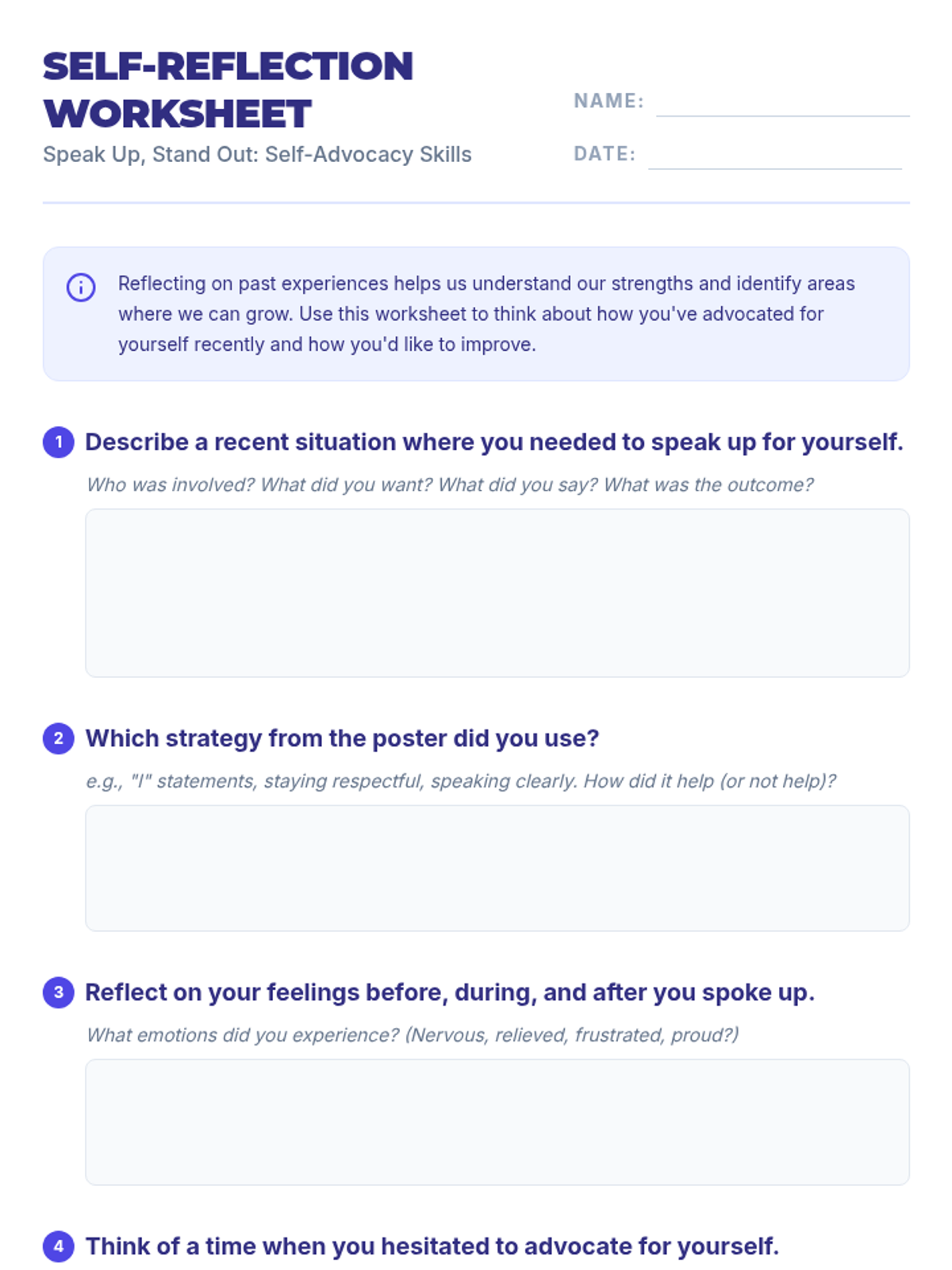 A 30-minute lesson for 7th-grade students on self-advocacy skills, covering communication strategies like 'I' statements and respectful tone through reflection and role-play.