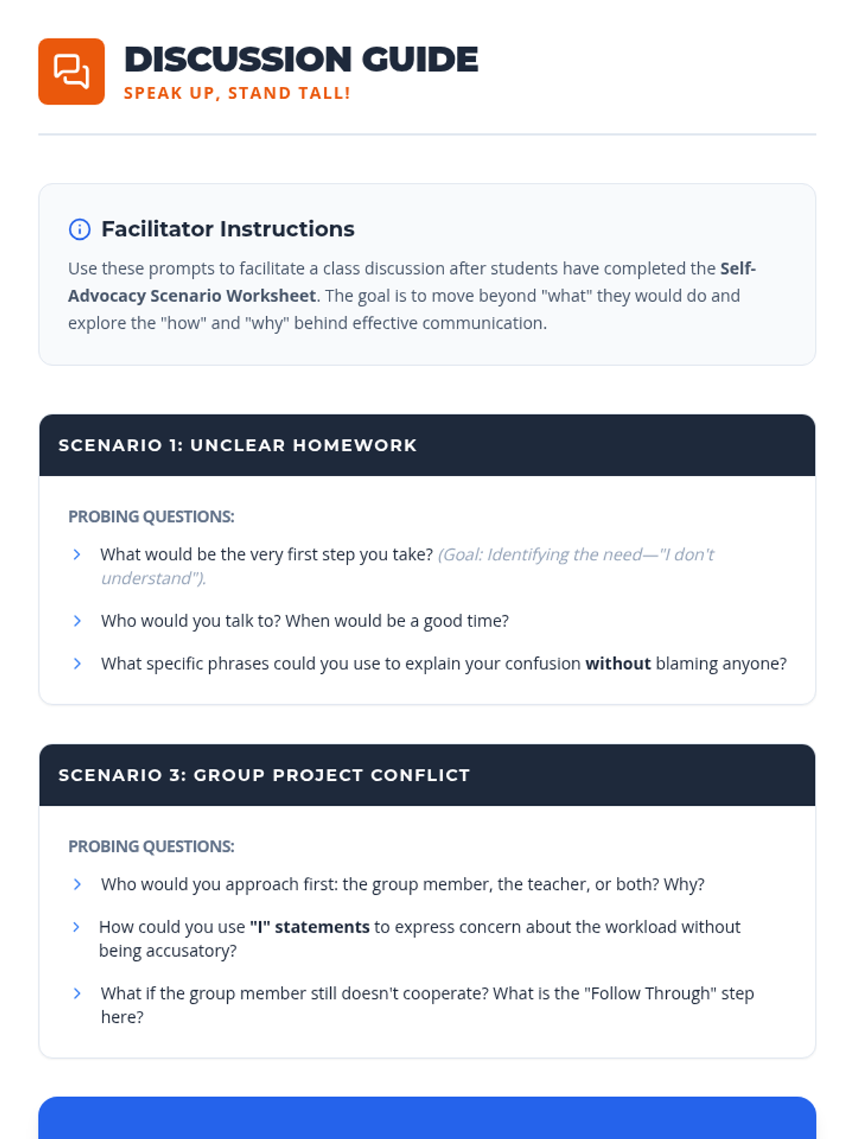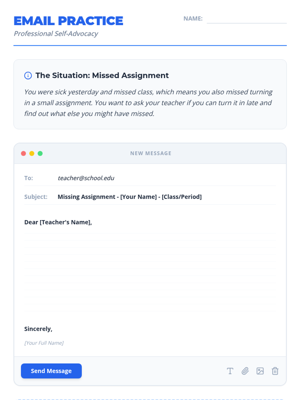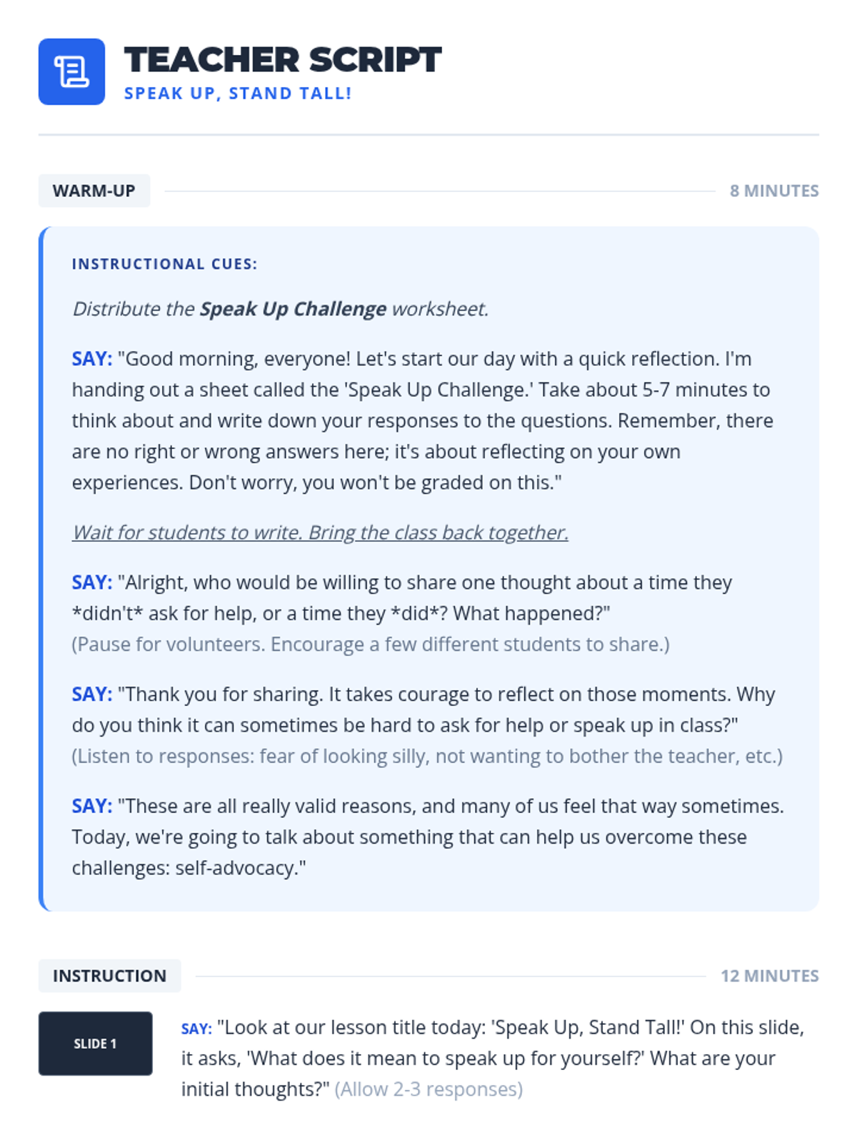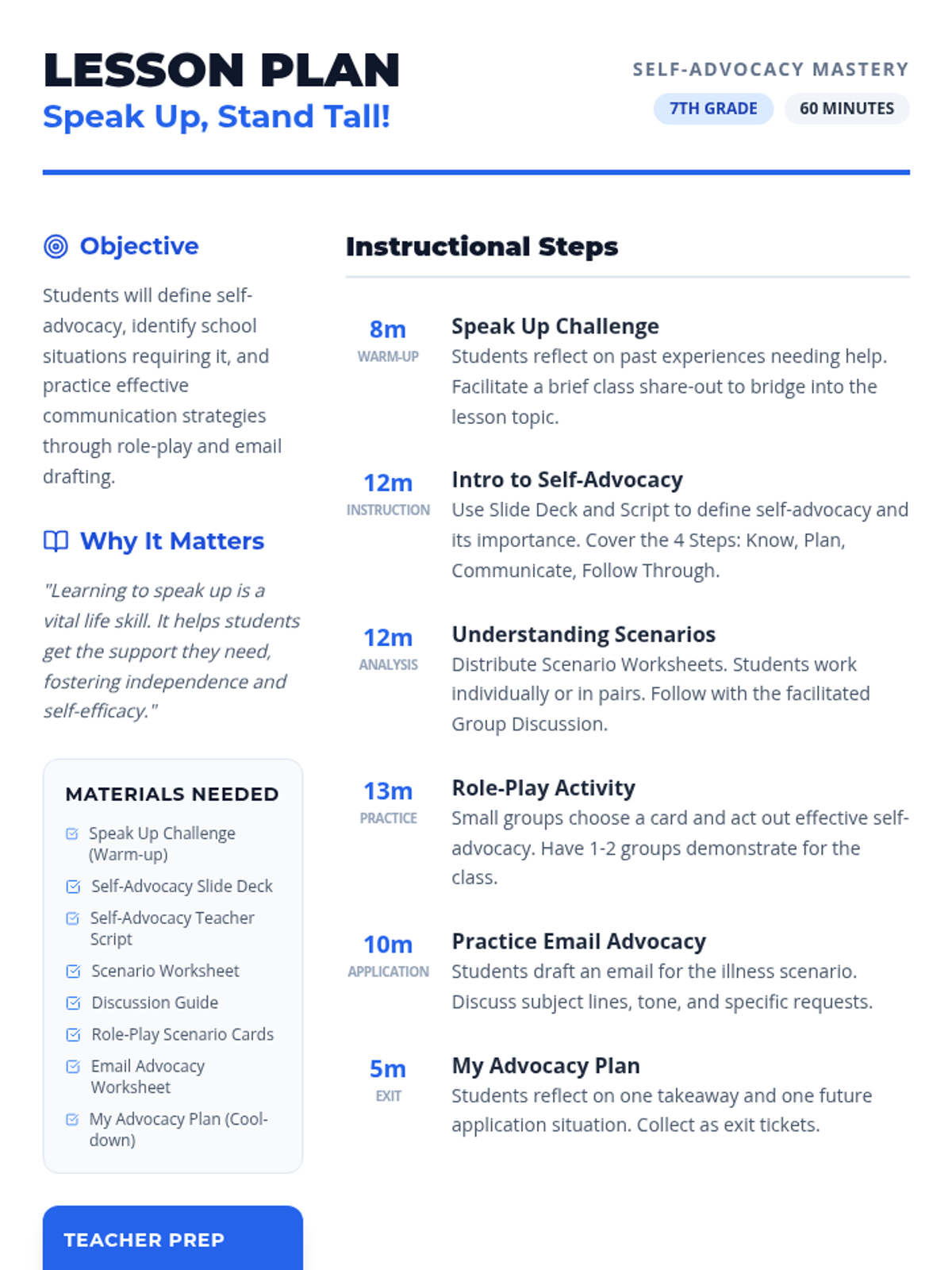 This 60-minute lesson empowers 7th-grade students to effectively advocate for themselves in academic settings by identifying their needs, planning their message, and communicating respectfully. Students practice these skills through reflection, role-playing, and drafting professional advocacy emails.