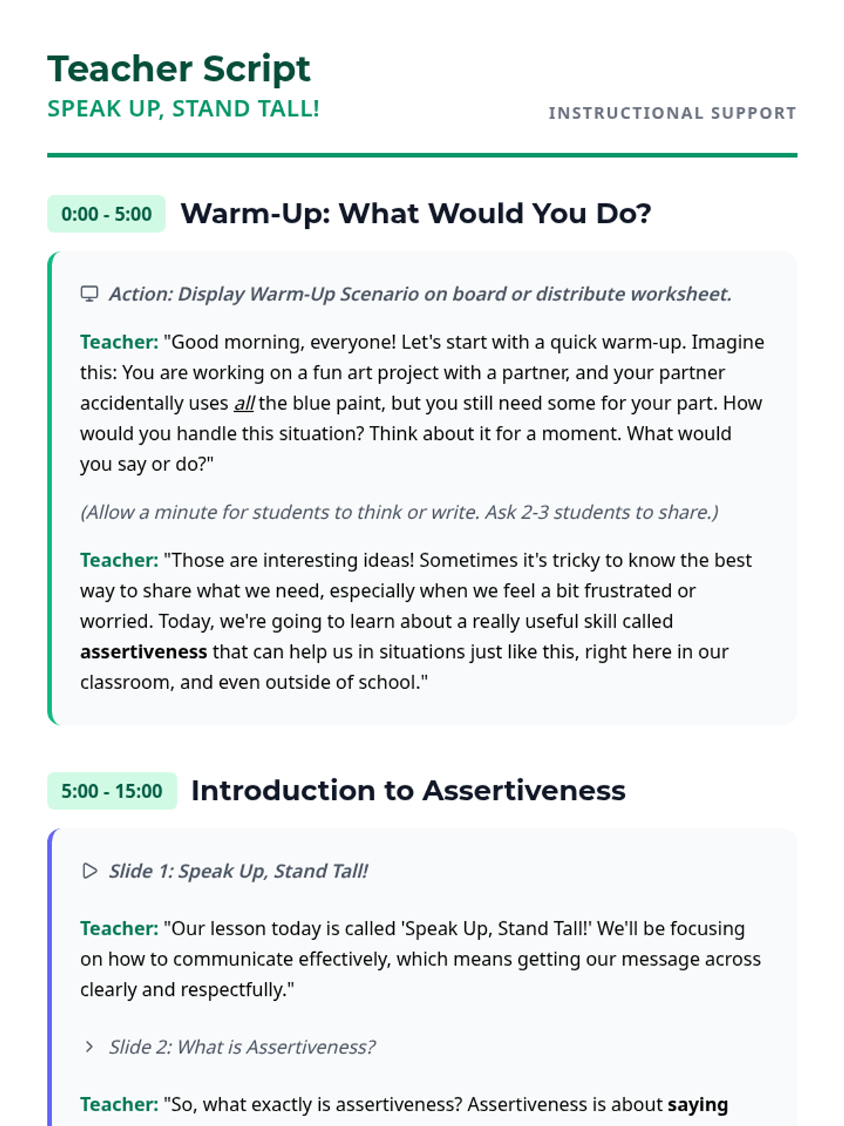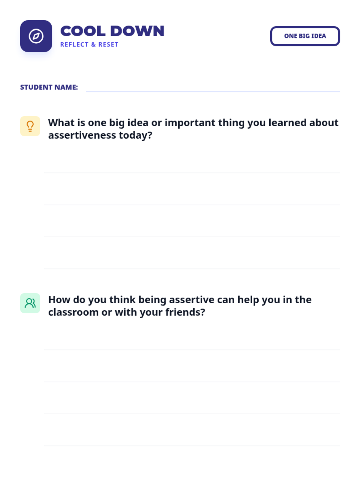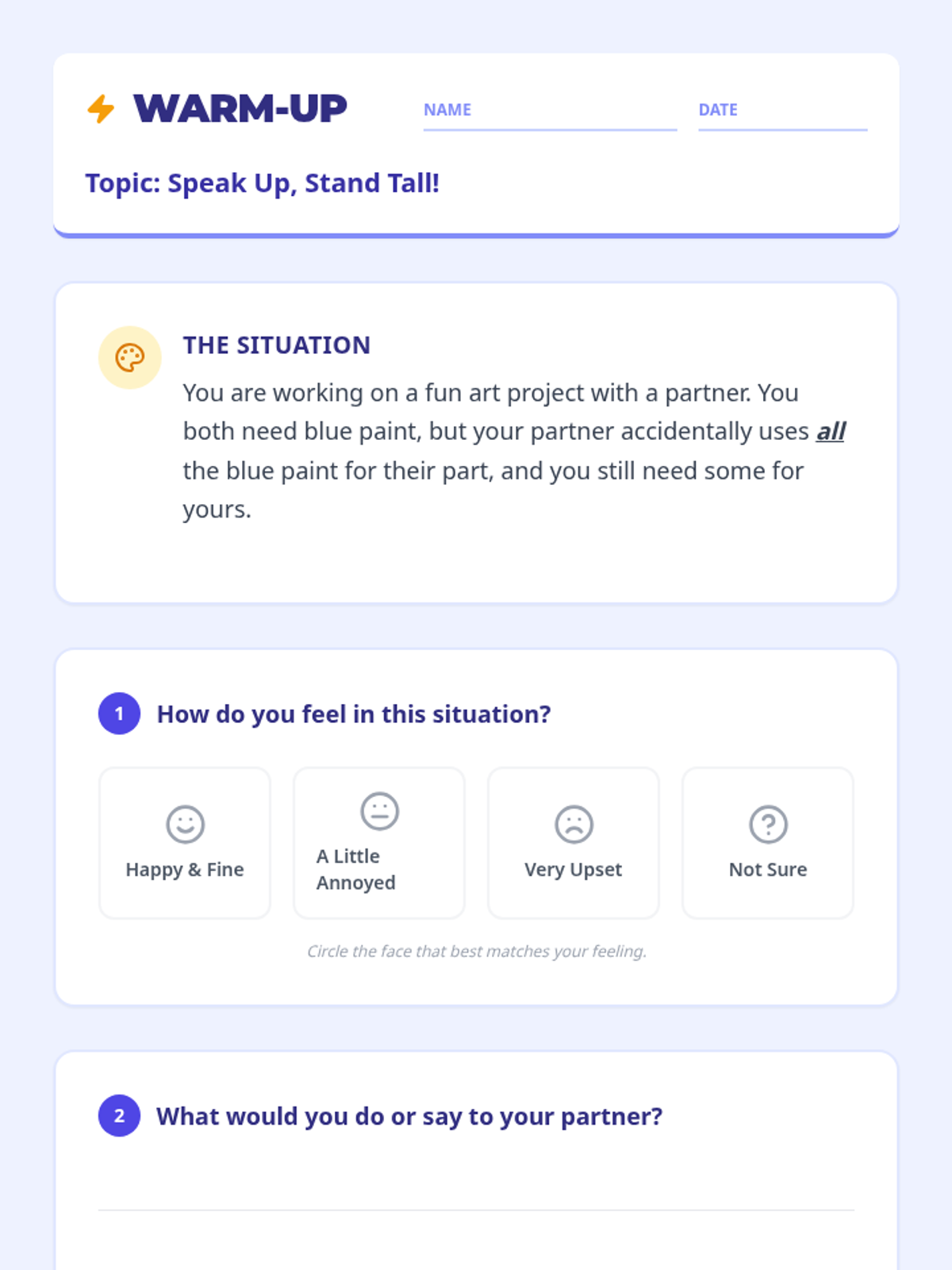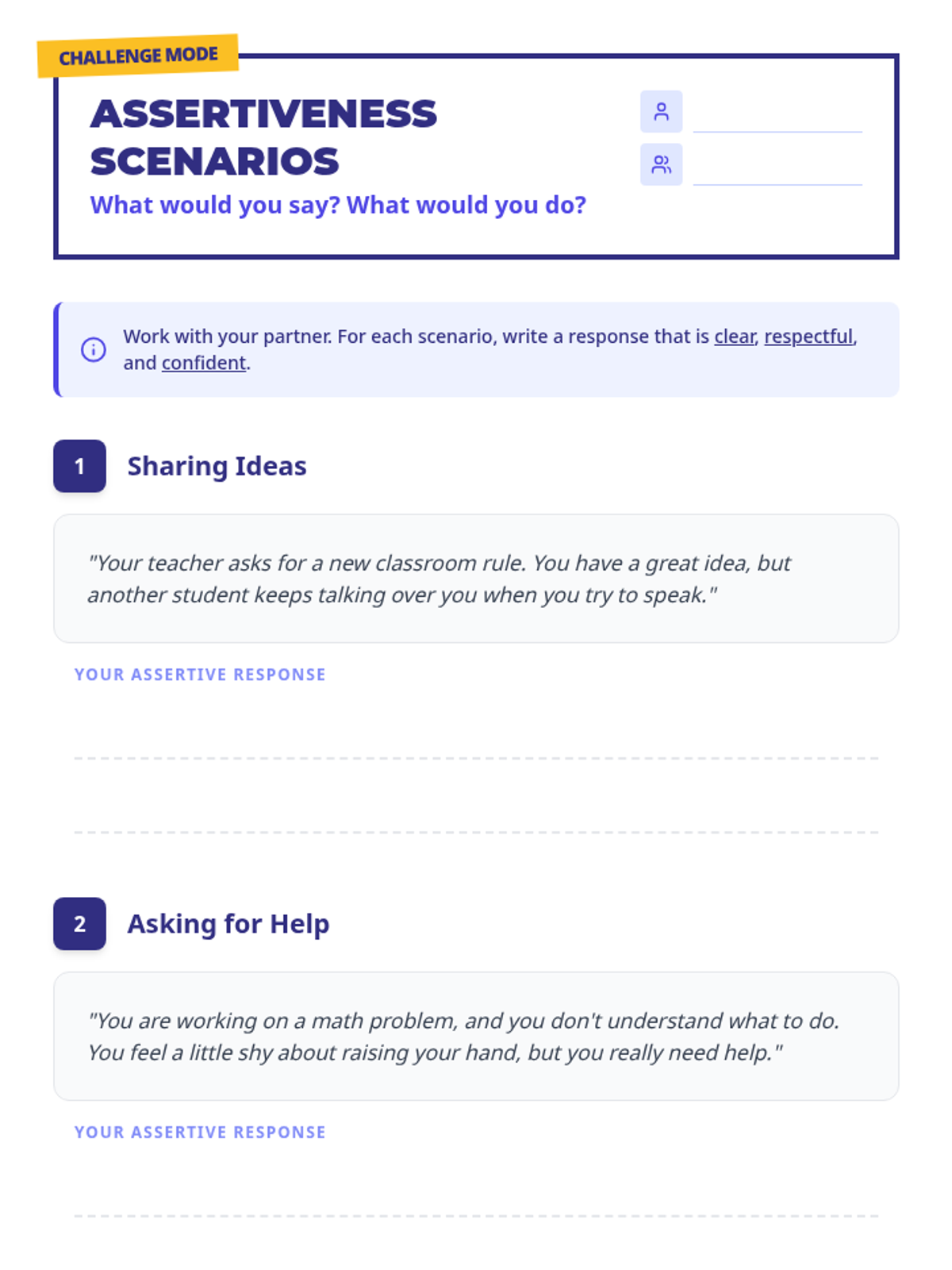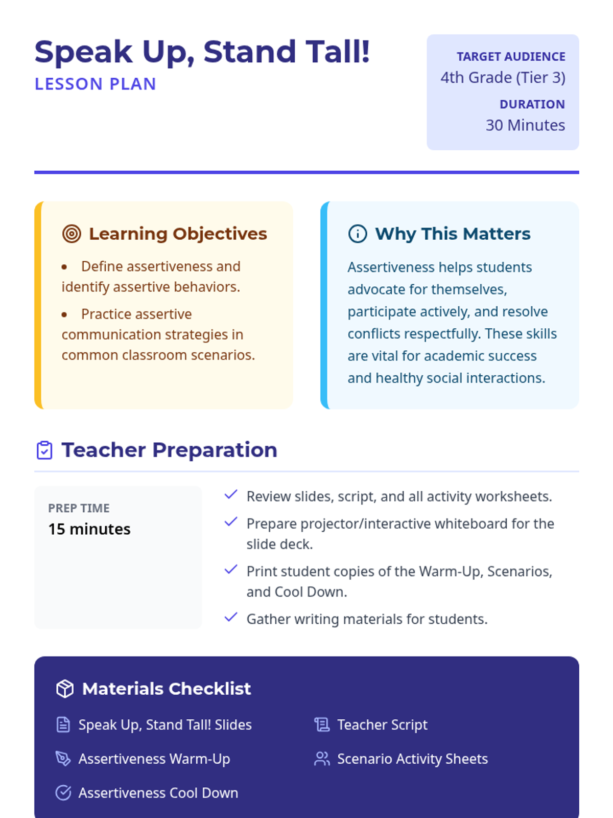 A 30-minute Tier 3 lesson for 4th graders to develop assertiveness skills, focusing on expressing needs and opinions respectfully through interactive scenarios and discussion.