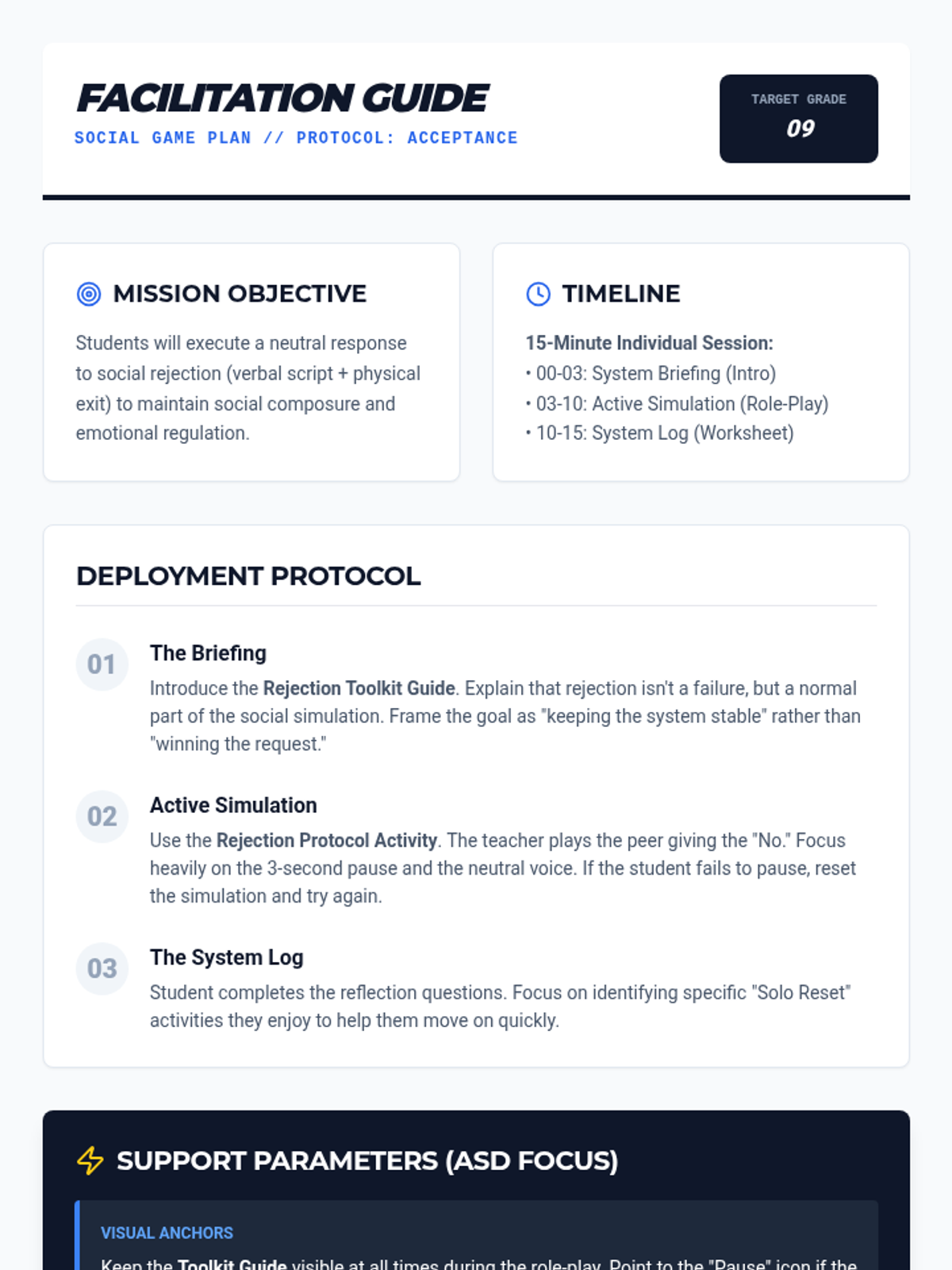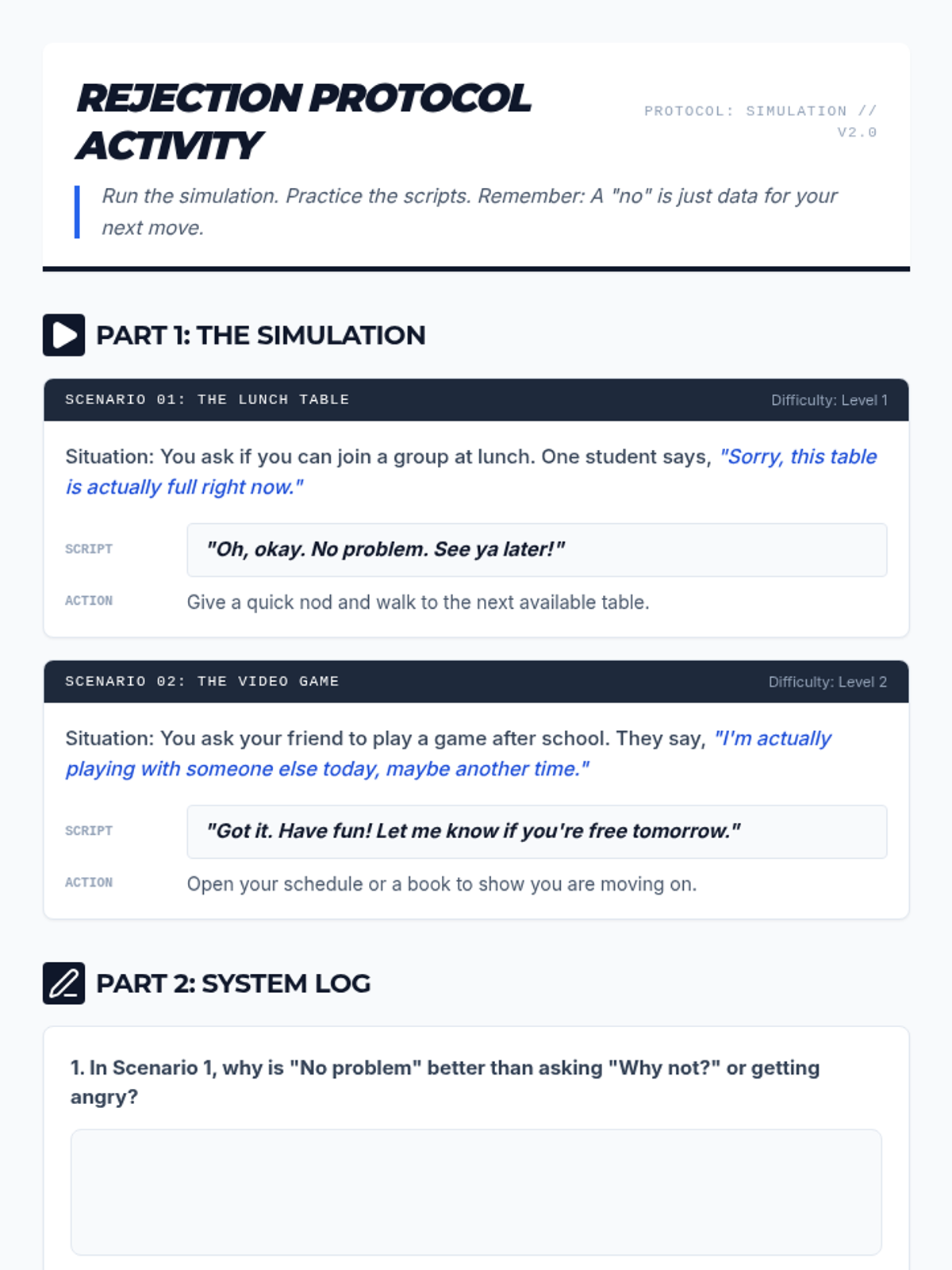 A targeted social-emotional learning lesson designed for high school students to navigate social rejection with composure and resilience. This lesson provides concrete scripts and a logical framework for processing 'no' in various contexts.