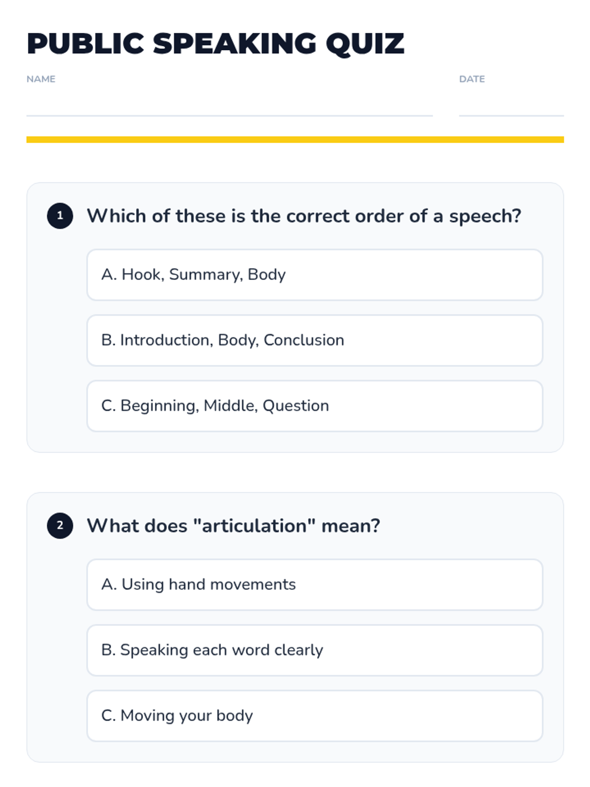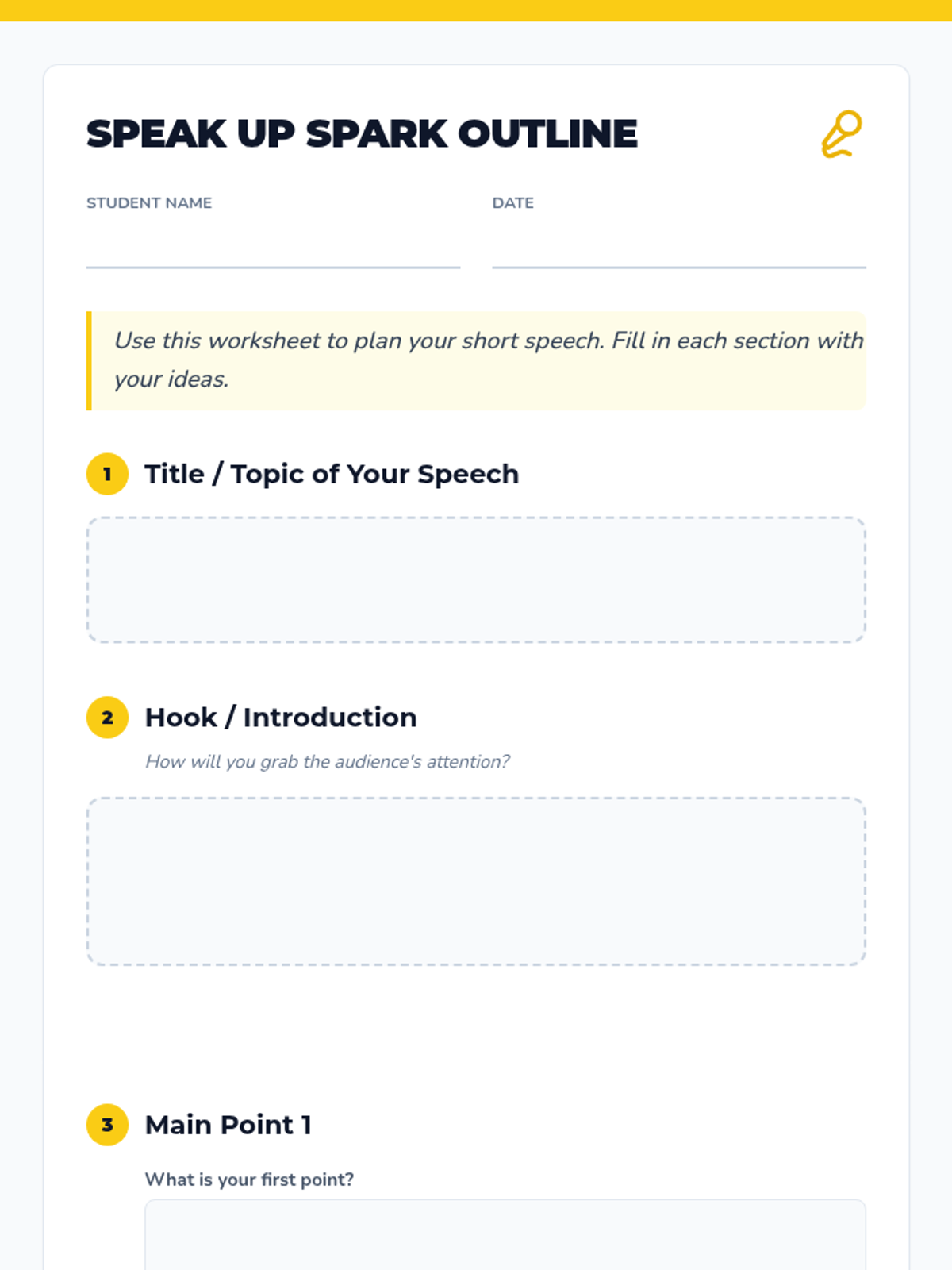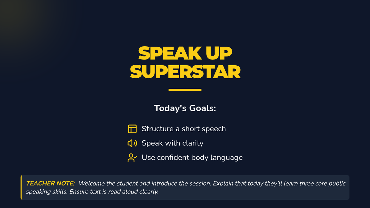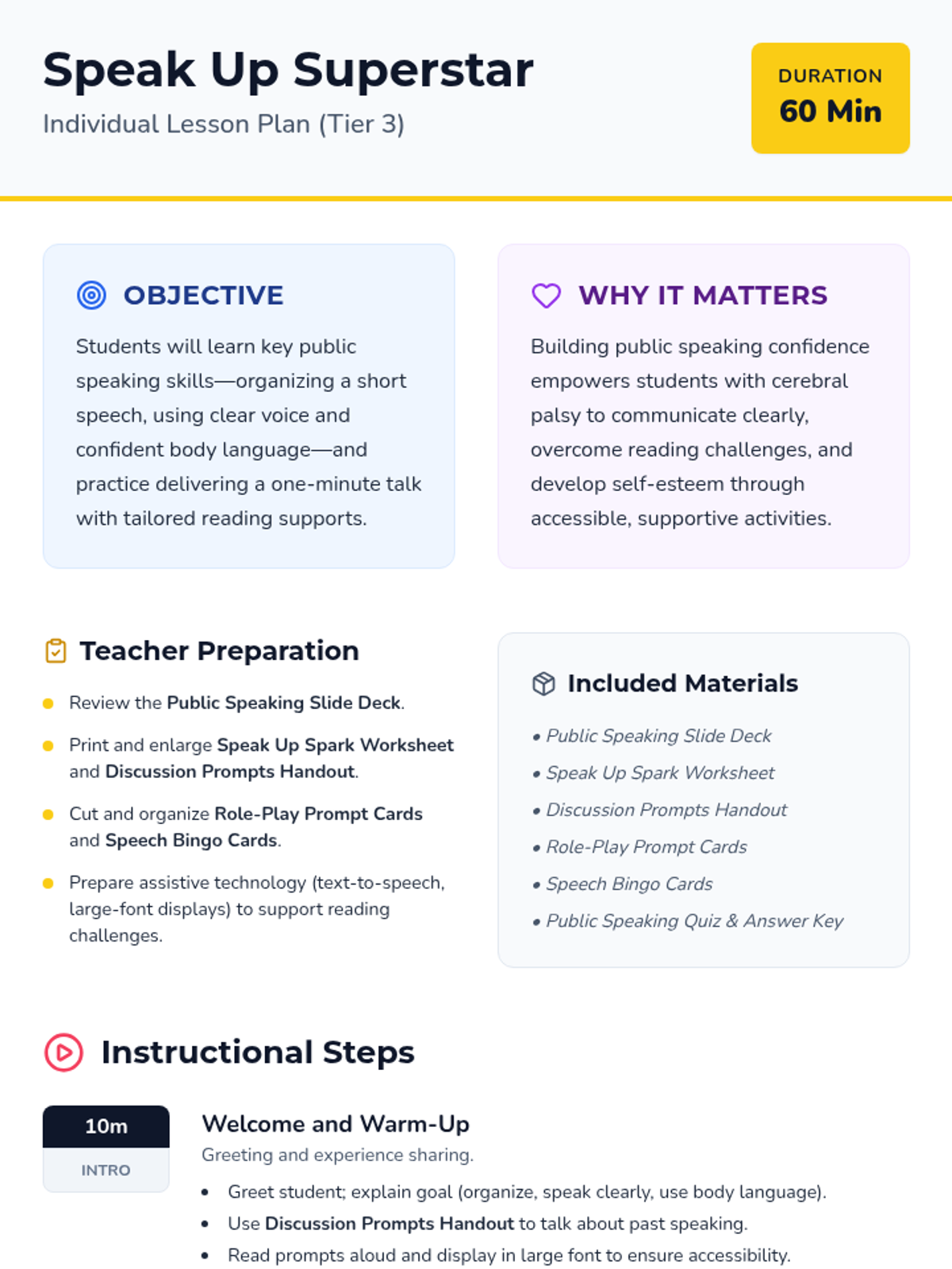 A 60-minute individual lesson designed to empower a student with cerebral palsy to build confidence and skills in public speaking using accessible, multisensory materials.
