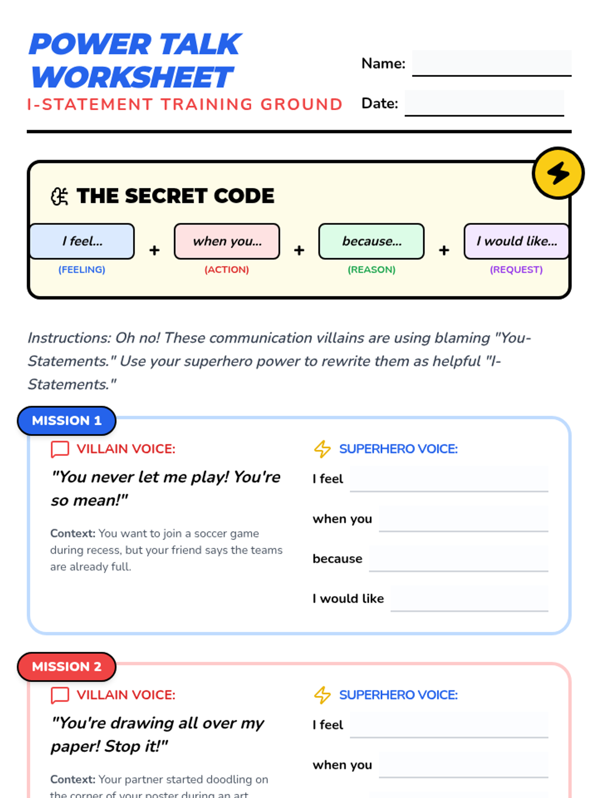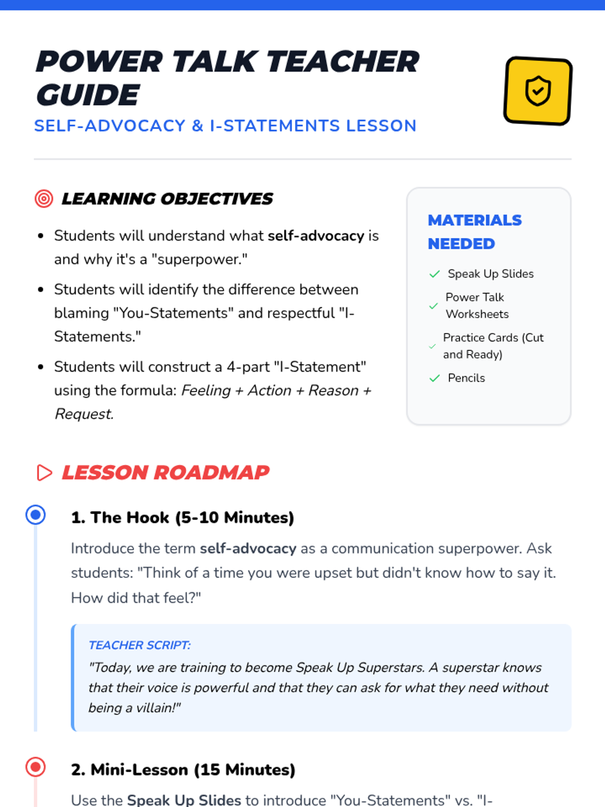 A lesson designed for third-graders to learn the power of 'I-Statements' as a tool for self-advocacy, helping them express their needs and wants clearly and respectfully.