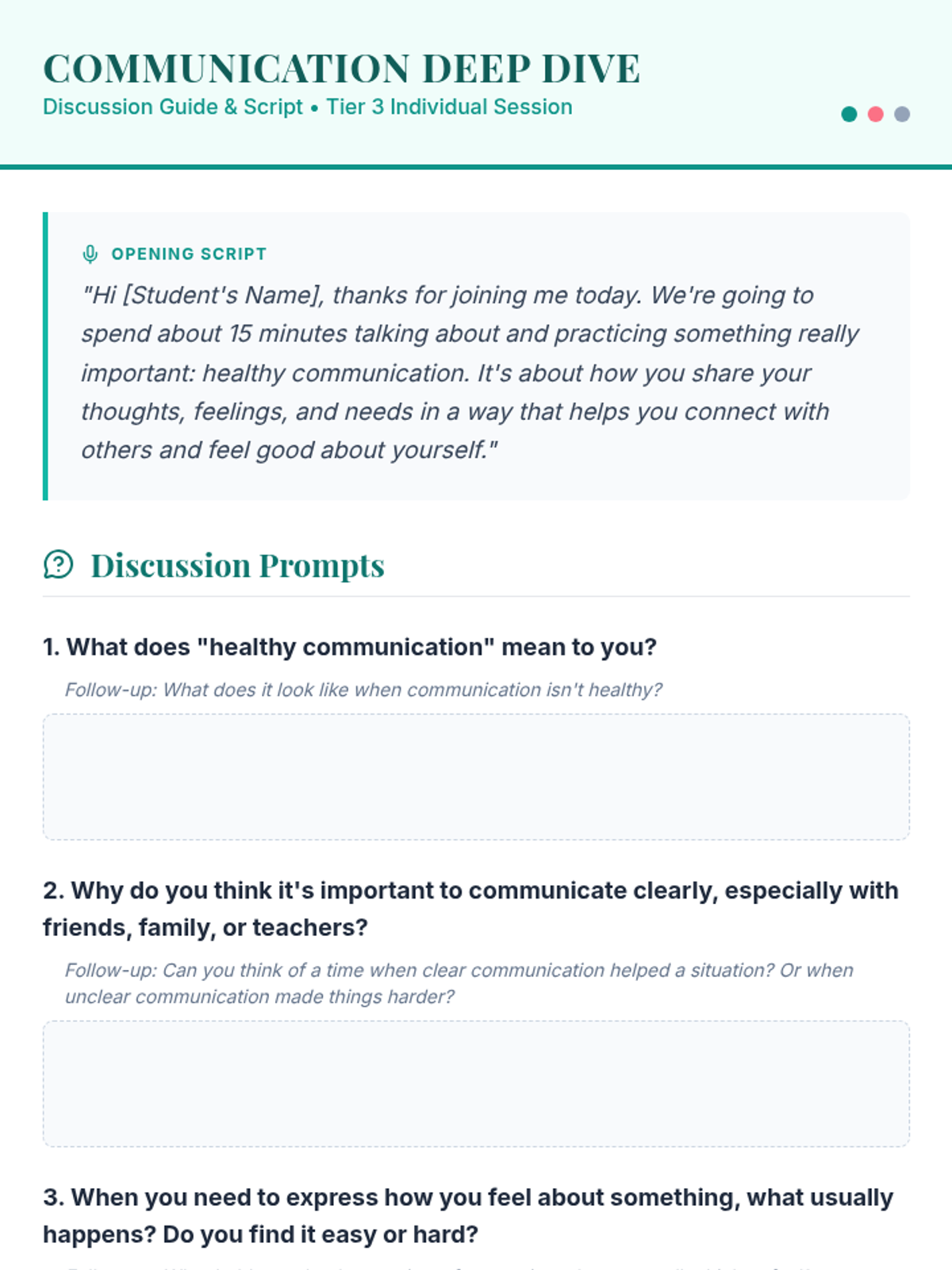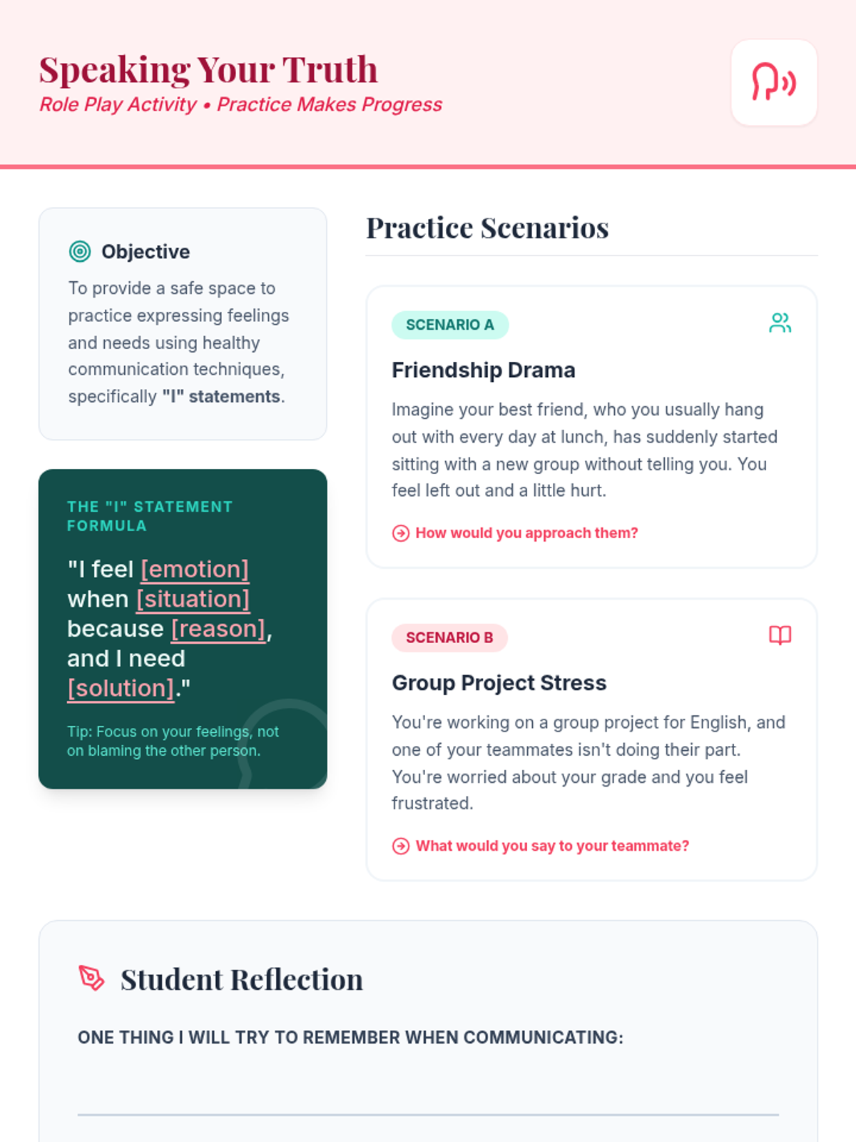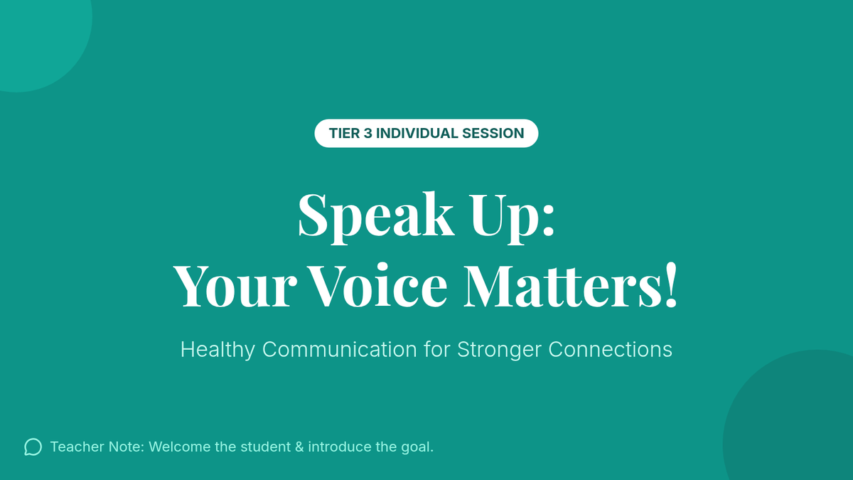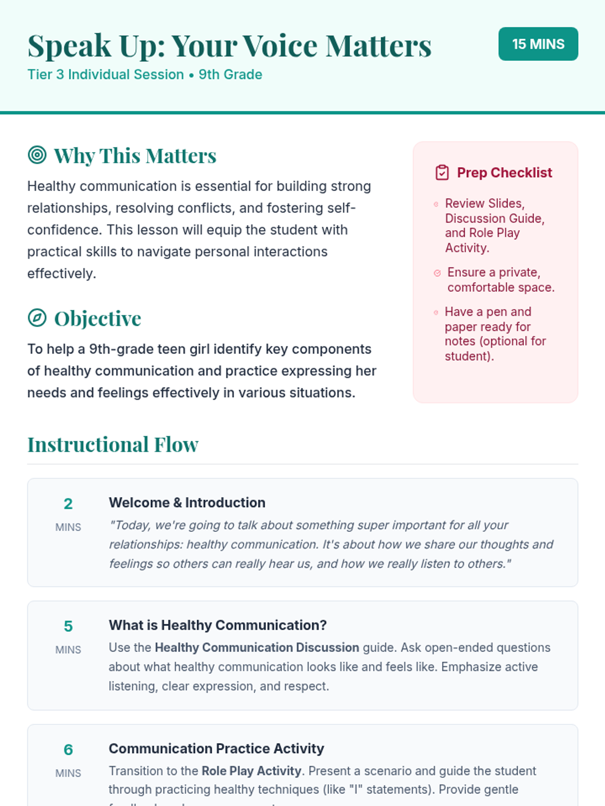 A 15-minute individual session for a 9th-grade teen girl to explore and practice healthy communication skills, helping her express herself clearly and build stronger relationships.