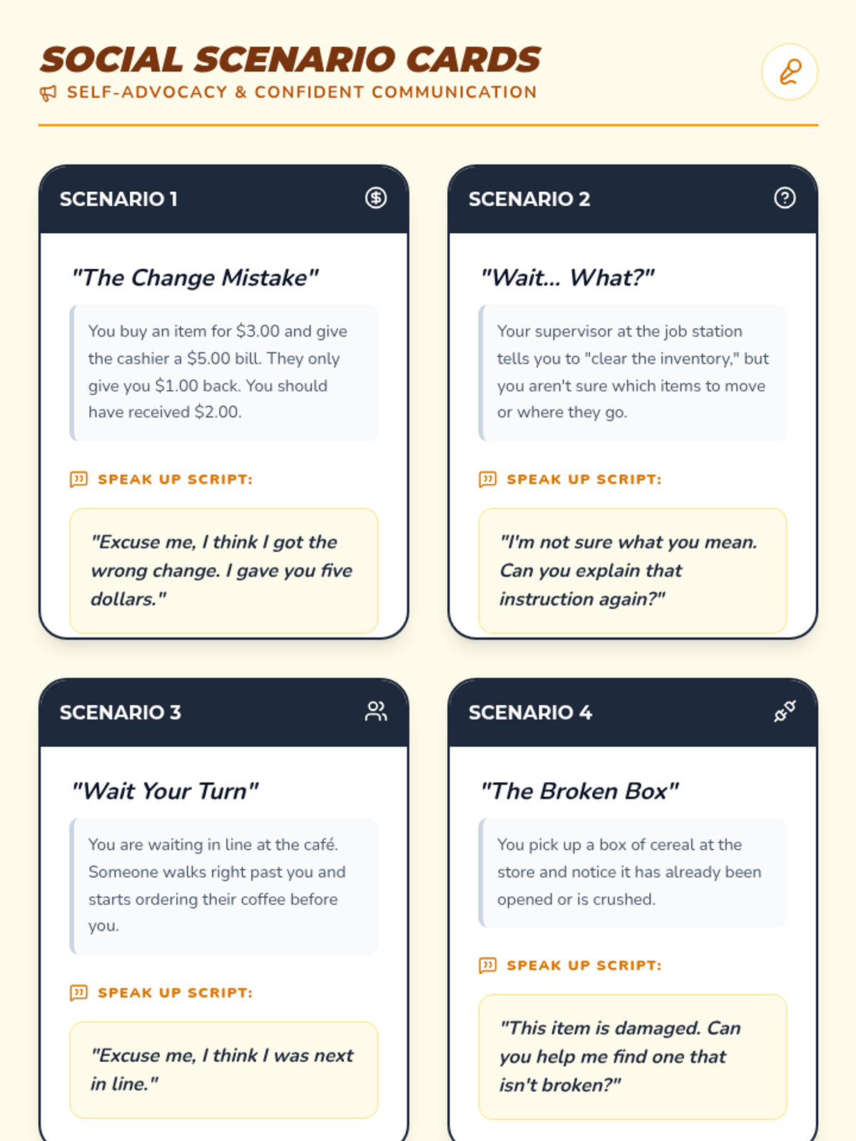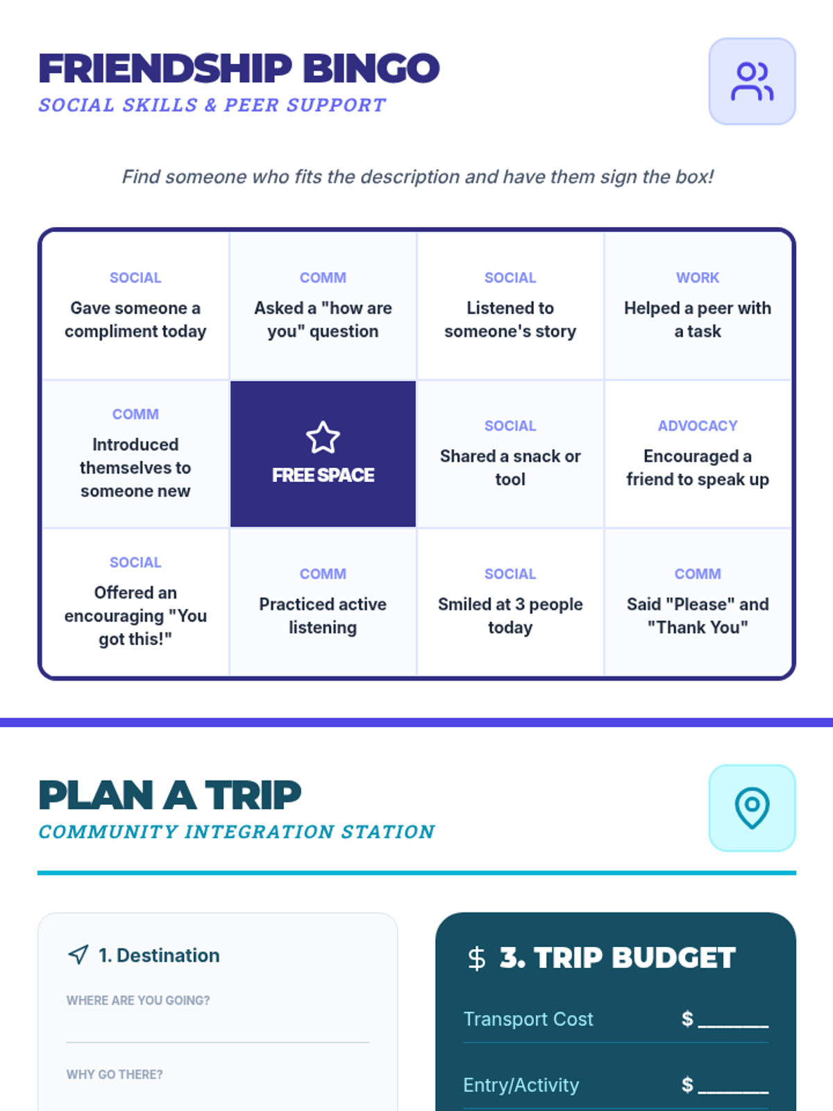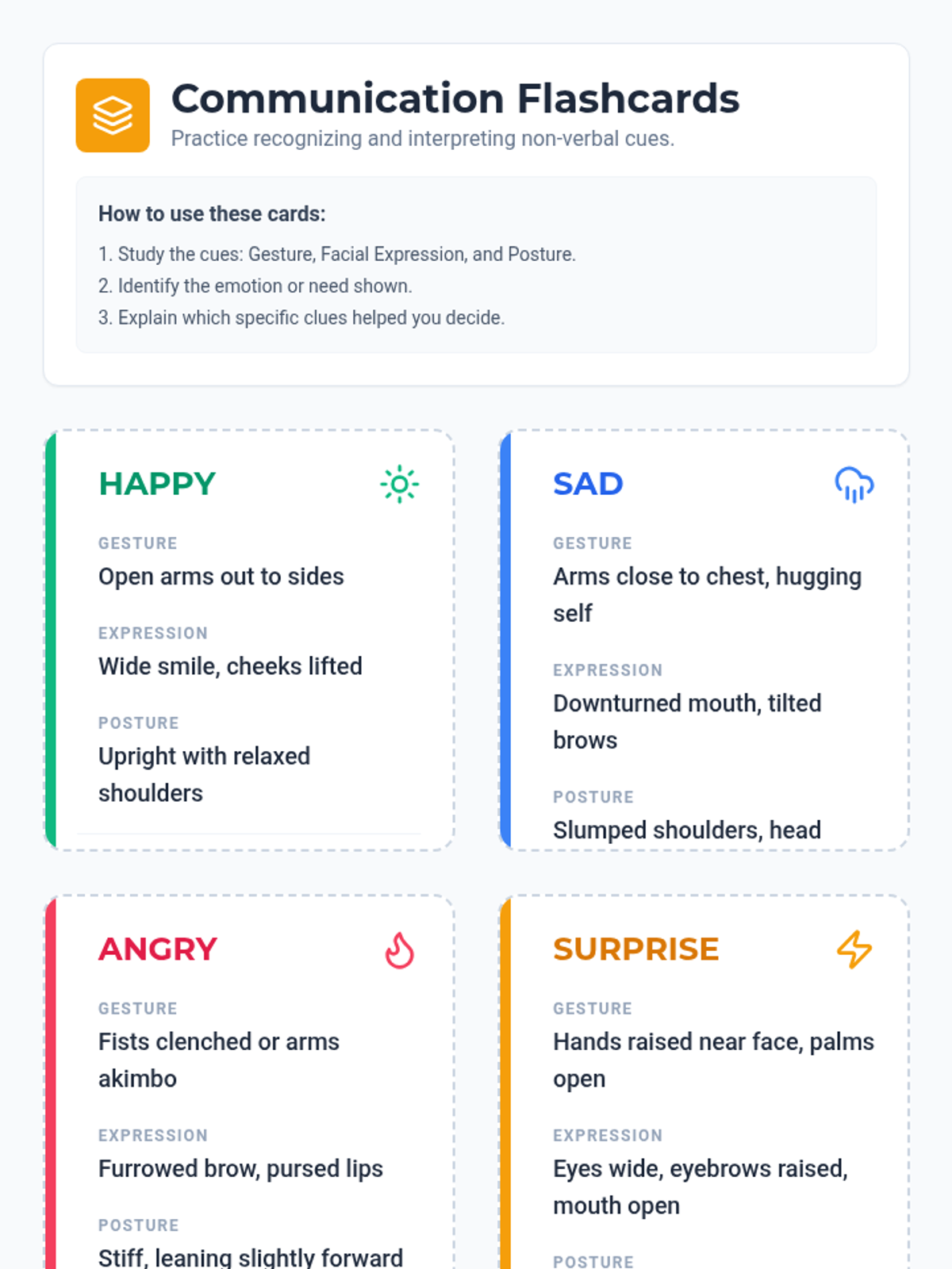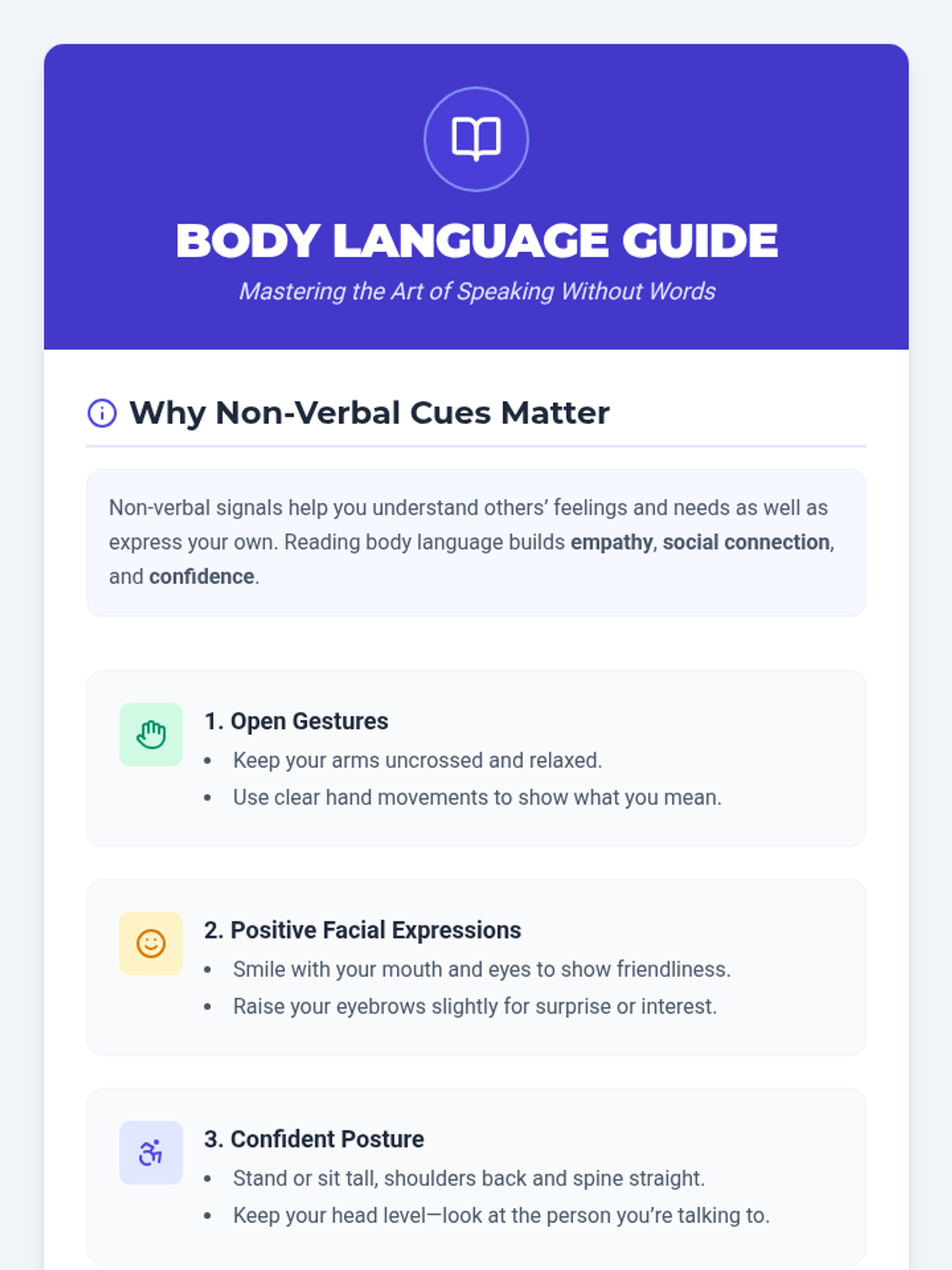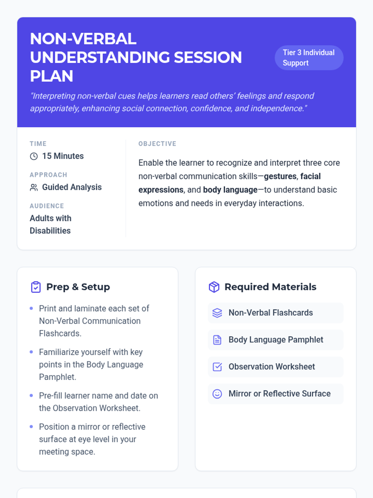 In this 15-minute Tier 3 session, learners with disabilities will explore key non-verbal communication skills—gestures, facial expressions, and body language—to enhance daily interactions and self-expression. This personalized lesson supports individual growth and confidence in everyday settings.