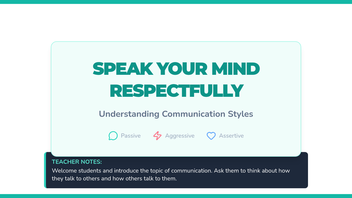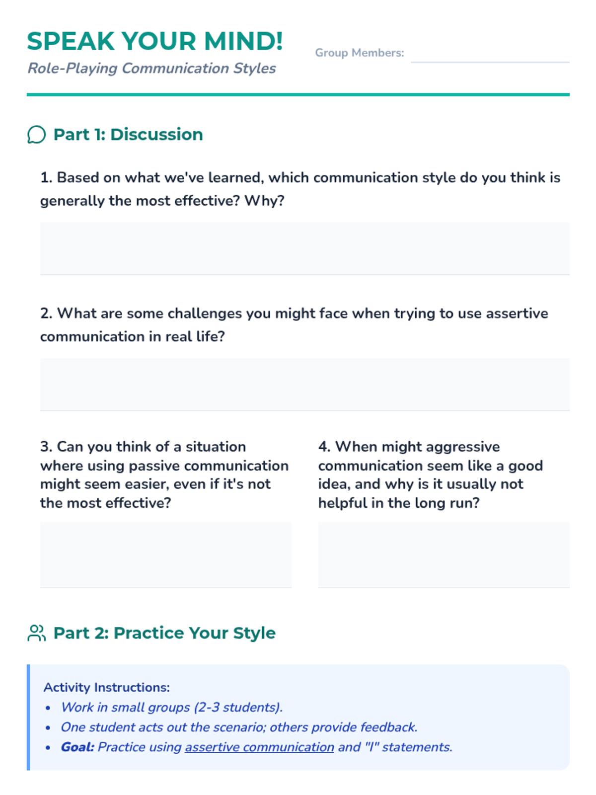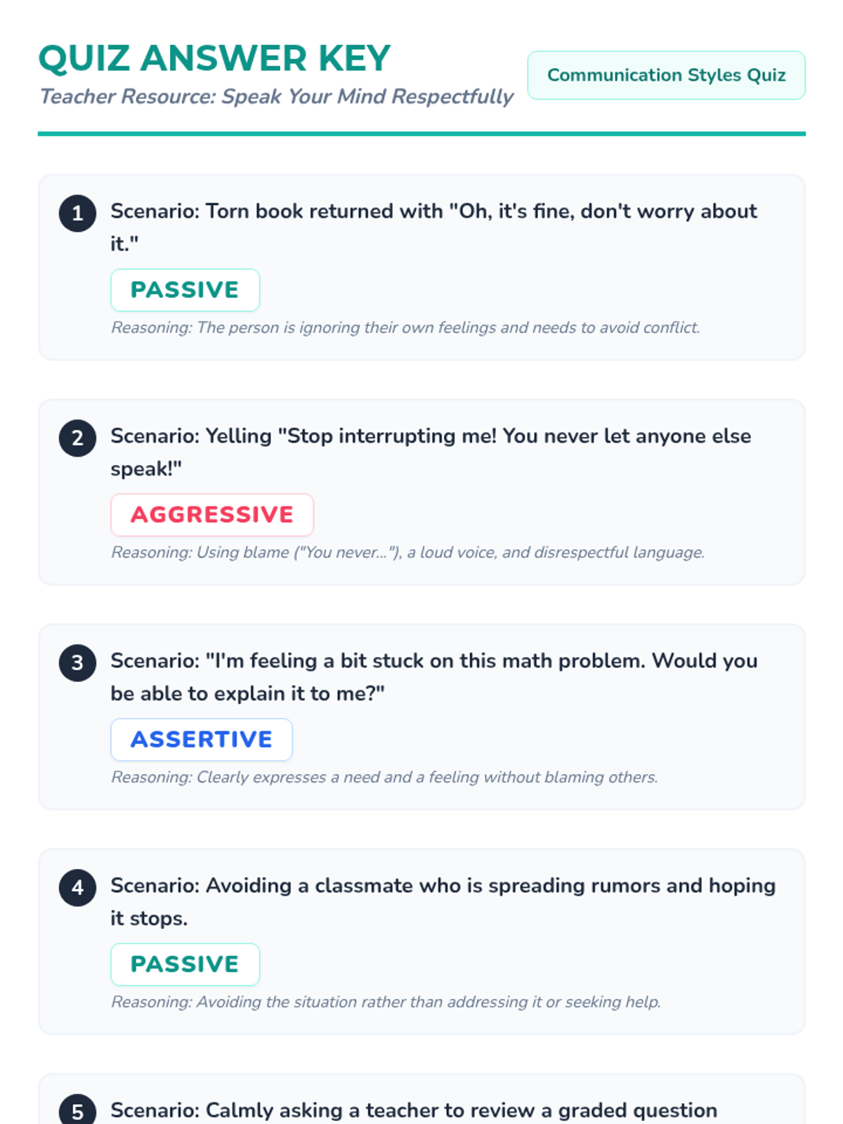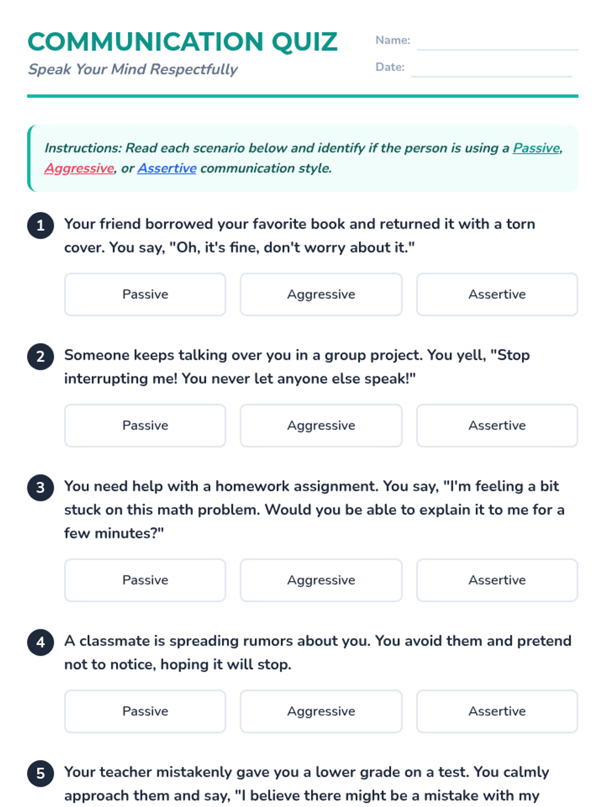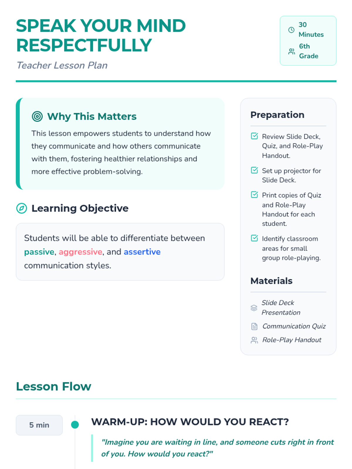 A 30-minute lesson for 6th-grade students to identify and practice passive, aggressive, and assertive communication styles through interactive discussion, a quiz, and role-playing scenarios.