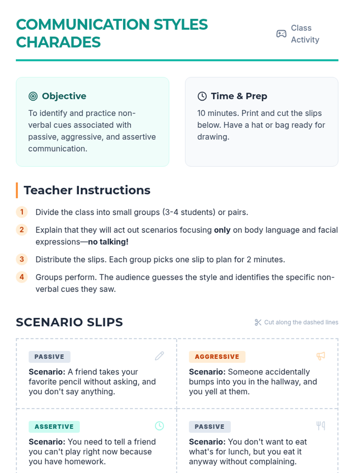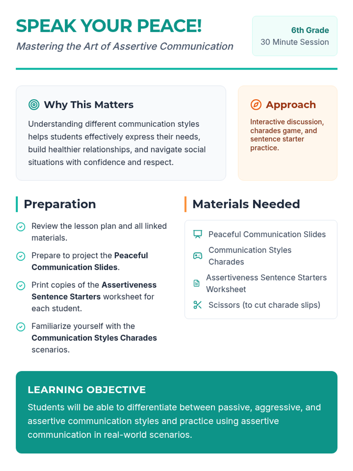 A 30-minute lesson for 6th-grade students on identifying and practicing passive, aggressive, and assertive communication styles to foster healthy relationships.