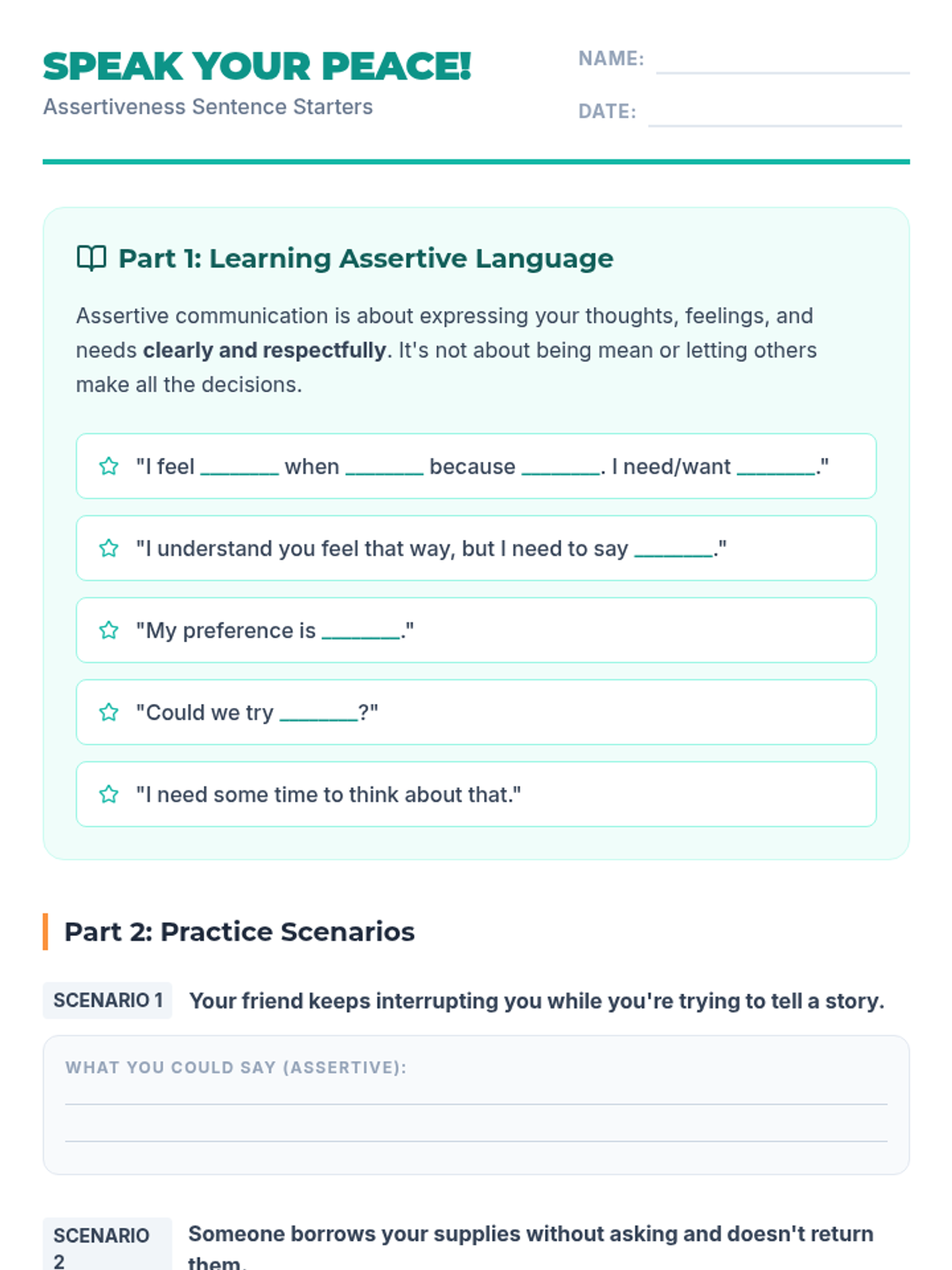 Develops assertive communication skills using I-Statements and empathetic listening techniques.