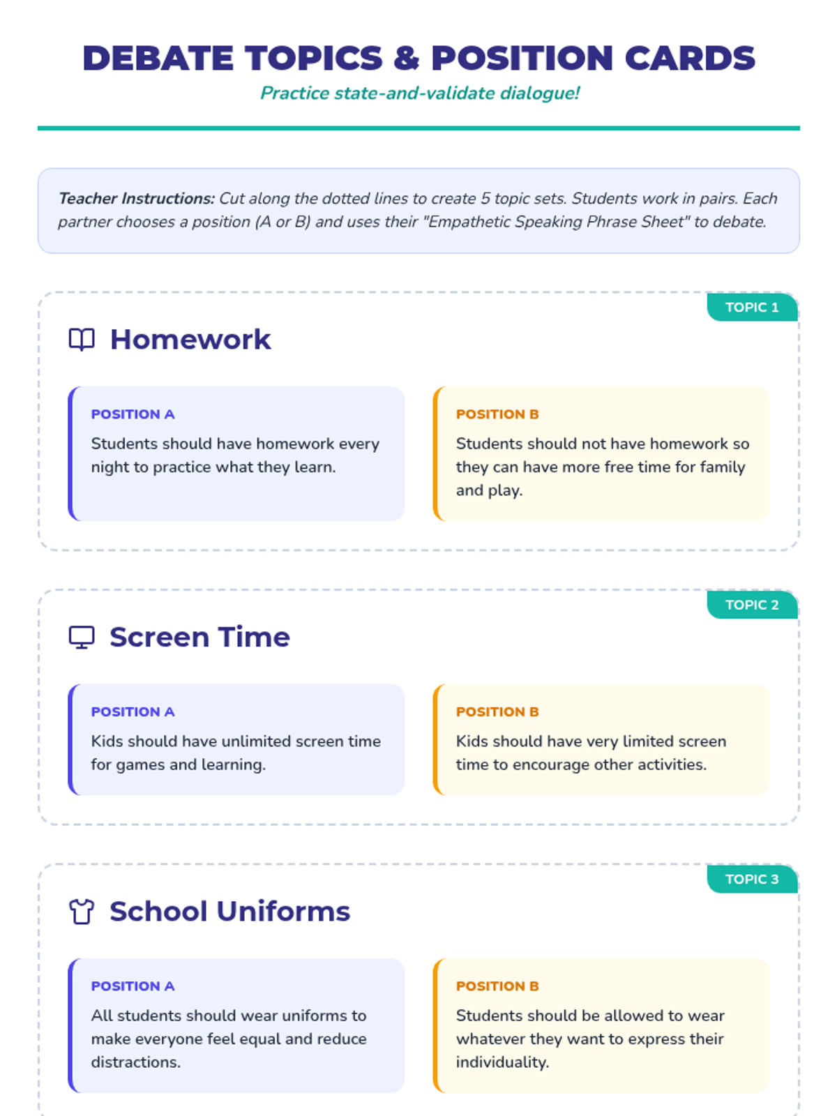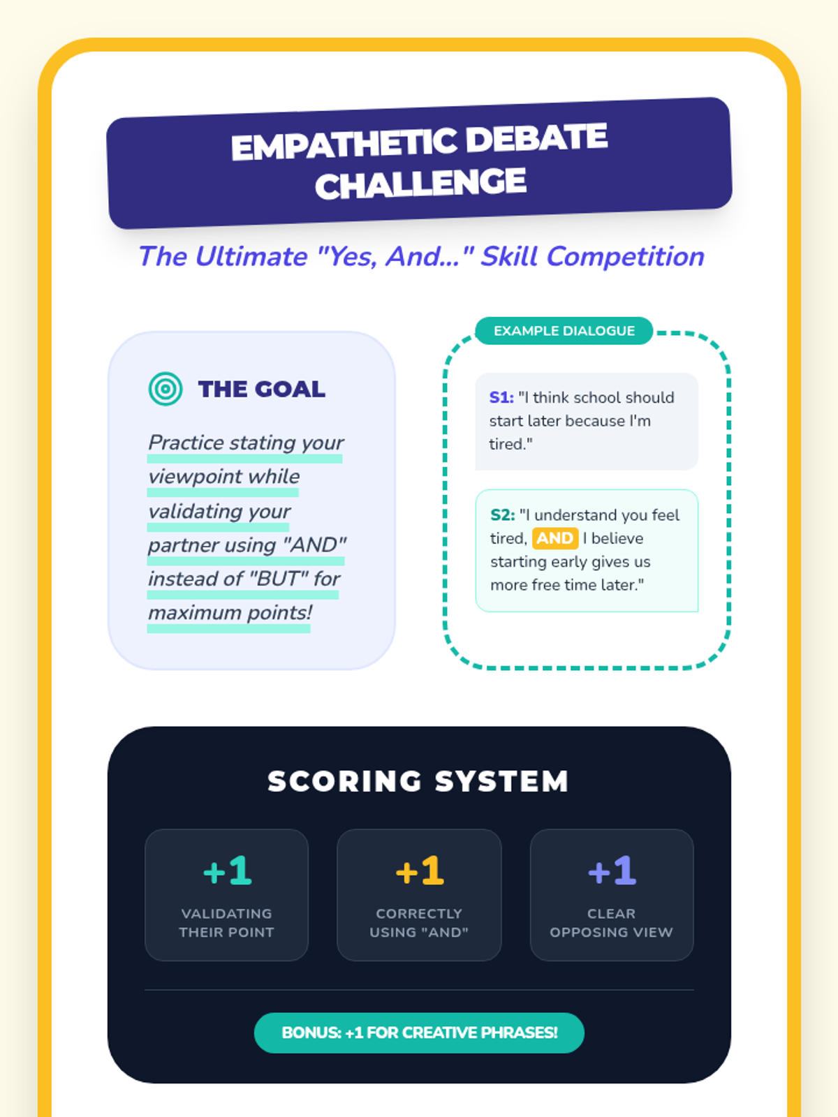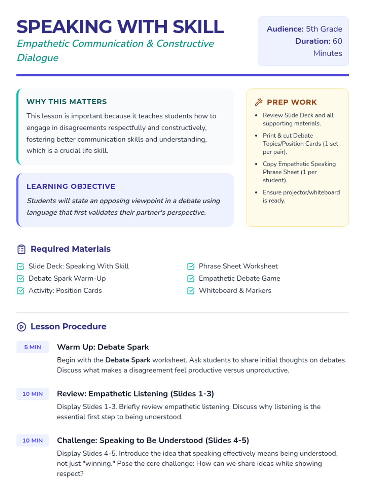 This lesson teaches 5th-grade students how to express opposing viewpoints in a debate while validating their partner's perspective. It emphasizes empathetic communication and provides practical strategies for constructive dialogue.