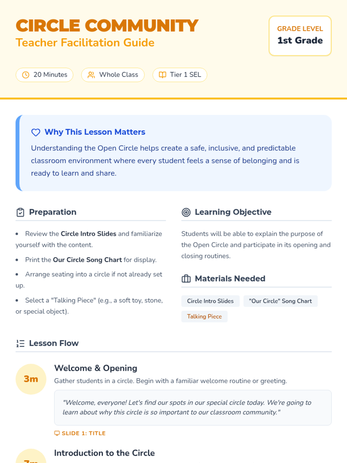 This introductory lesson helps 1st-grade students understand the purpose, routines, and heart of their classroom circle, fostering a sense of safety and community.