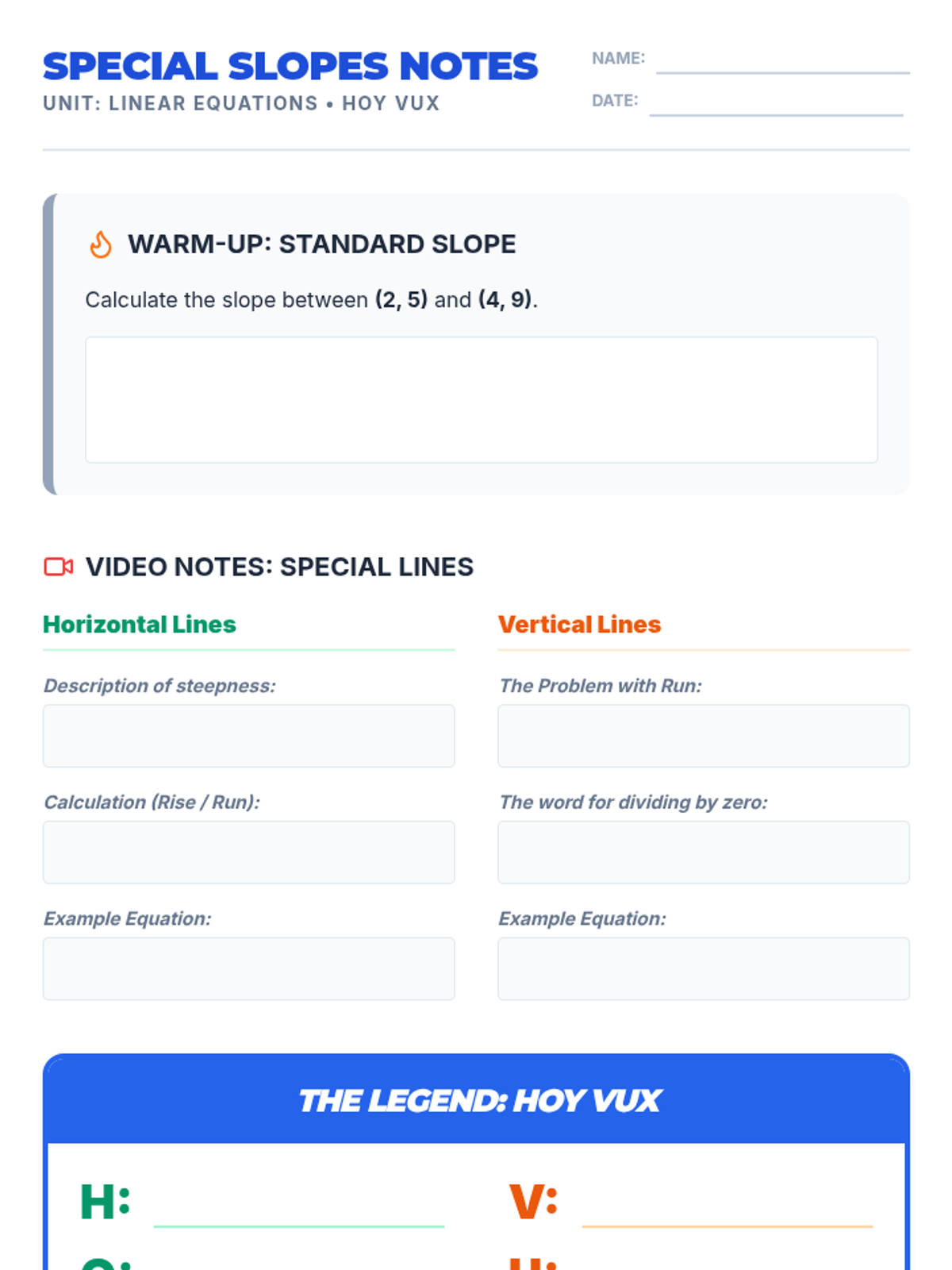 Students learn to identify and name horizontal and vertical lines using the HOY VUX mnemonic, supported by a video analysis and rapid-fire practice.