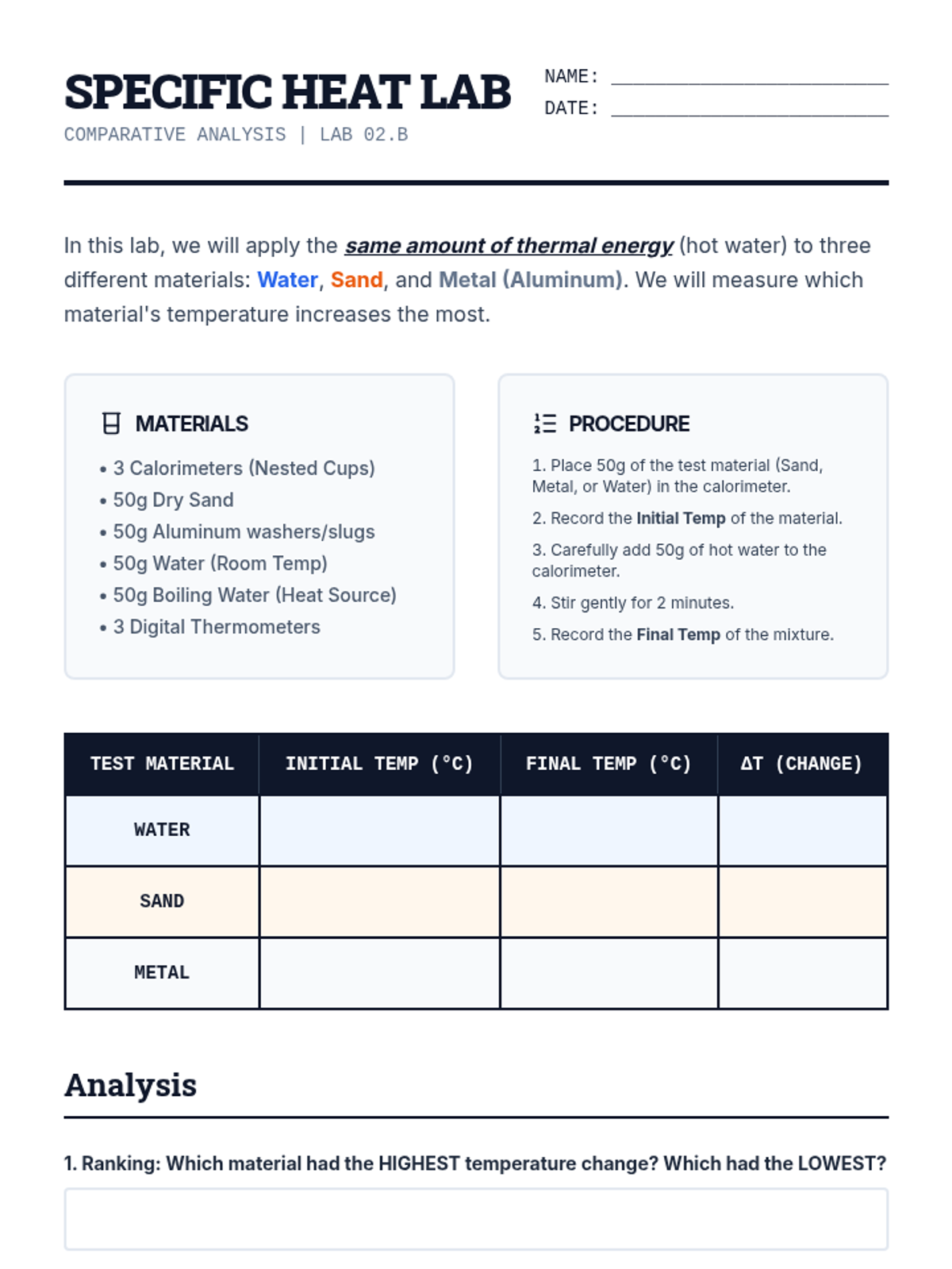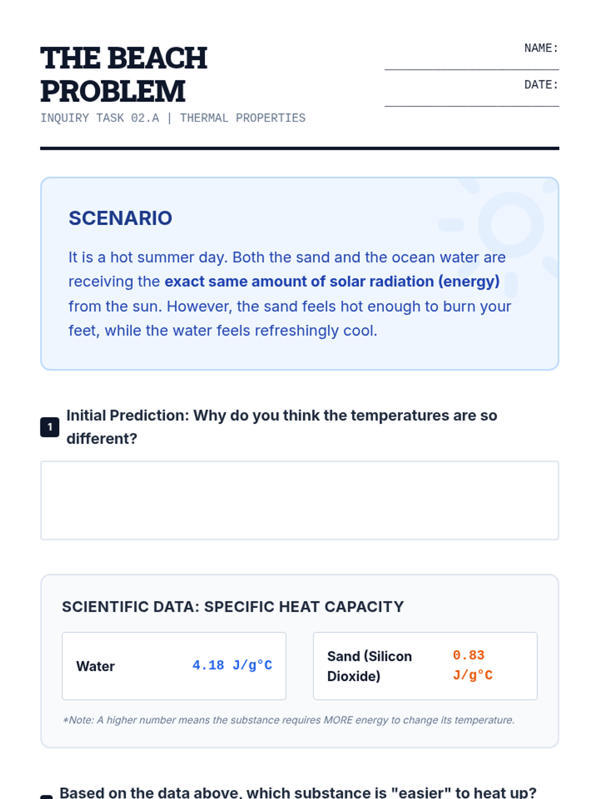 Investigating why different substances heat up at different rates by comparing water, sand, and metal.