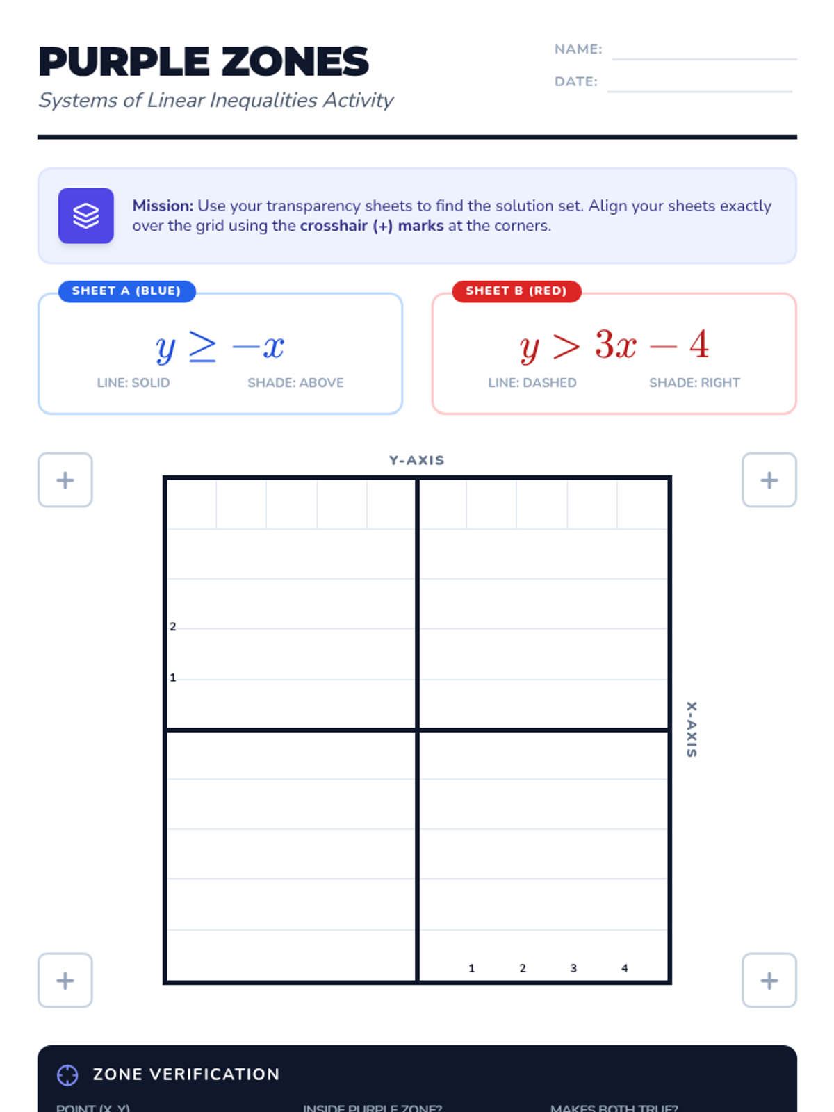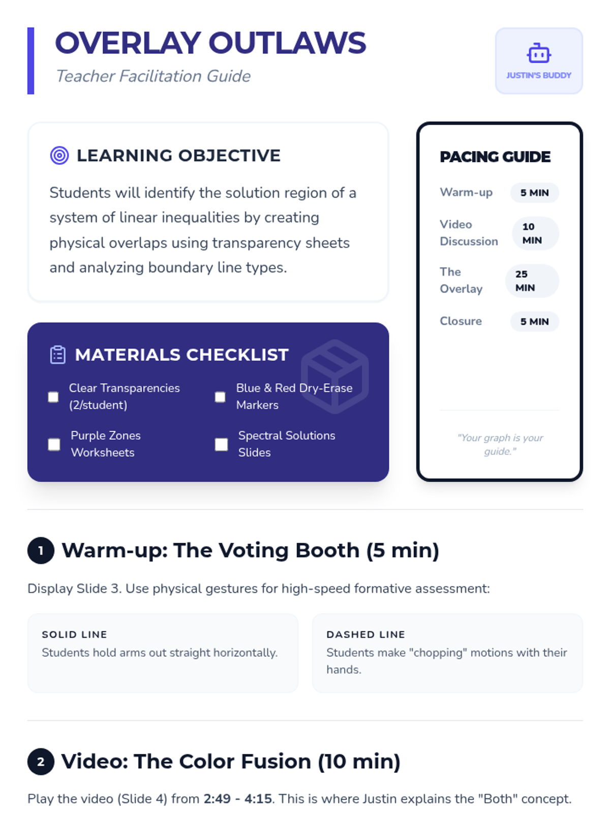 Students will master systems of linear inequalities by physically overlapping colored transparencies to discover the 'purple' solution region. The lesson includes interactive slides, a hands-on transparency activity, and a detailed teacher facilitation guide.