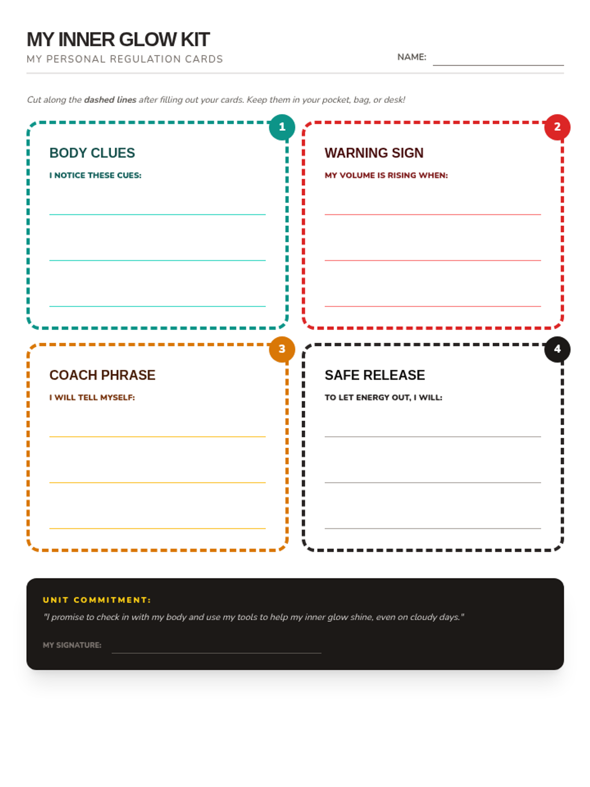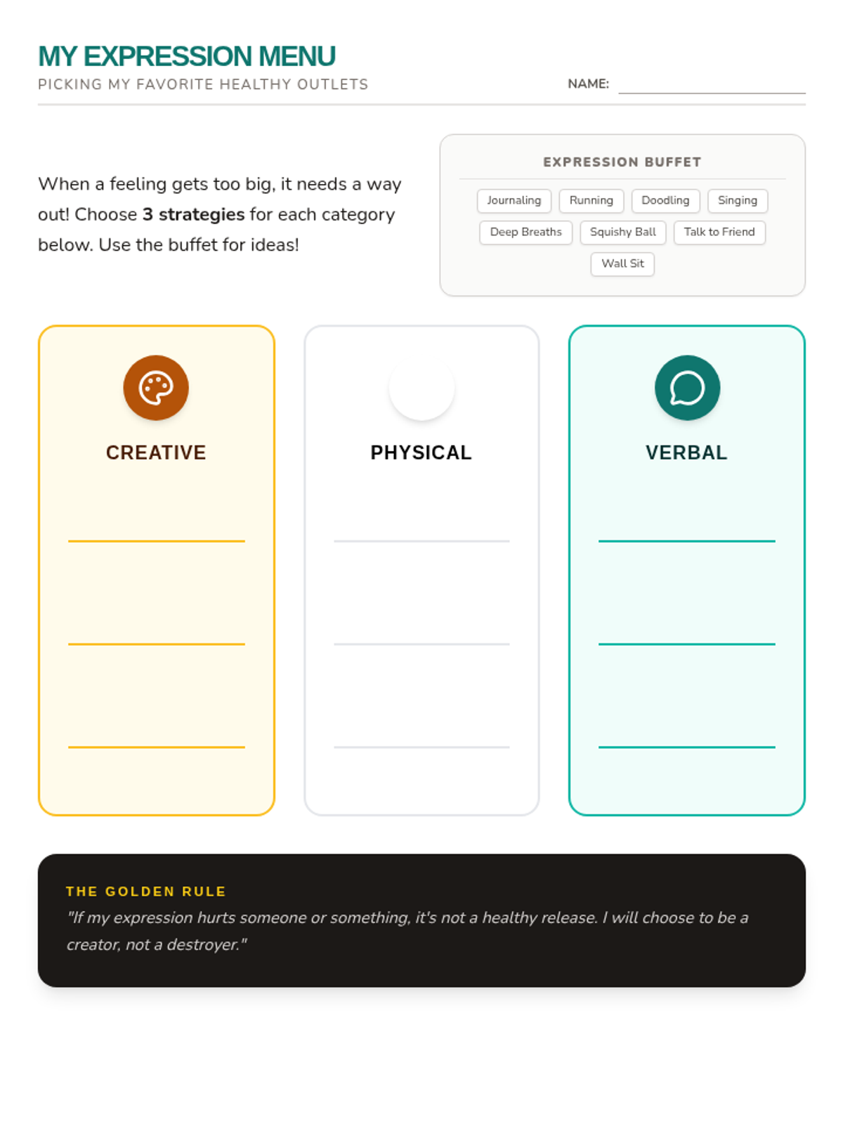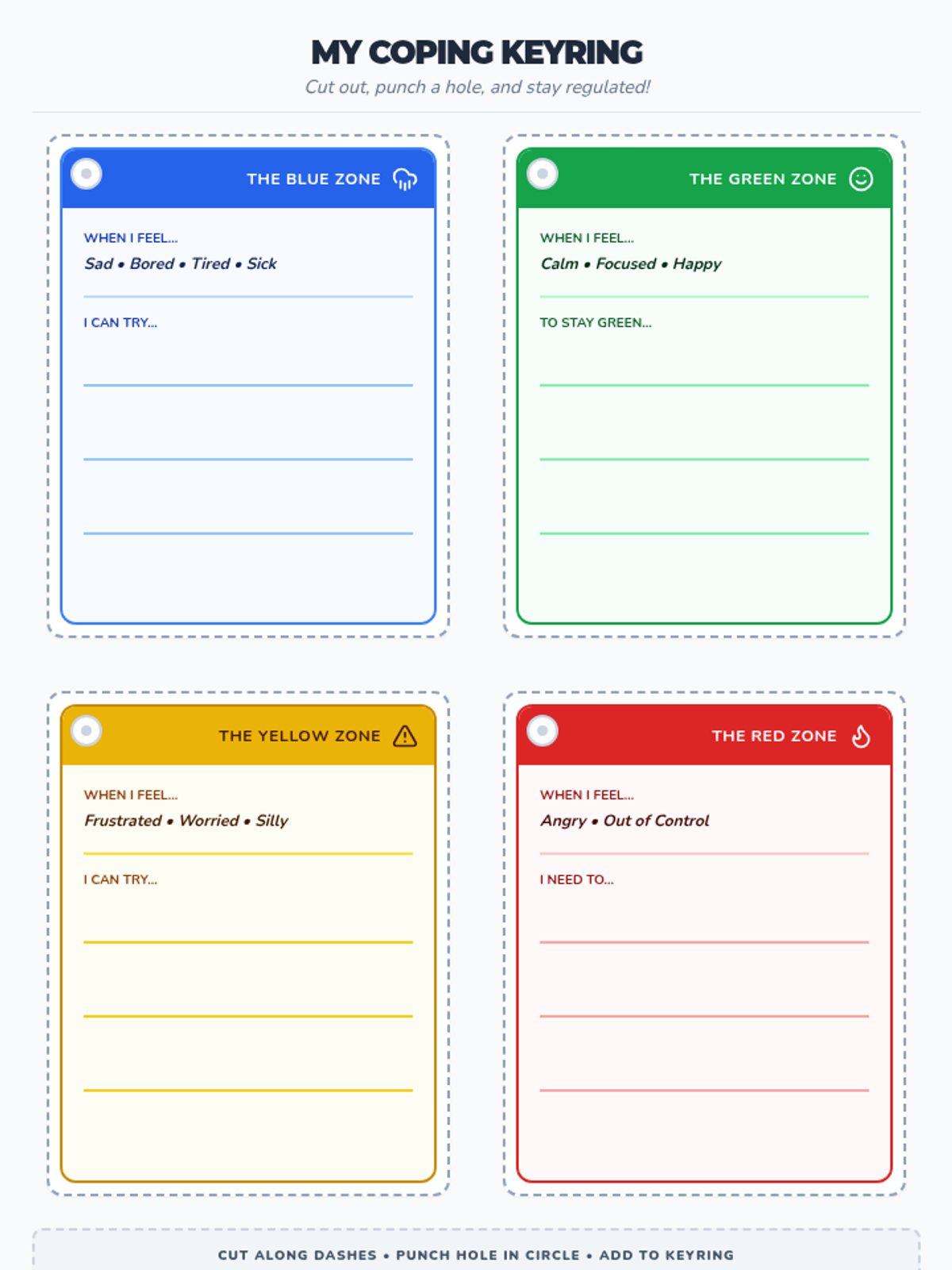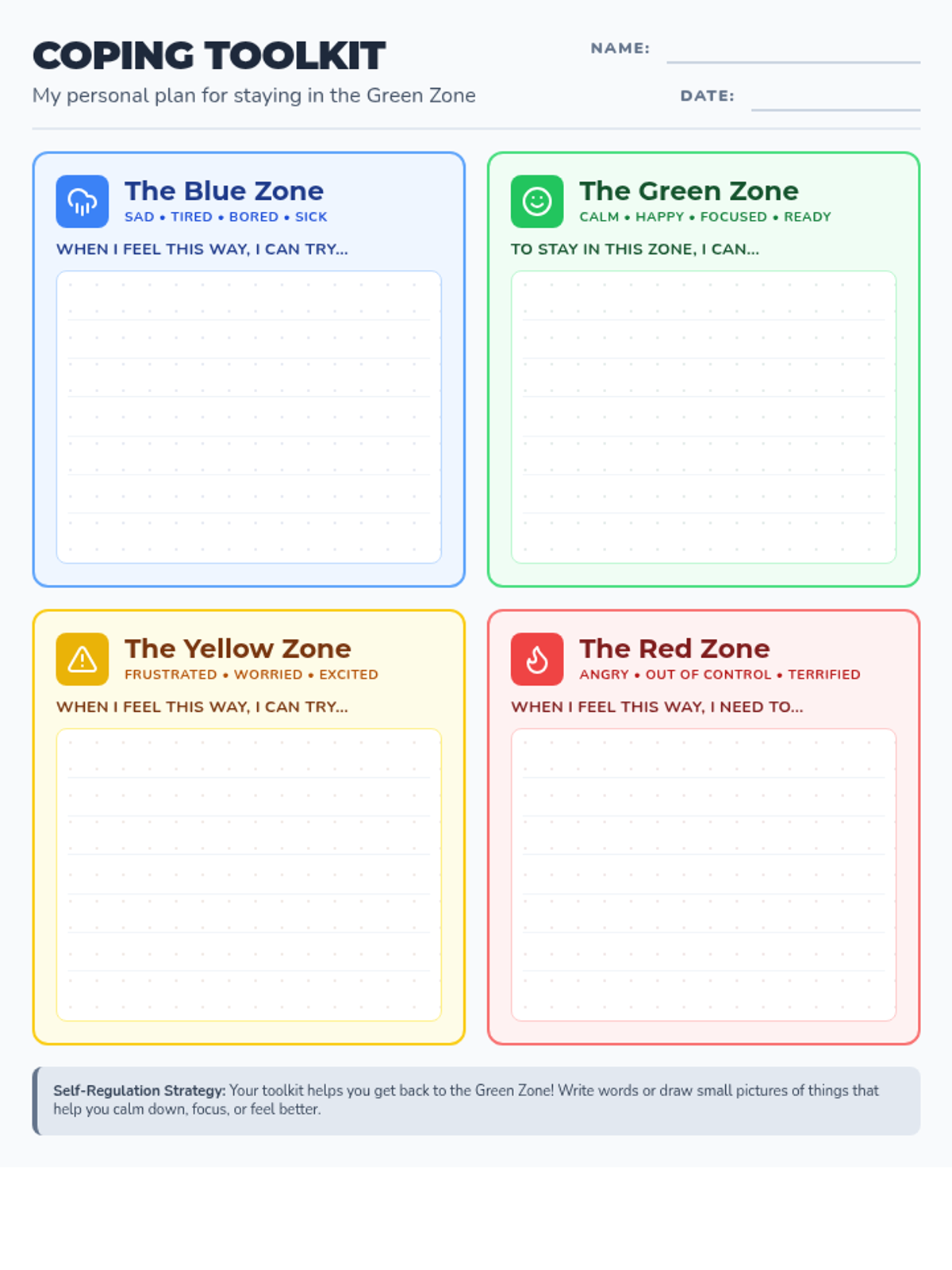 A collection of visual templates for students to identify emotional states and build personalized coping strategies based on the Zones of Regulation framework.