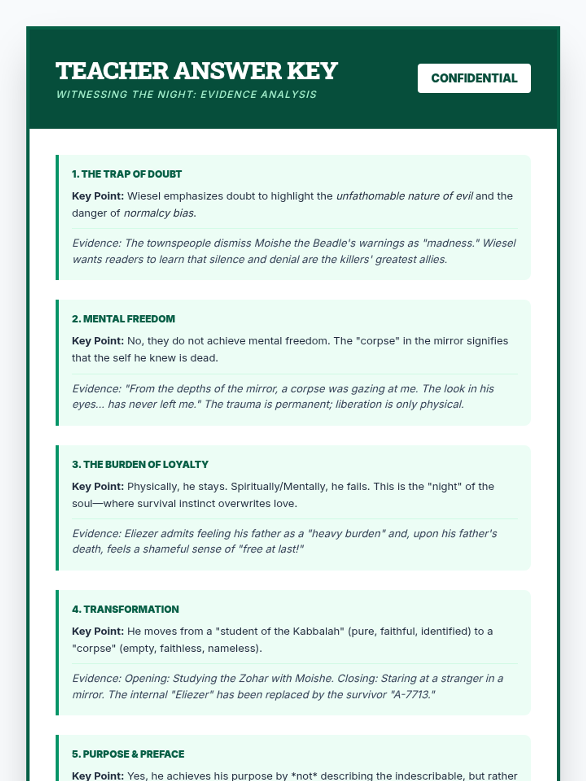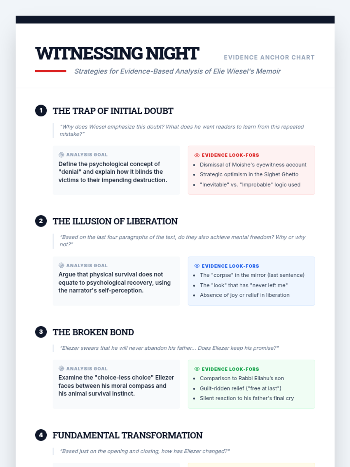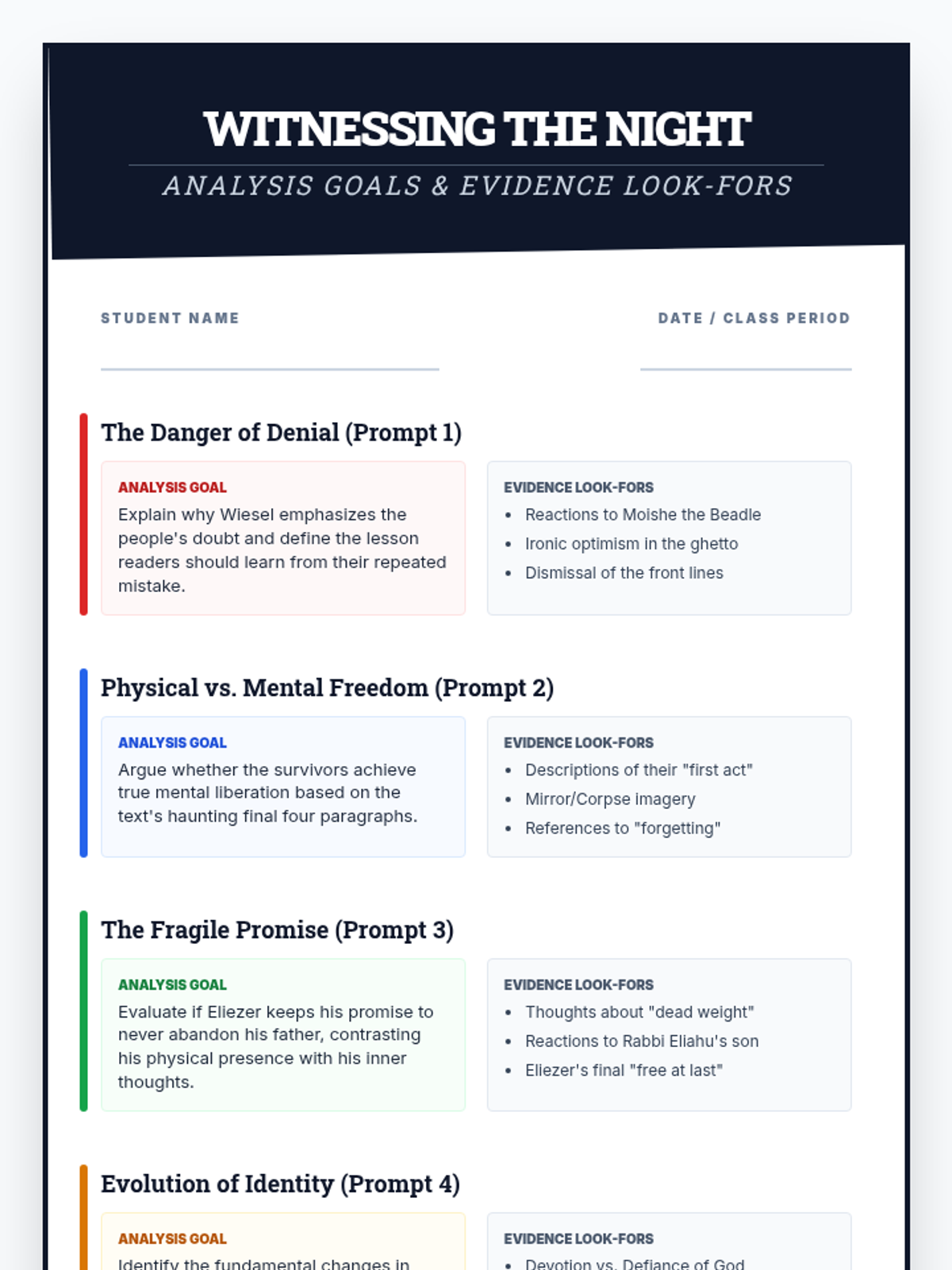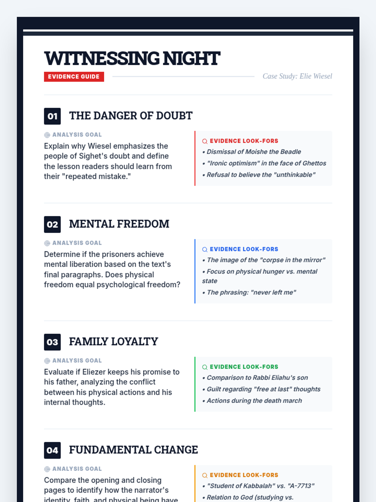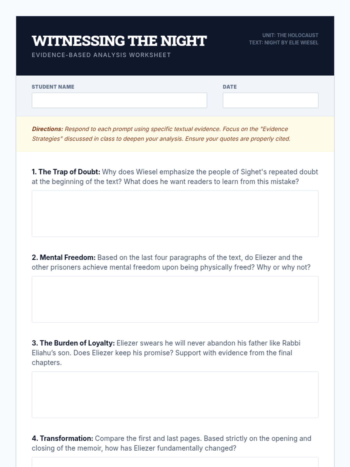 This lesson explores Elie Wiesel's Night, focusing on evidence-based analysis of key themes including transformation, faith, and the psychological impact of the Holocaust.