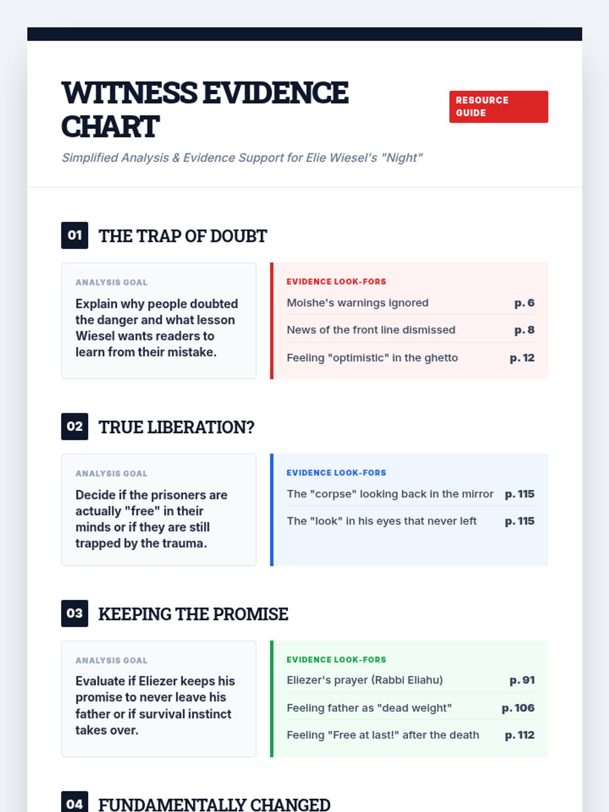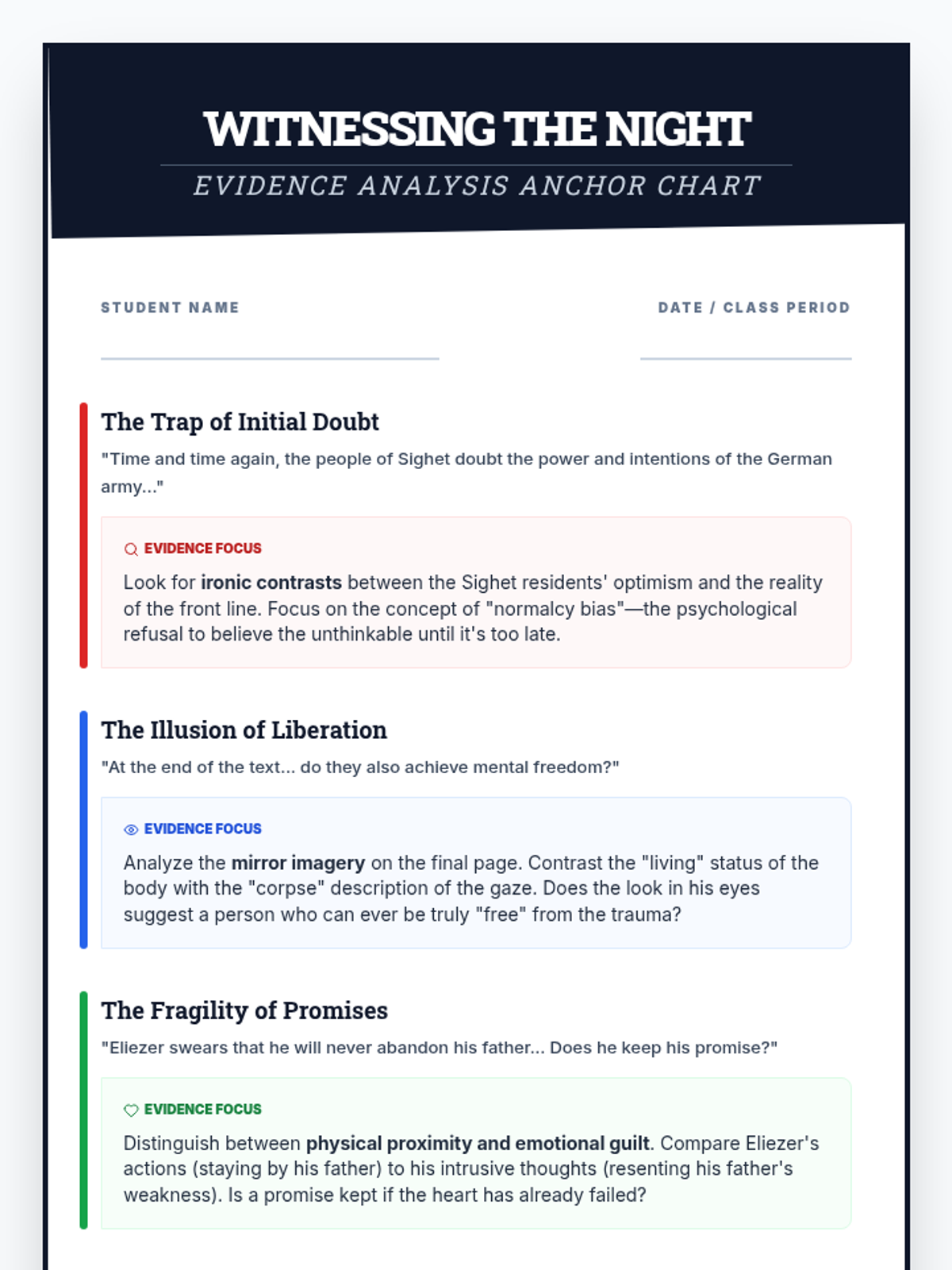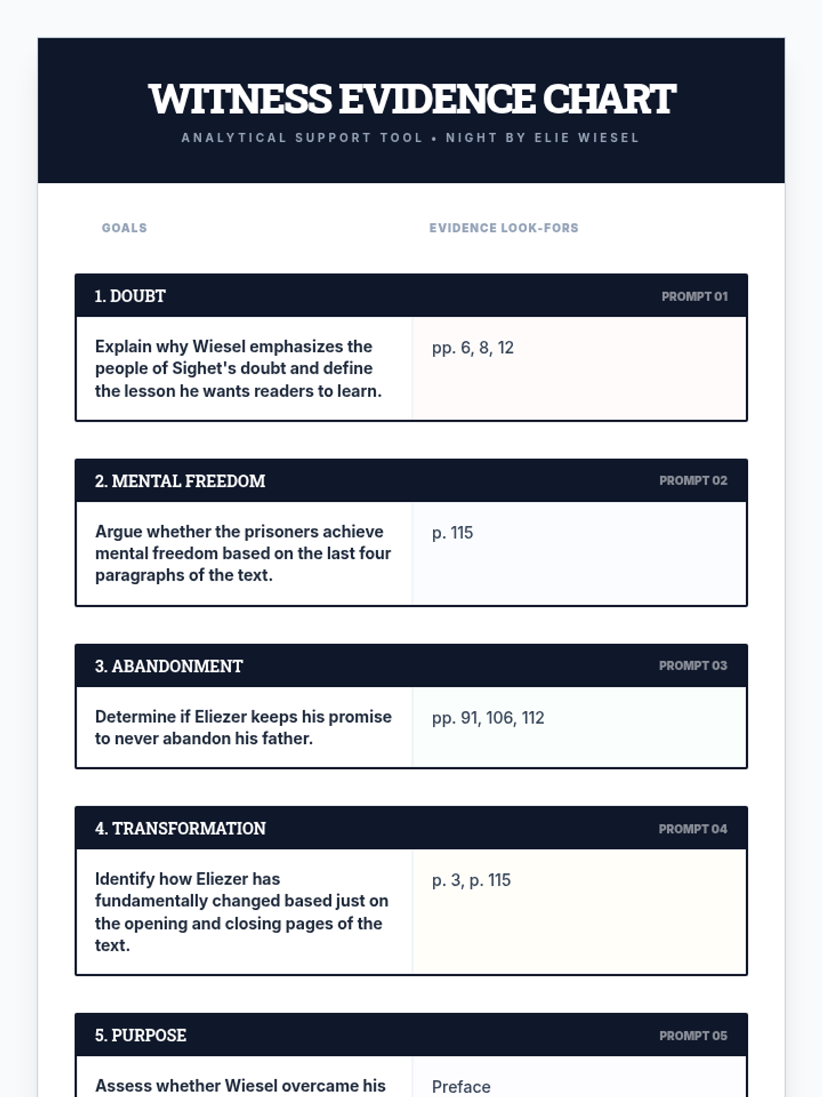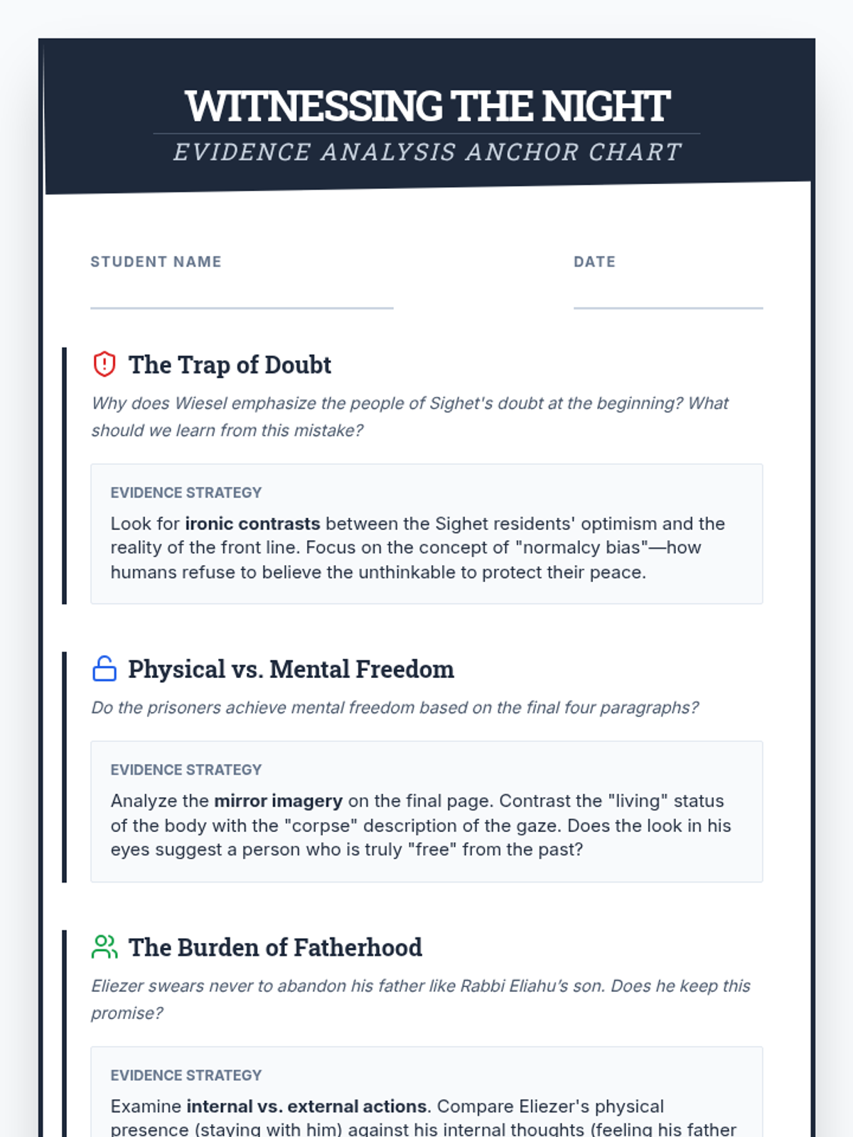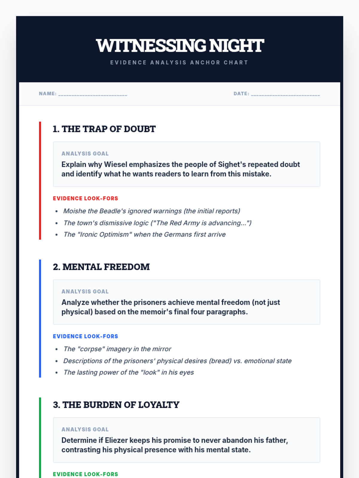 This lesson explores Elie Wiesel's Night, focusing on evidence-based analysis of key themes including transformation, faith, and the psychological impact of the Holocaust.